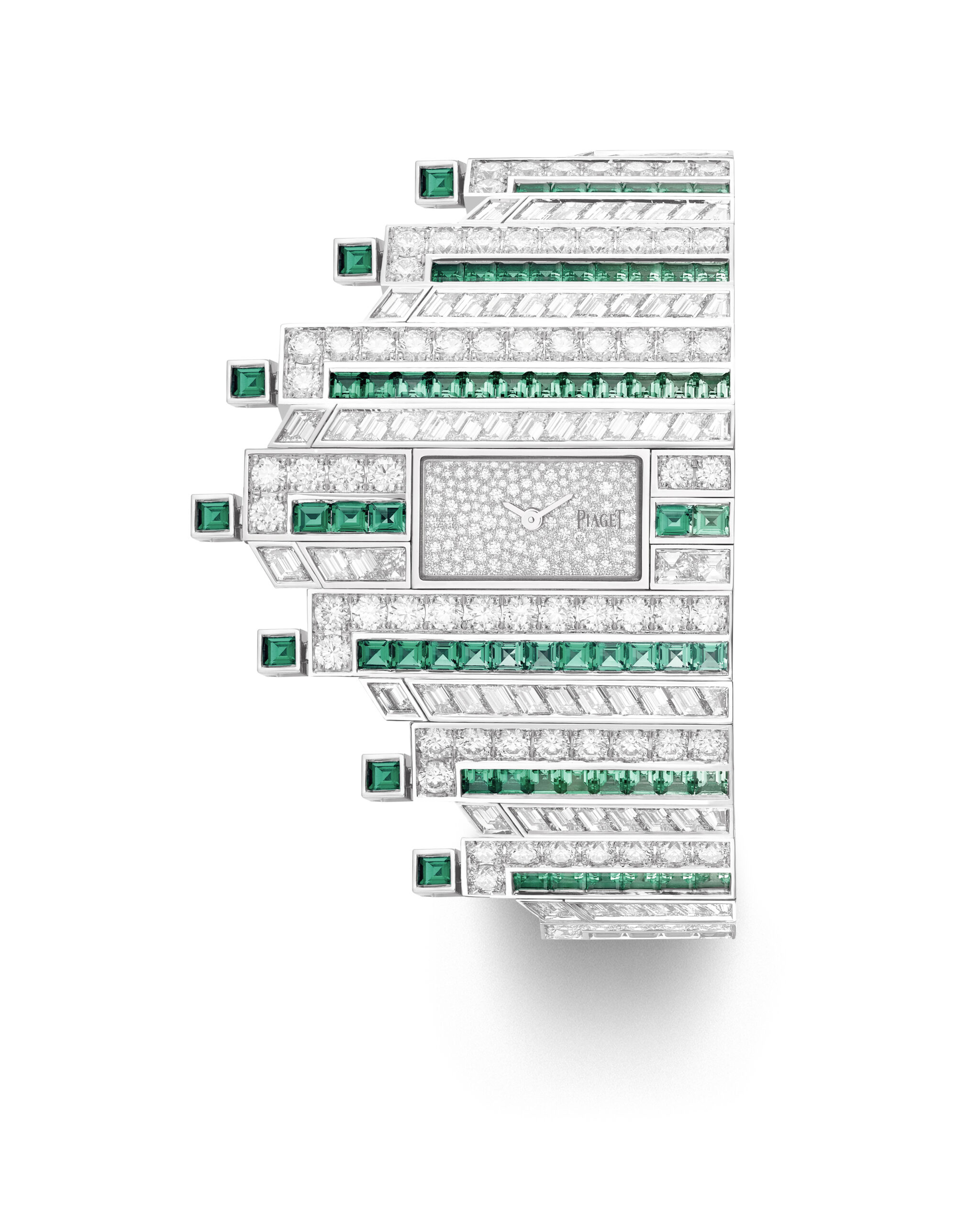 Sous les doigts experts des maîtres artisans de Piaget, ces pierres colorées forment de fascinantes volutes de lumière, créées par un mélange de diamants tailles baguette et brillant. Ces « halos » particulièrement éblouissants ont été rendus possibles en taillant chaque pierre sur mesure afin qu’elle s’insère à la perfection. Les joailliers ont également façonné l’or de manière à ce que la lumière traverse chaque pierre et se diffuse à chaque mouvement.