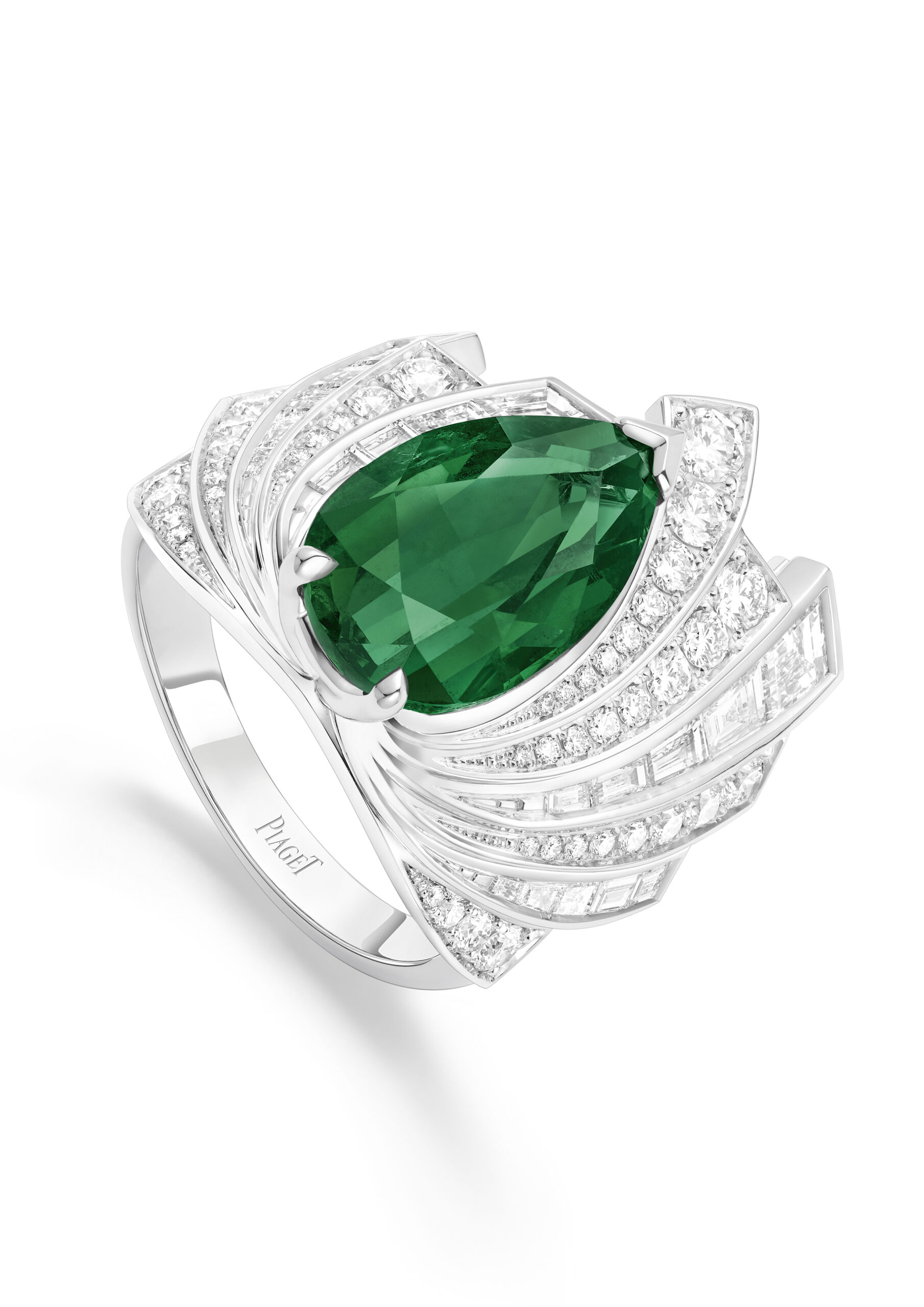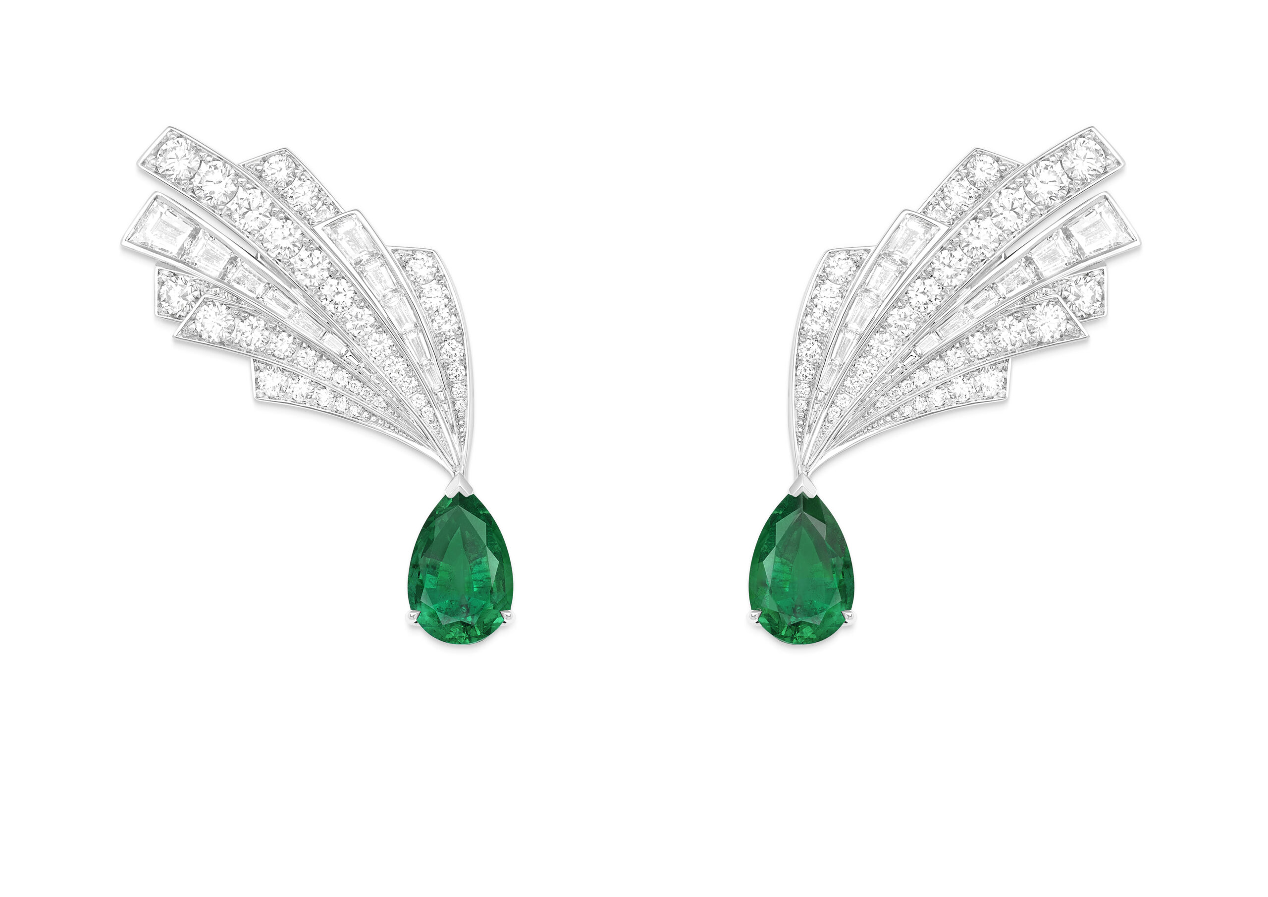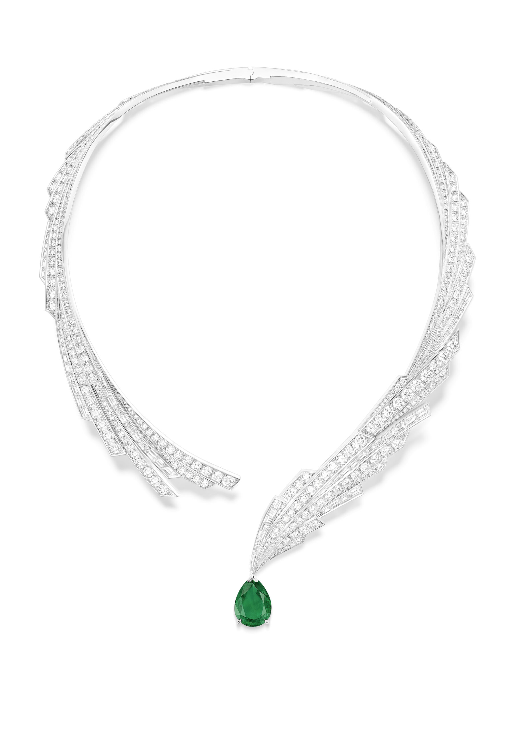 Les pierres sélectionnées par la Maison sont appréciées pour leur couleur et leur taille. Il a fallu plus de deux ans pour acquérir les émeraudes de Zambie qui ornent les créations Voluptuous Borealis. La plus difficile à trouver a été l’émeraude taille poire du collier, une pierre bleu vert d’une pureté extrême qui rappelle les célèbres pierres de Colombie. La position excentrée de cette merveille de 10,29 carats crée un dynamisme que l’on retrouve sur les boucles d’oreilles, les manchettes d’oreilles et la montre manchette. La bague asymétrique est quant à elle ornée d’une émeraude centrale de 5,31 carats de qualité similaire.