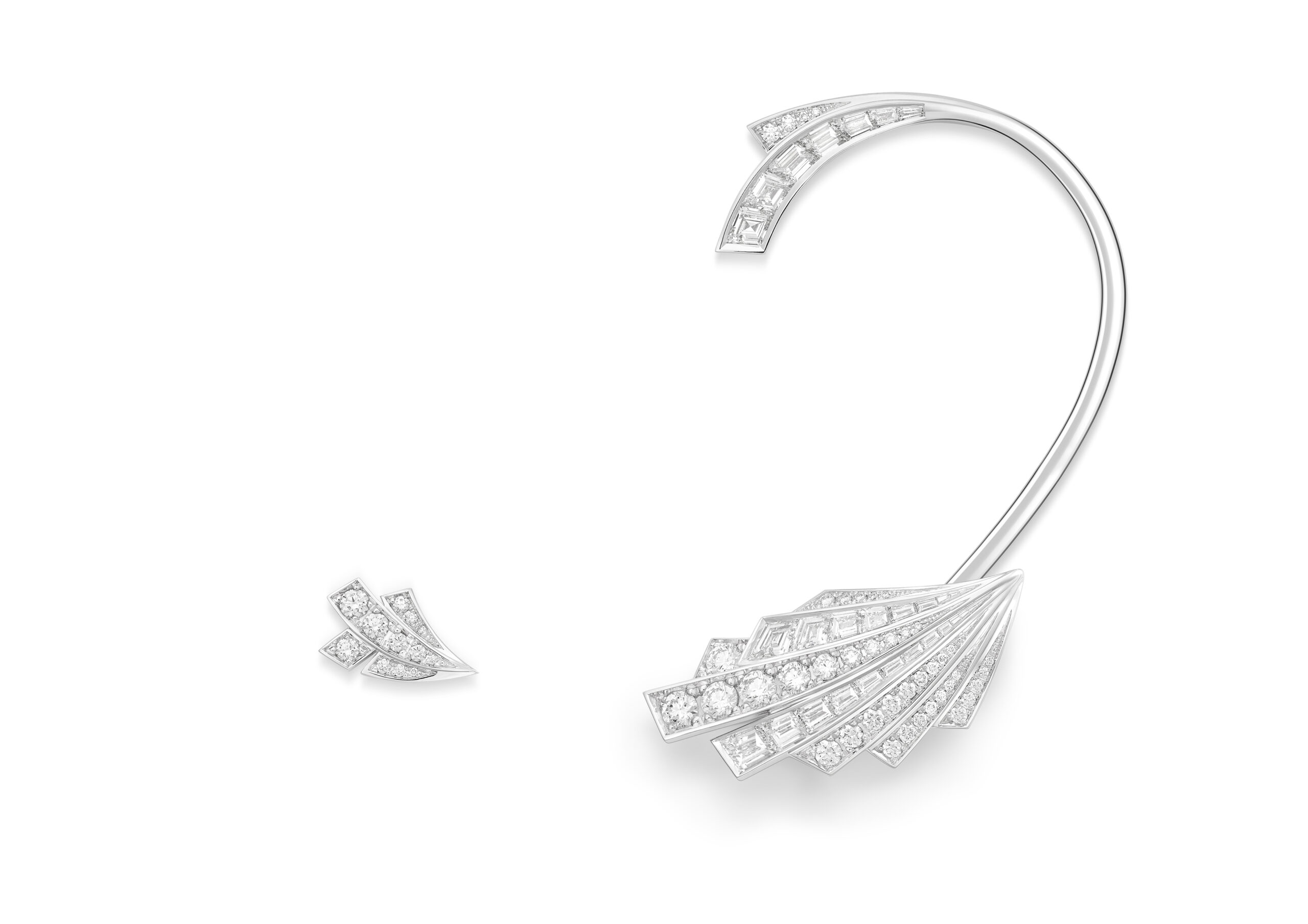 Pour réaliser un parfait dégradé de bleu, les artisans joailliers ont utilisé les saphirs tels des artistes peintres travaillant la gouache, les pierres affirmant leur nature étincelante. Il a fallu plus d’un an de recherche à notre laboratoire de gemmologie pour composer un ensemble de cristaux bleus de trois tonalités différentes et de mêmes pureté et intensité. Façonnées en taille marquise et, plus original, en taille triangle, ces gemmes se veulent une allégorie empreinte de glamour cosmique comme en témoigne la bague Celestial Ballet aux allures de comète. Cette création fascinante est conçue pour être portée à la perpendiculaire, afin que son élégant motif s’étire sur deux doigts. Un dégradé de saphirs et de diamants forme une traînée étincelante derrière la pierre centrale du Sri Lanka de 2,71 carats, imitant le spectacle d’une pluie de Lyrides. La parure Celestial Ballet semble capturer toutes les facettes et toute la splendeur du ciel, bouquet final d’une nuit constellée de magie.