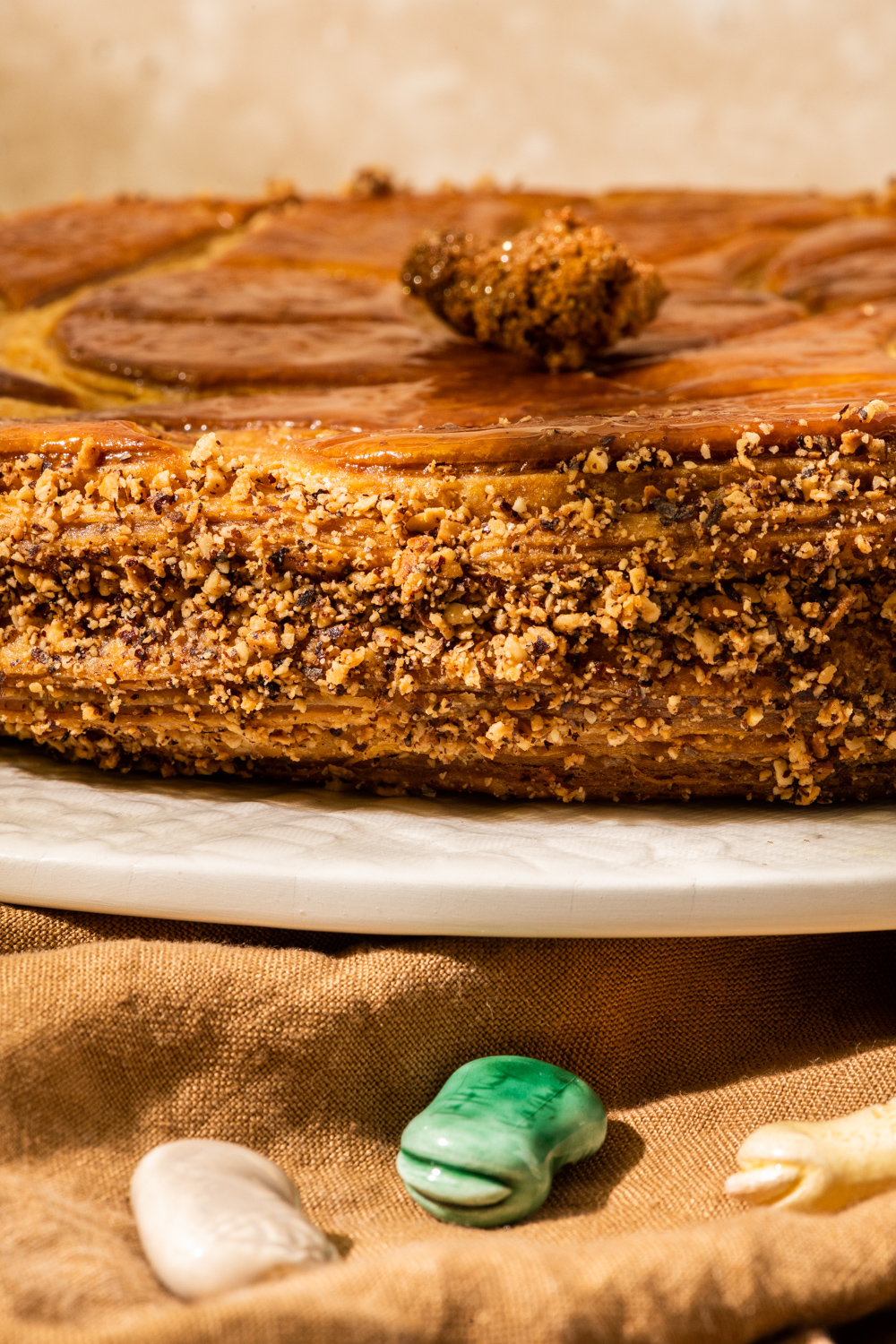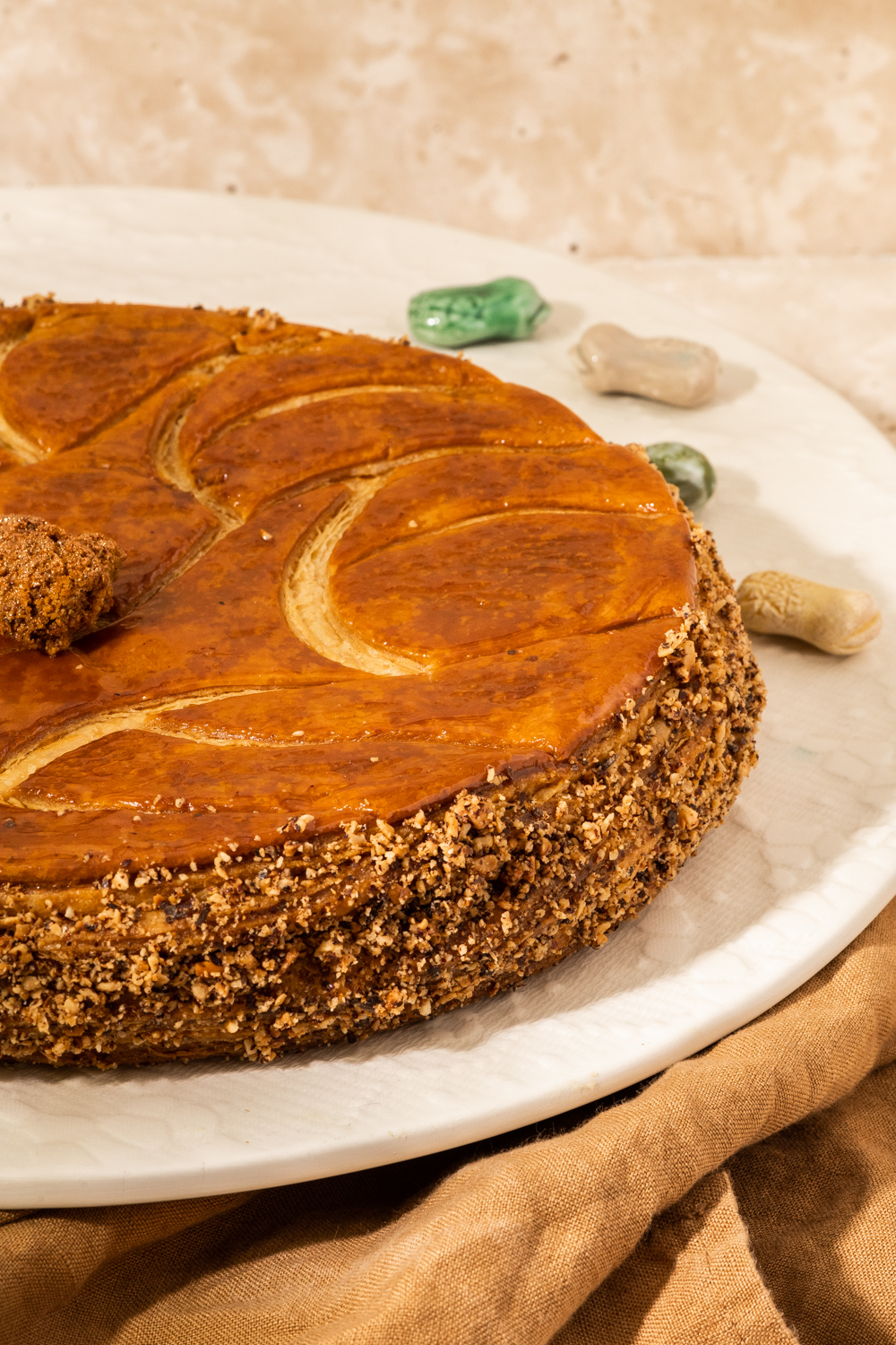 Des noisettes concassées et torréfiées viennent encercler les bords de la galette, apportant du croustillant jusqu’à la dernière bouchée.