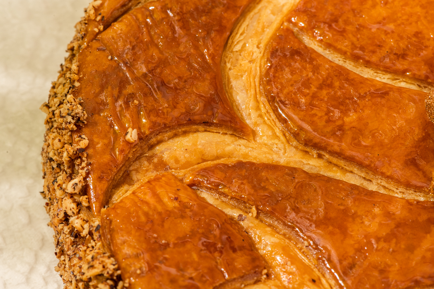 Garnie d’une généreuse couche de frangipane et d’un feuilletage doré à souhait, Jeffrey Cagnes présente une galette dont le décor sera unique et propre à chaque produit. Une manière de rendre hommage au geste du pâtissier qui lui est si cher.