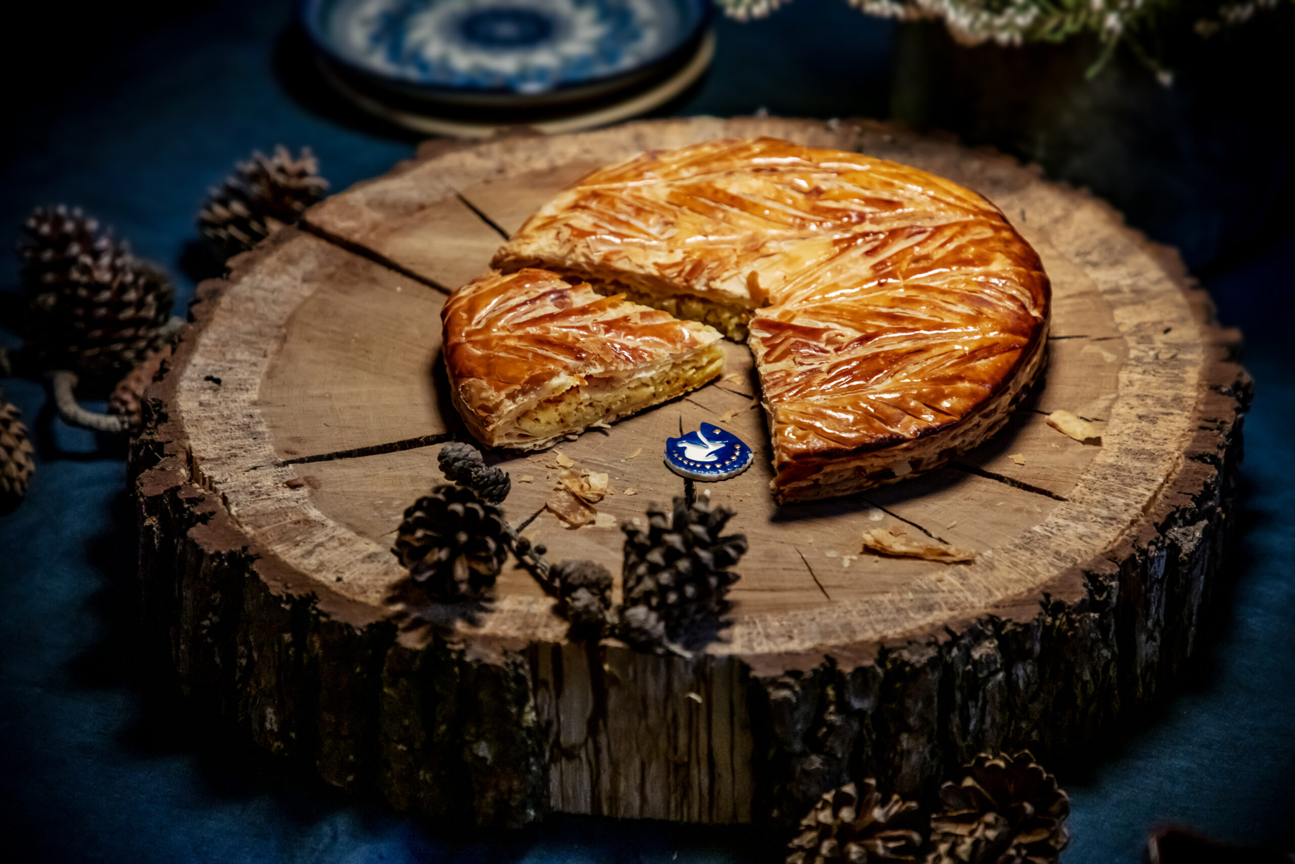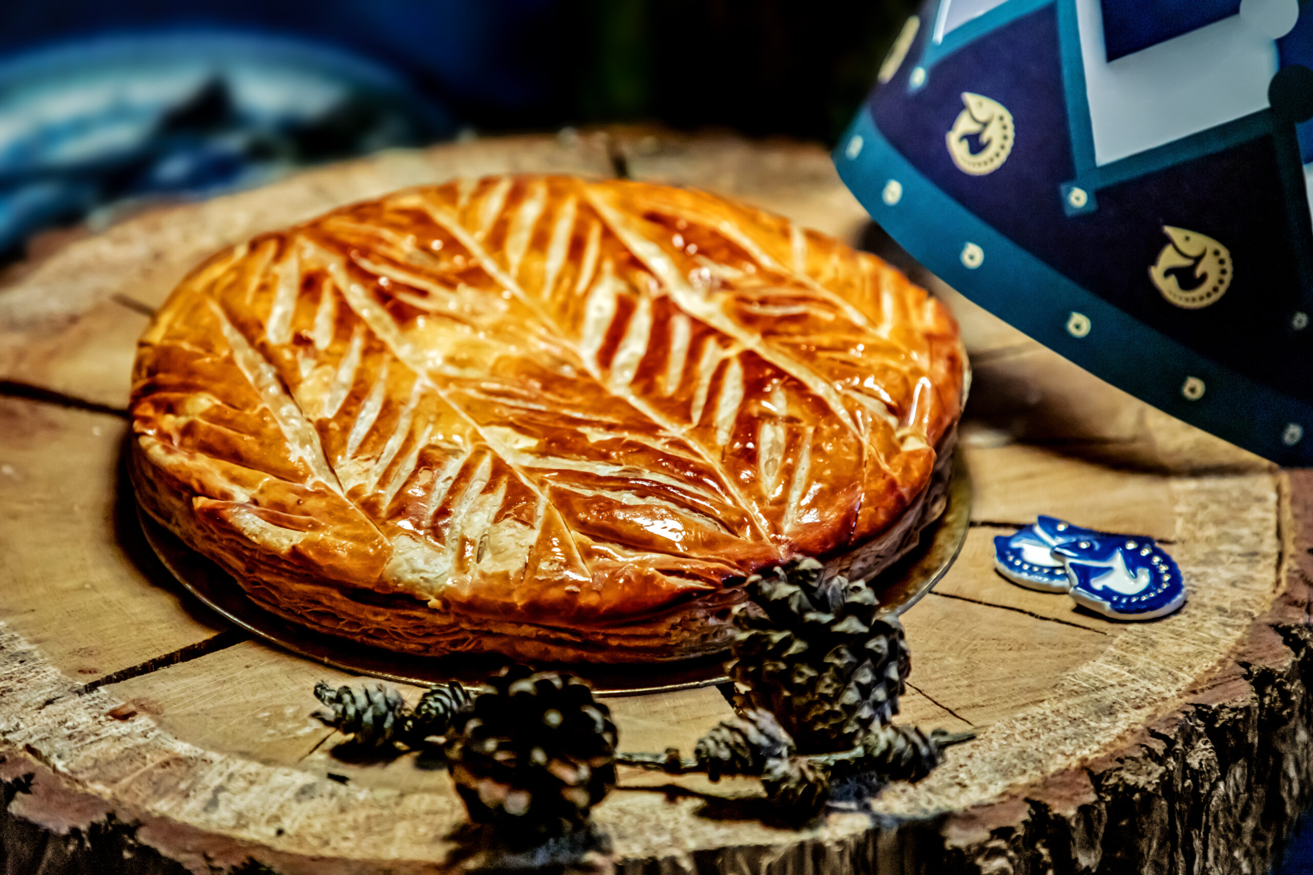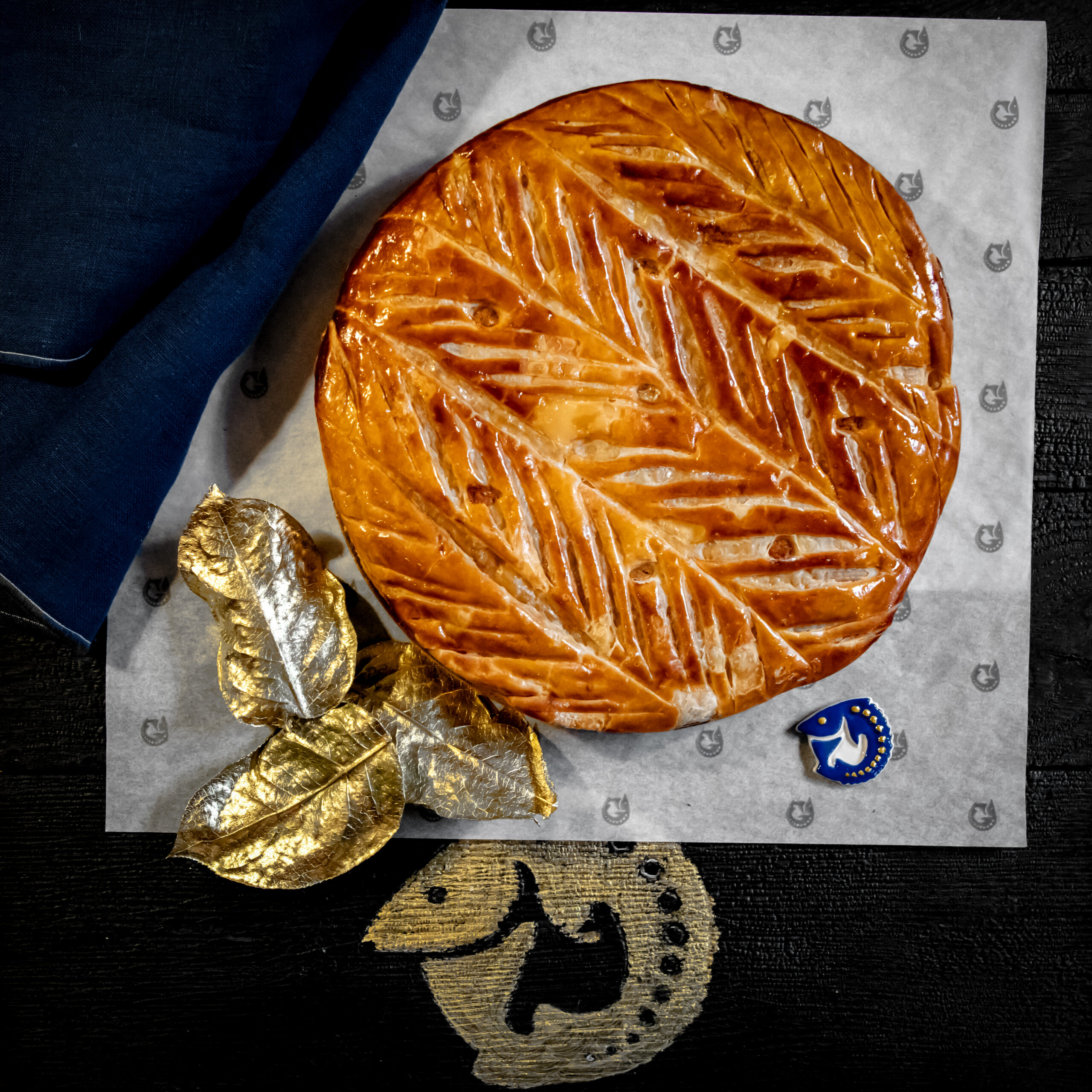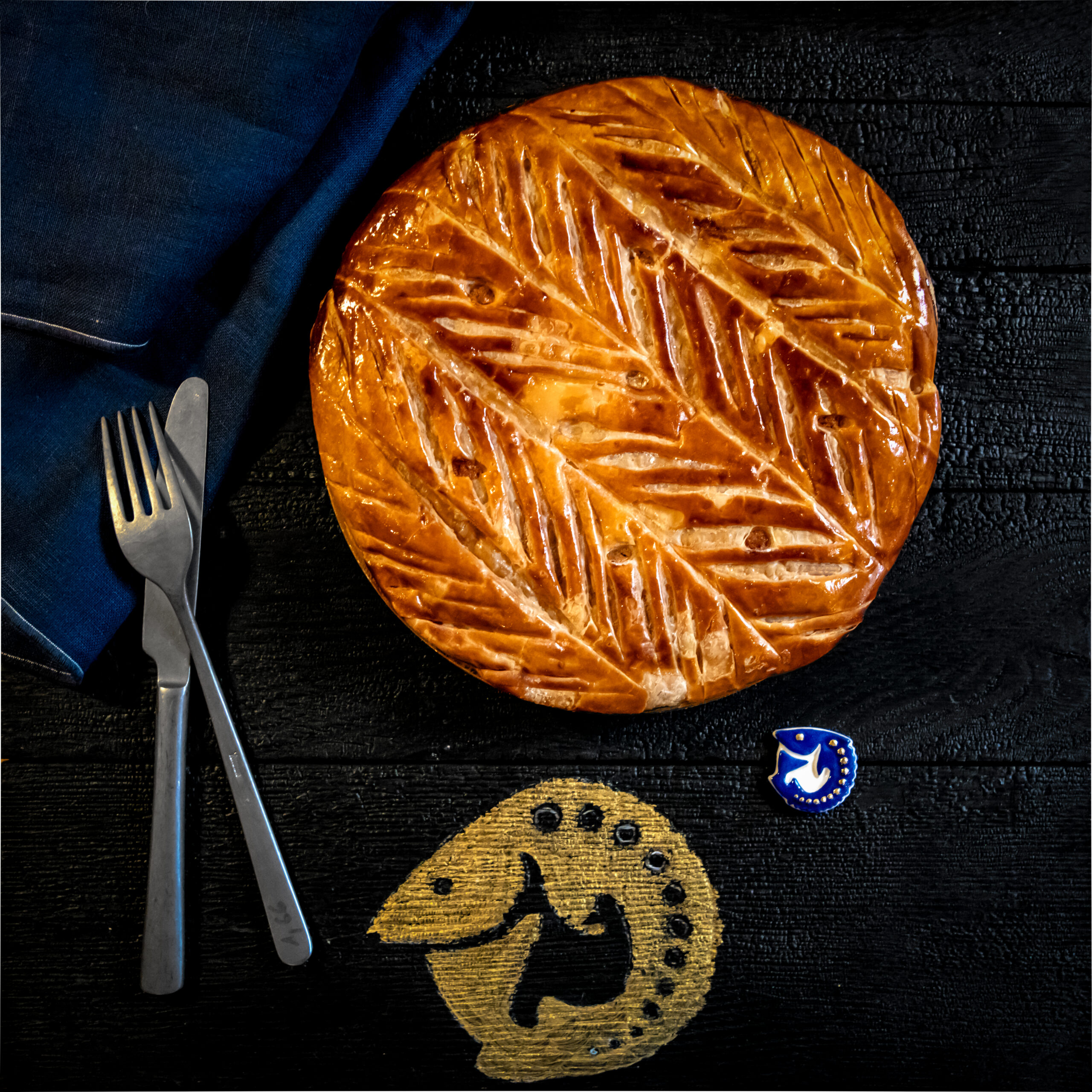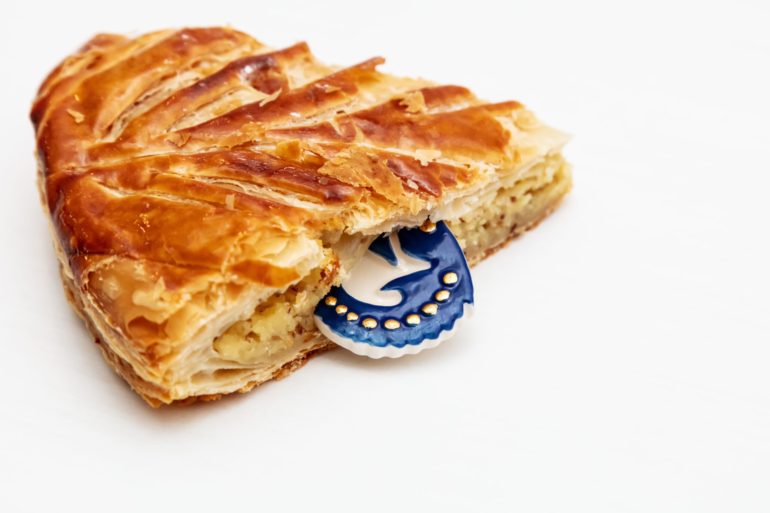 Celle-ci est composée, telle que la tradition le veut, d’une pâte feuilletée pur beurre, d’une crème amande vanille, contrastée par une légère touche de rhum.