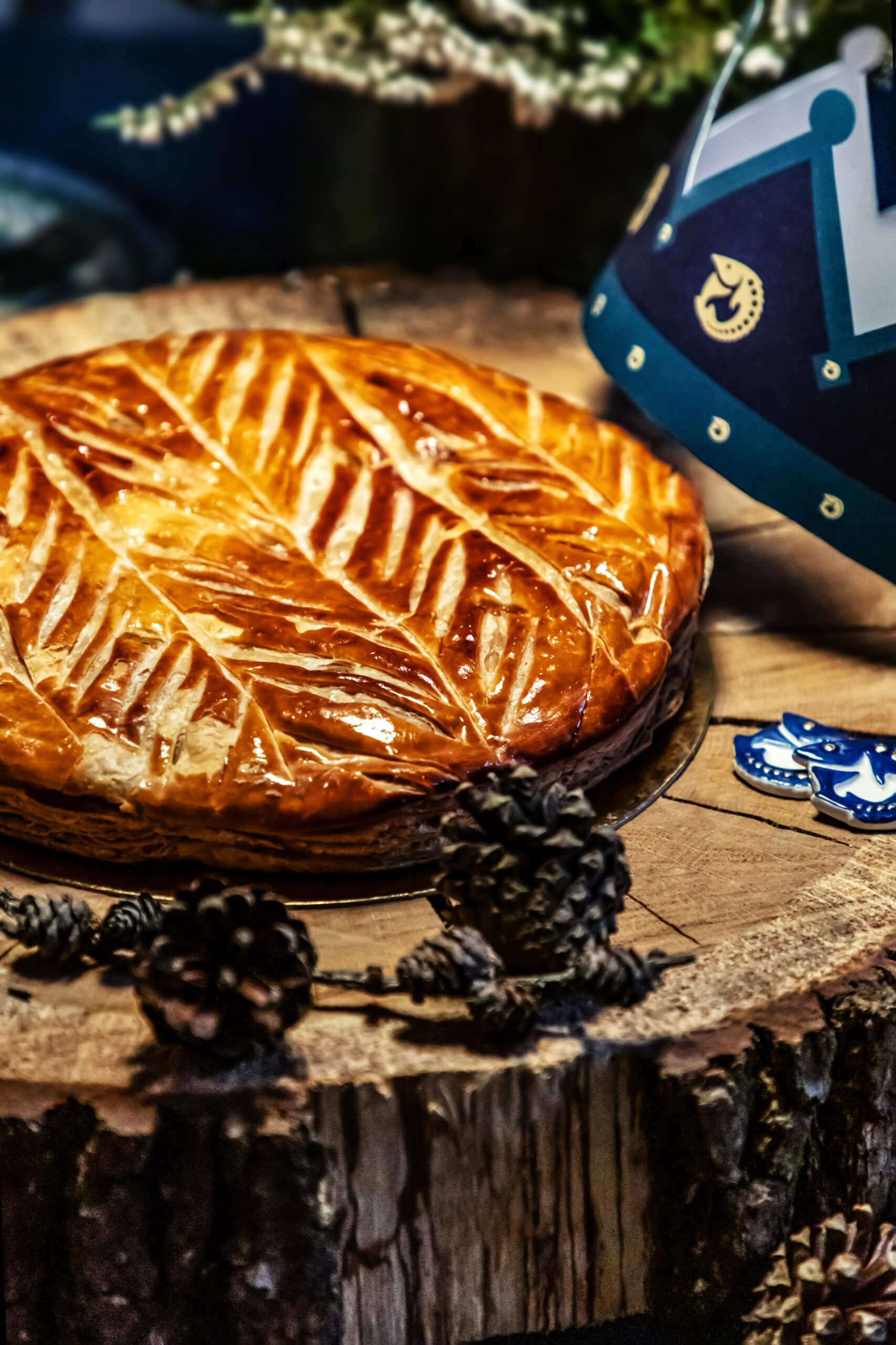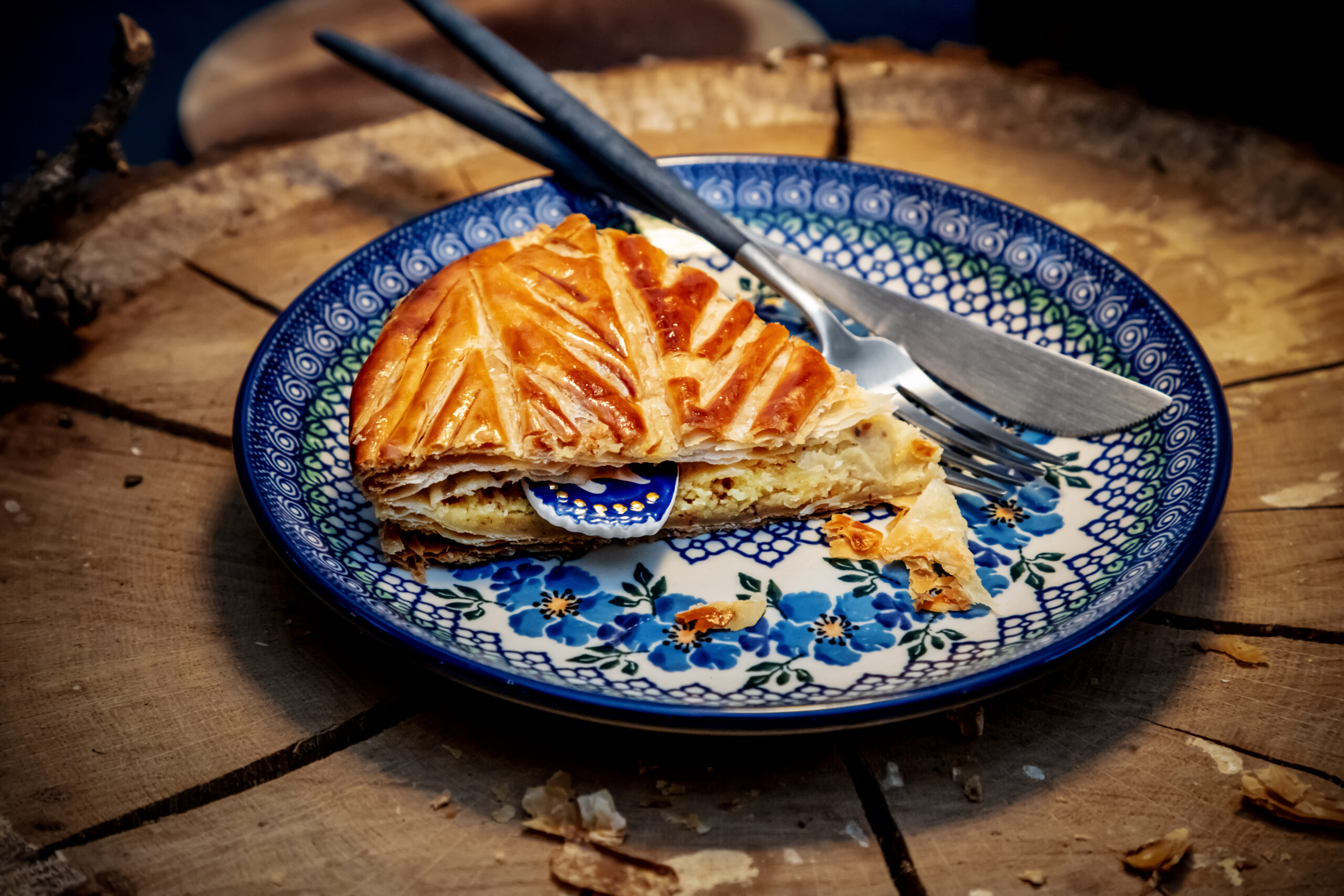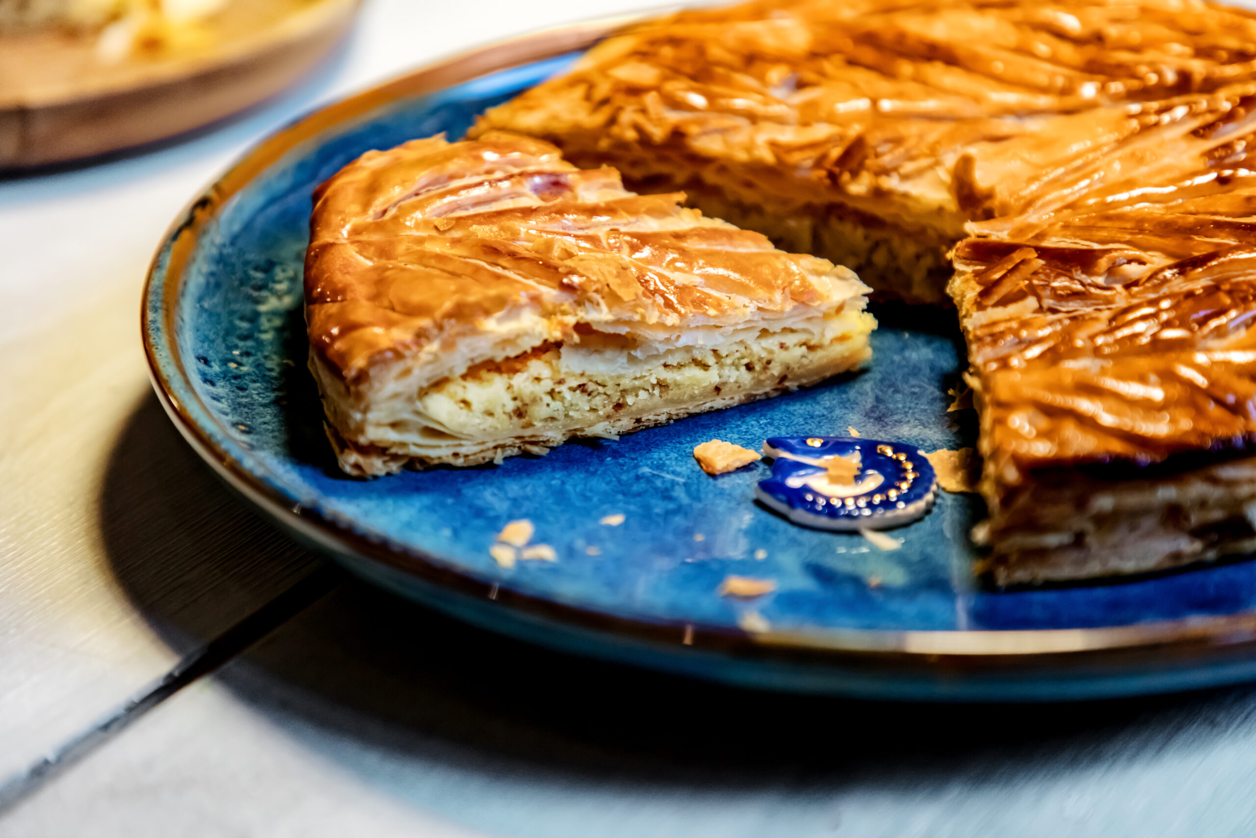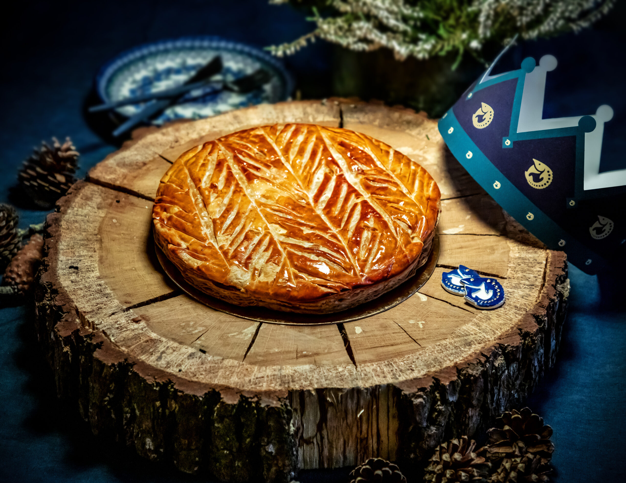 Celle-ci est composée, telle que la tradition le veut, d’une pâte feuilletée pur beurre, d’une crème amande vanille, contrastée par une légère touche de rhum.