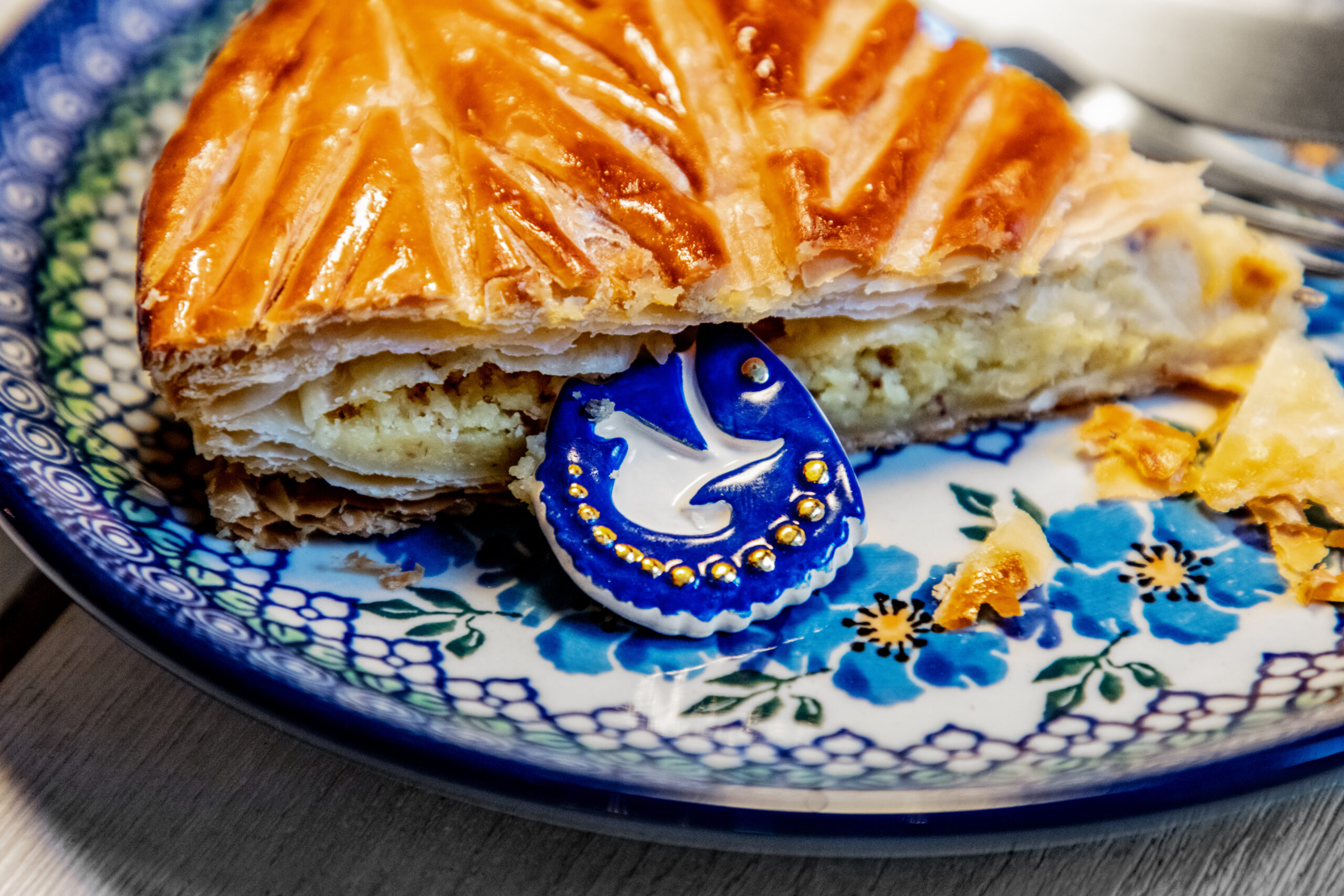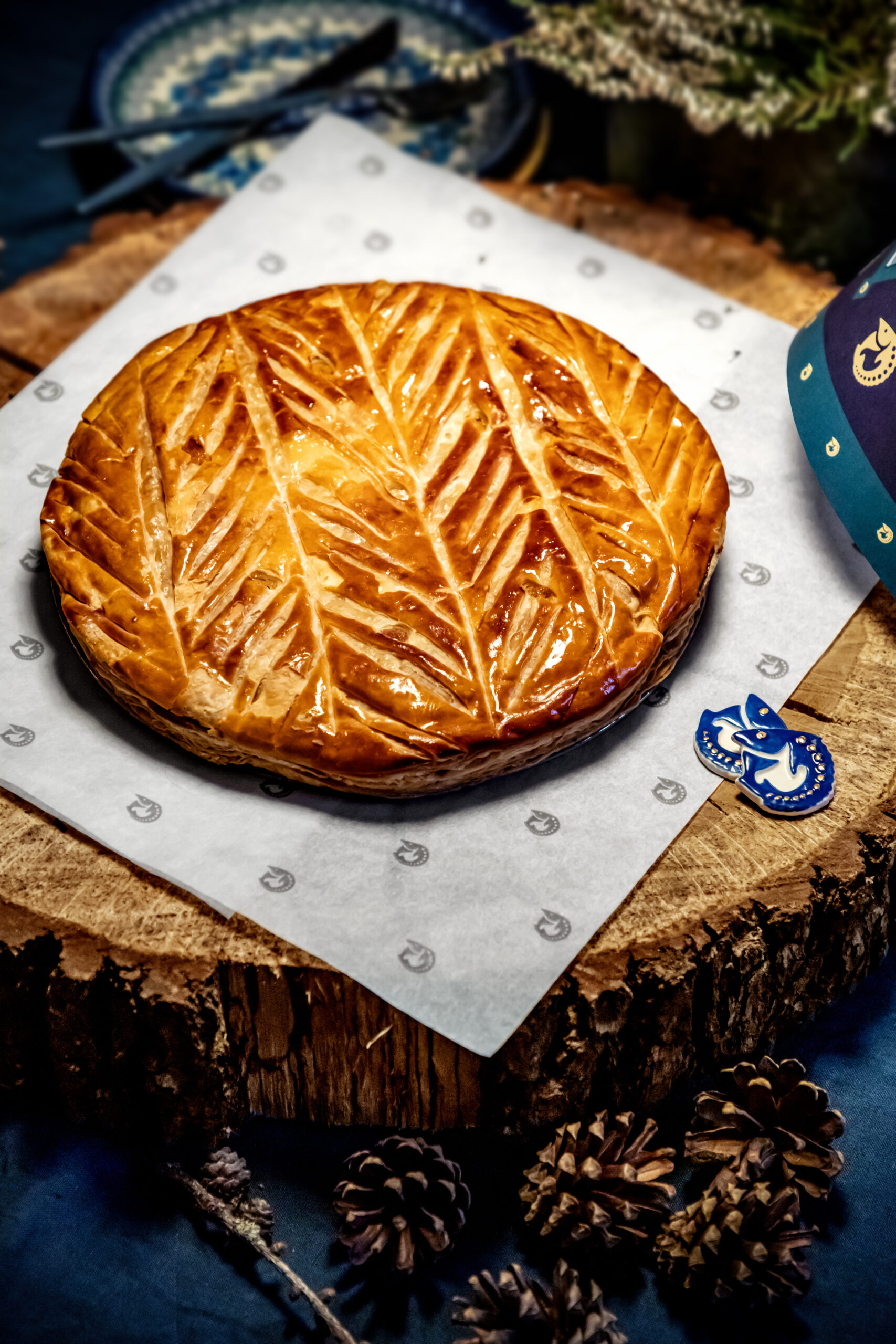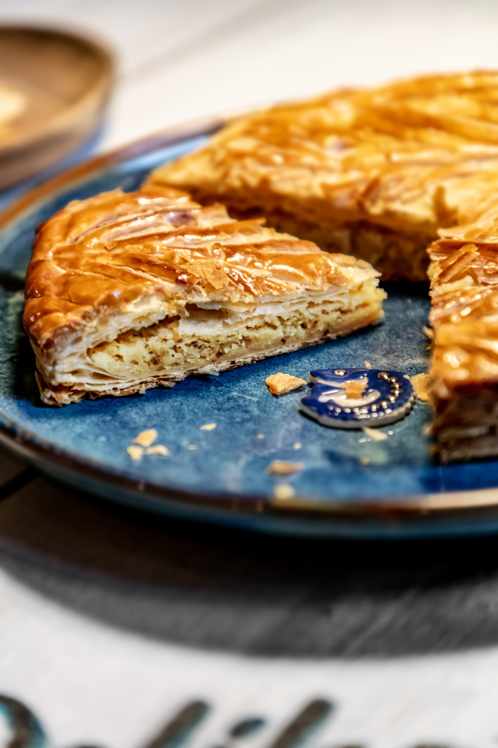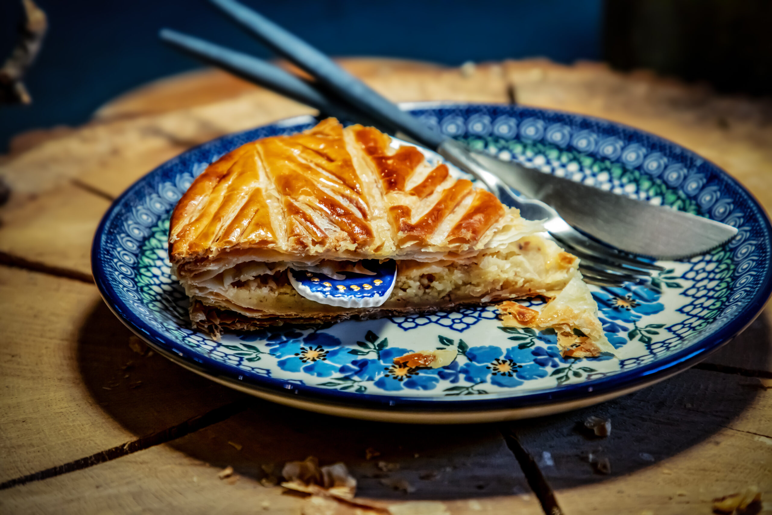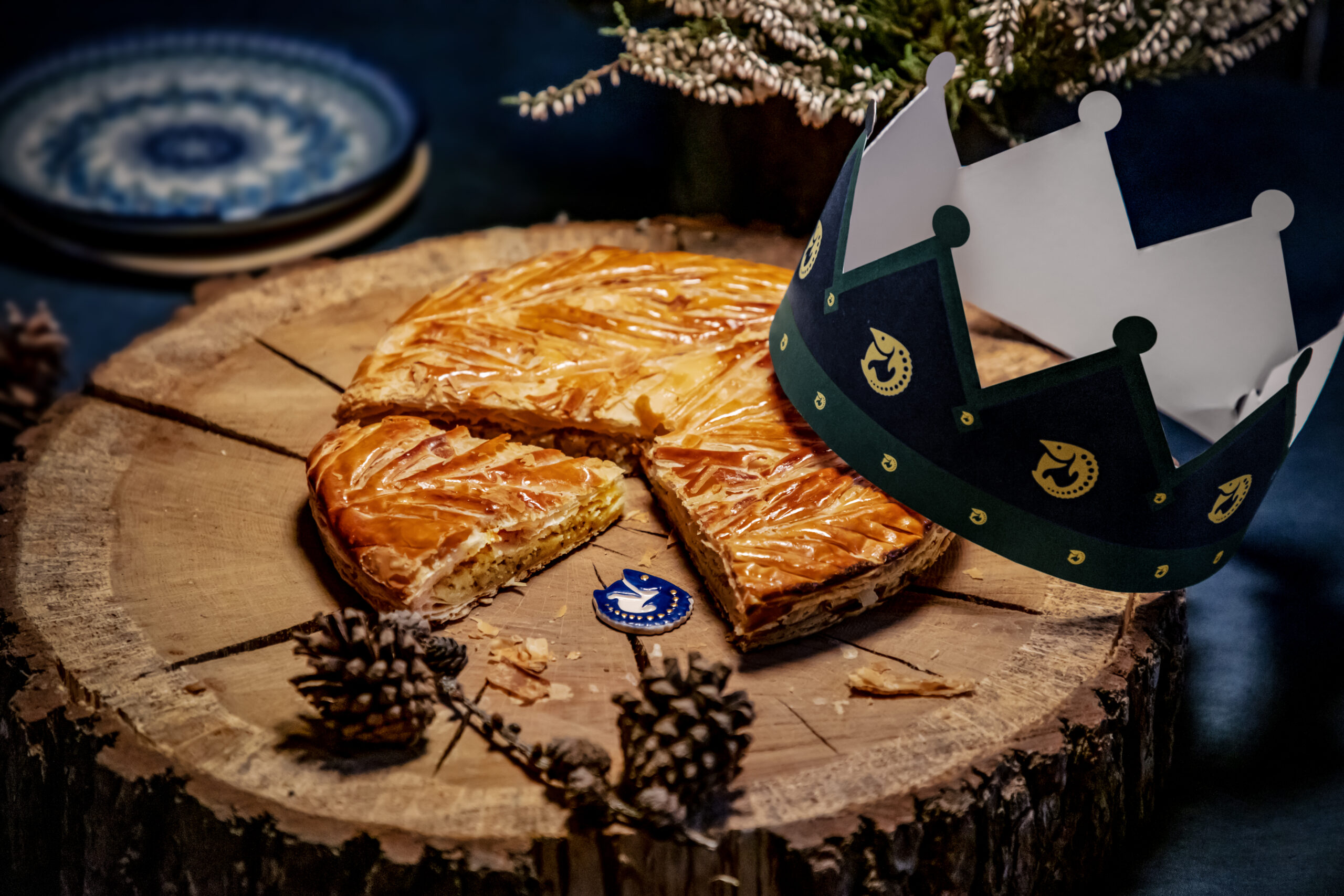 Celle-ci est composée, telle que la tradition le veut, d’une pâte feuilletée pur beurre, d’une crème amande vanille, contrastée par une légère touche de rhum.
