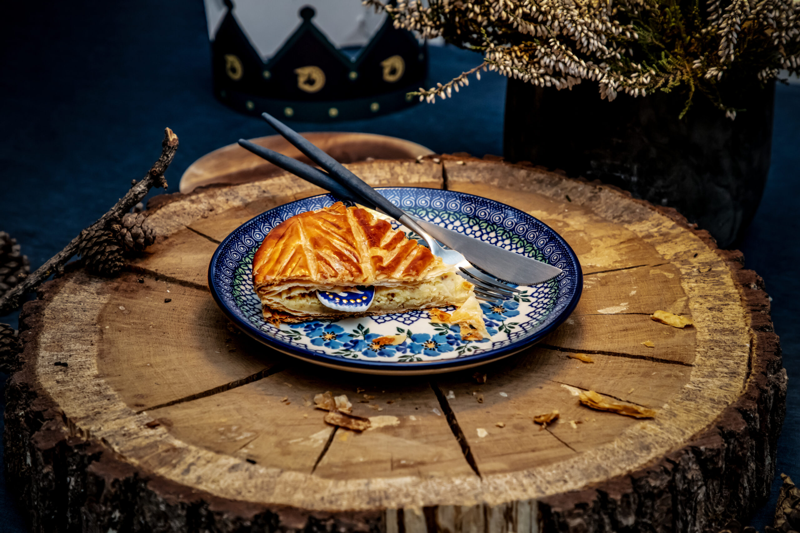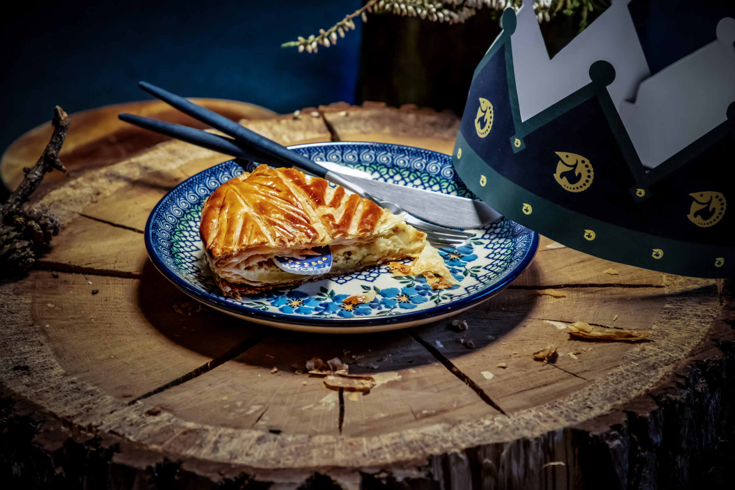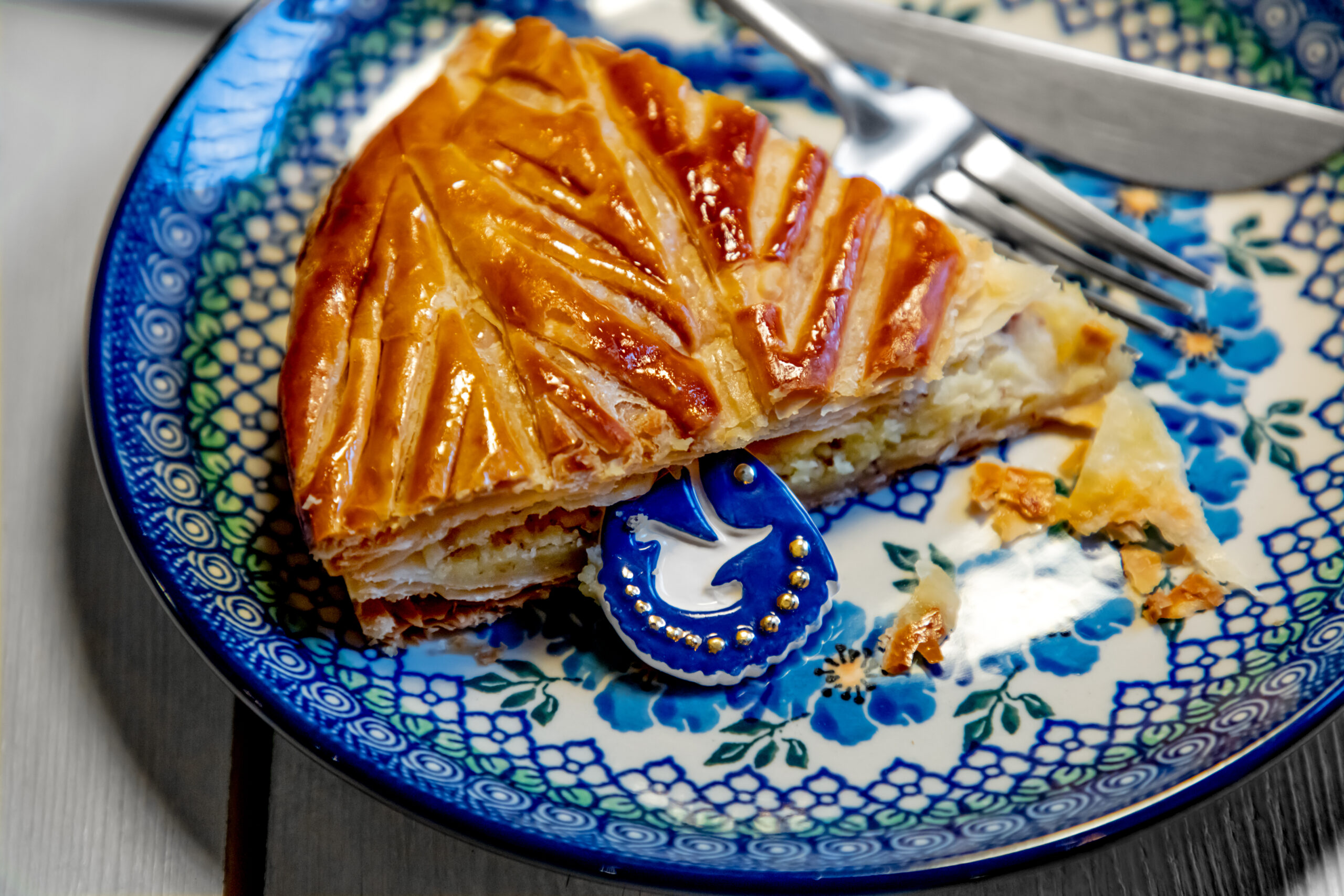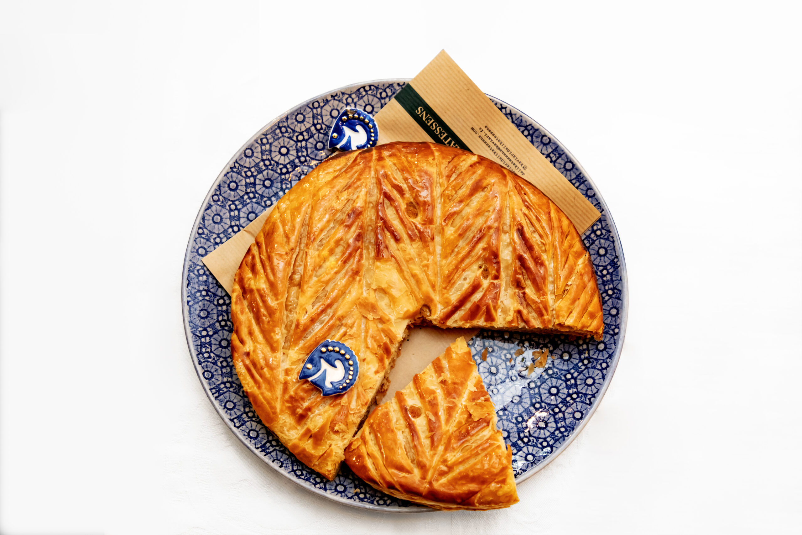 Celle-ci est composée, telle que la tradition le veut, d’une pâte feuilletée pur beurre, d’une crème amande vanille, contrastée par une légère touche de rhum.