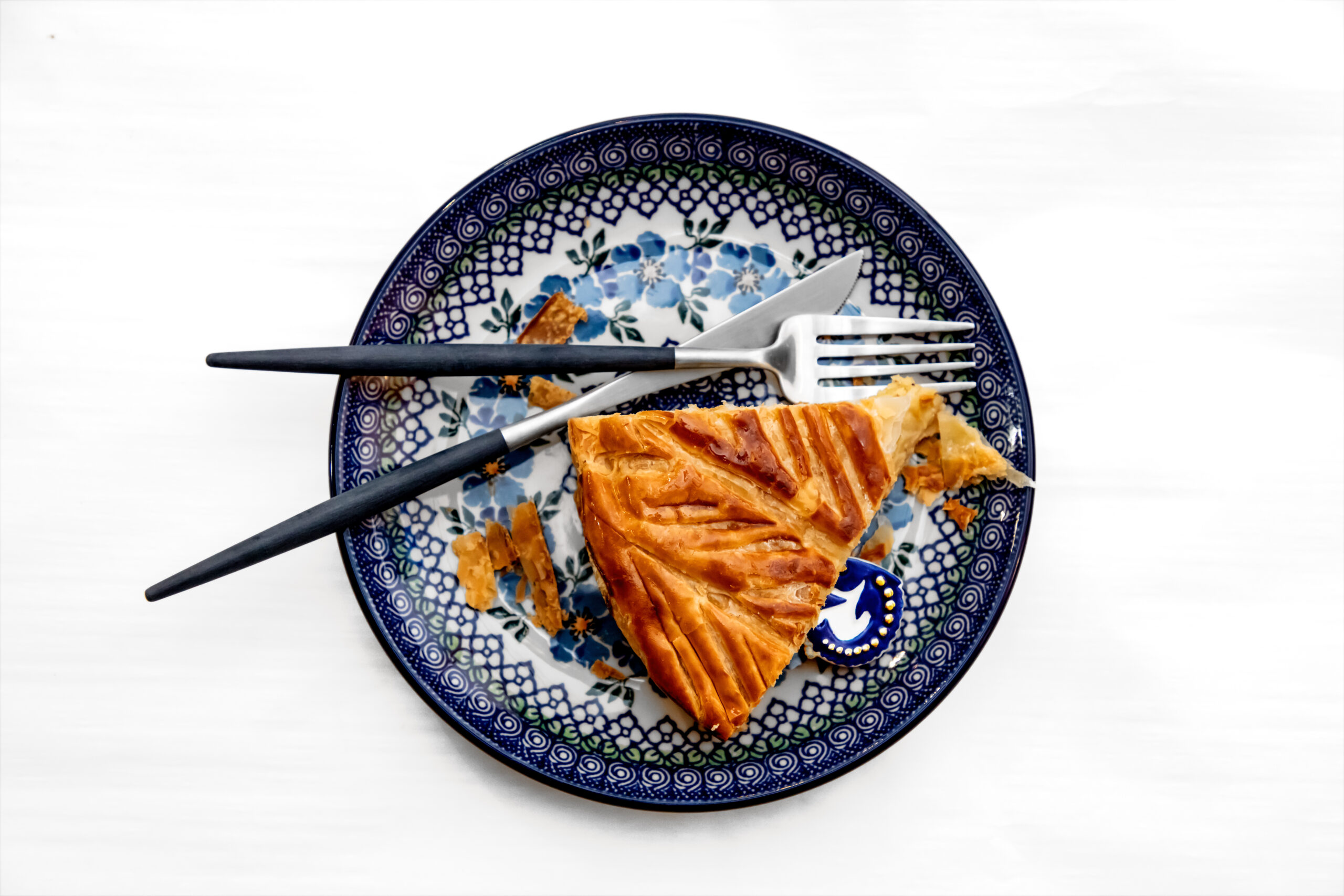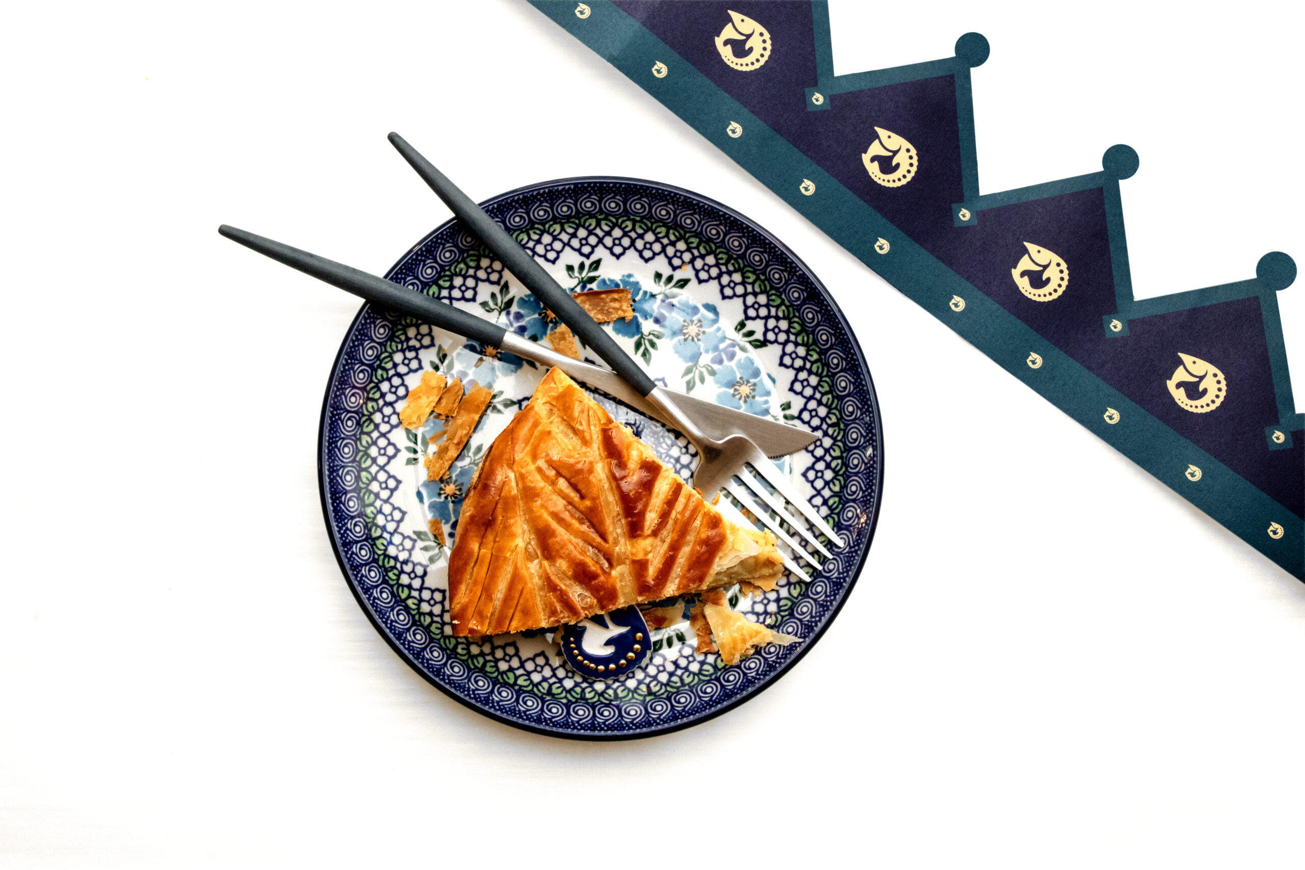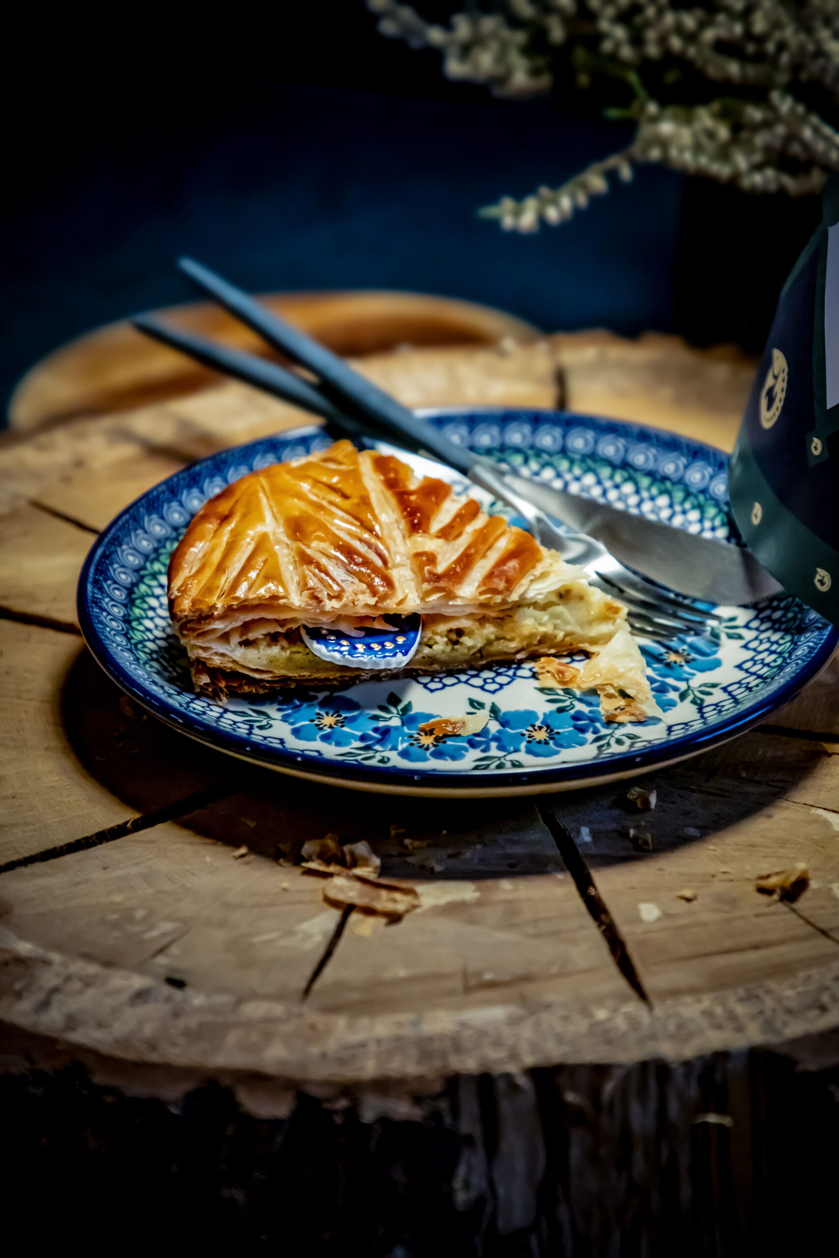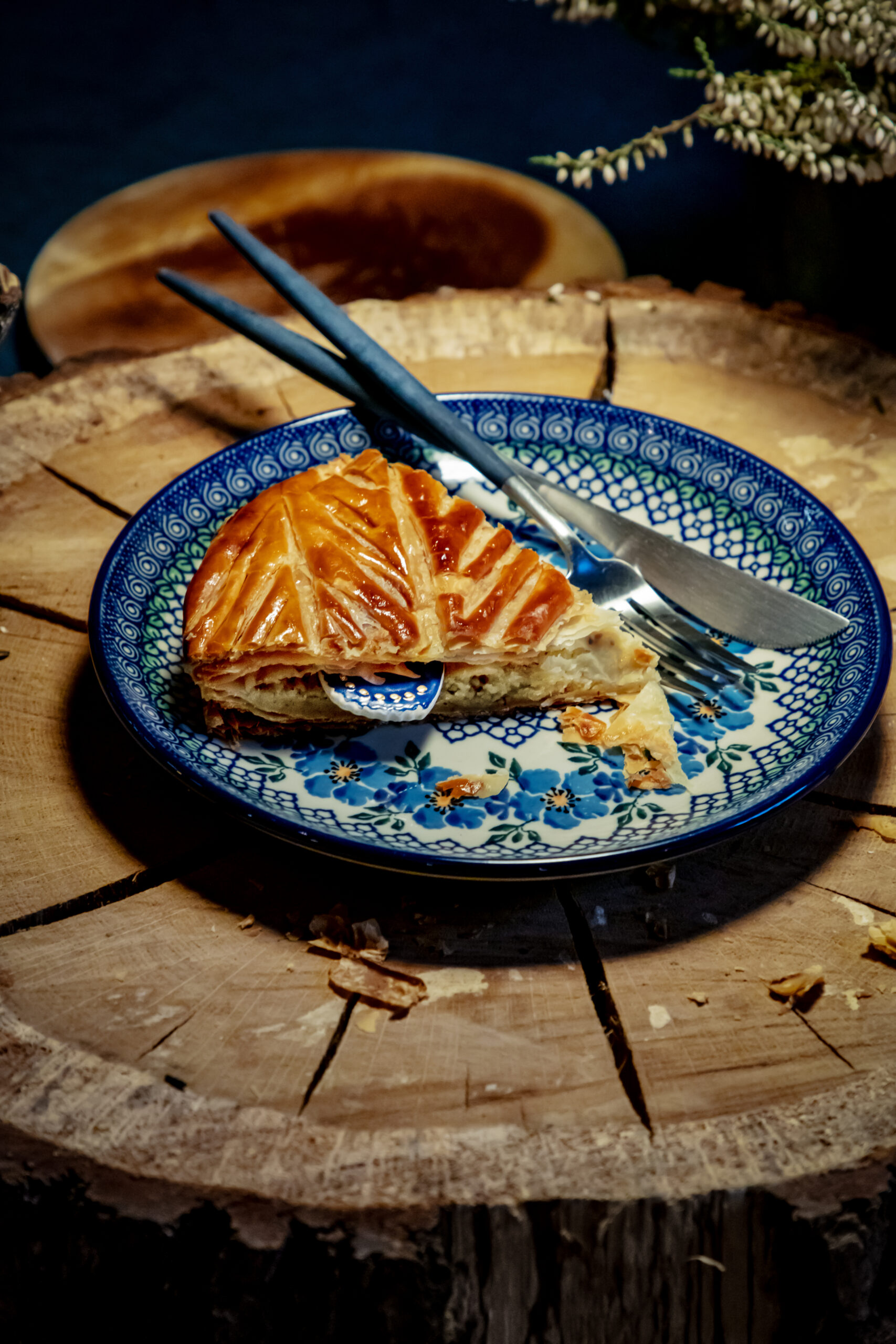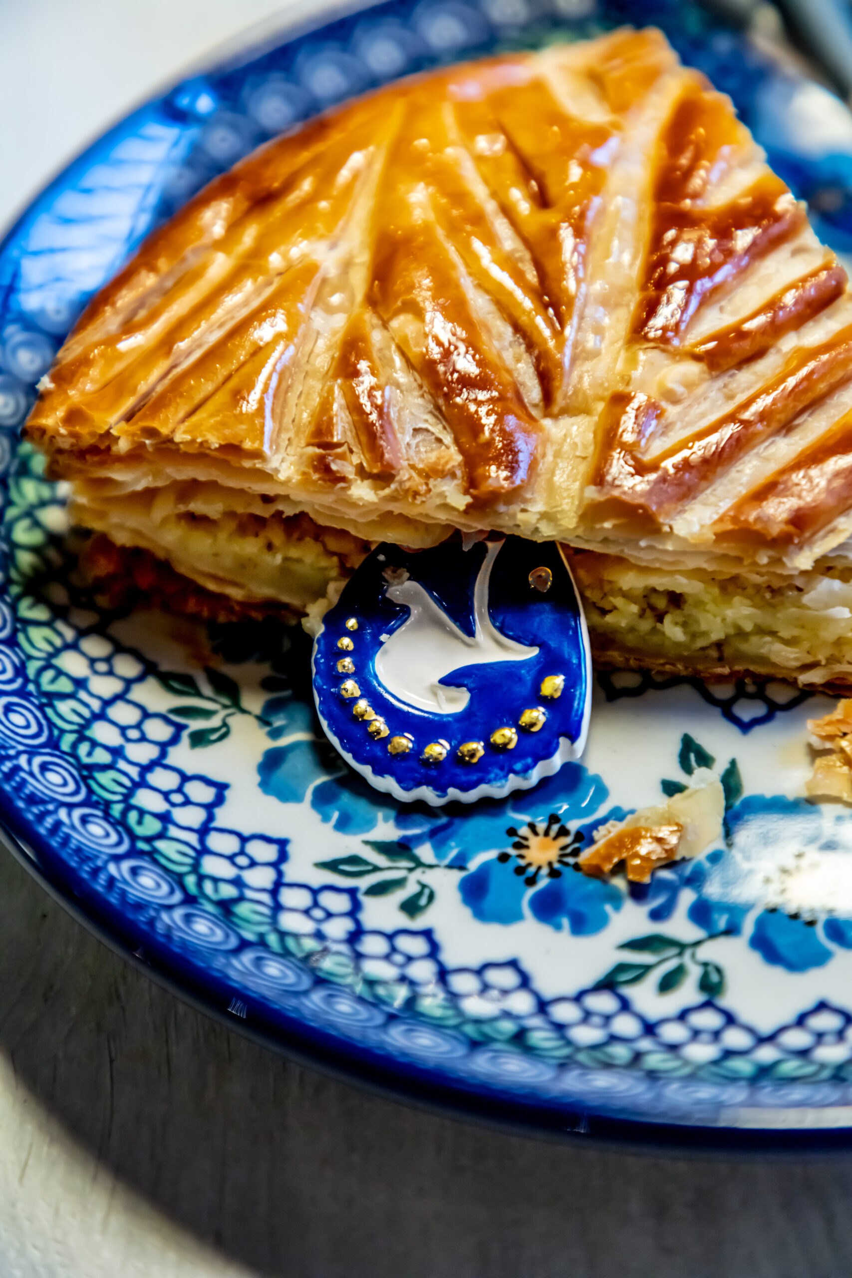 Celle-ci est composée, telle que la tradition le veut, d’une pâte feuilletée pur beurre, d’une crème amande vanille, contrastée par une légère touche de rhum.