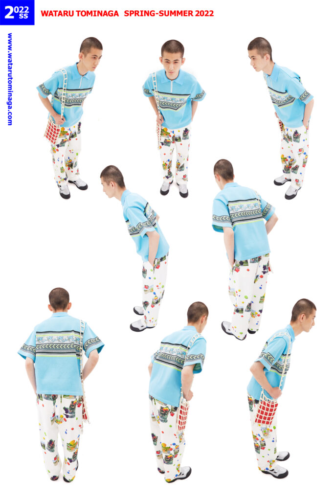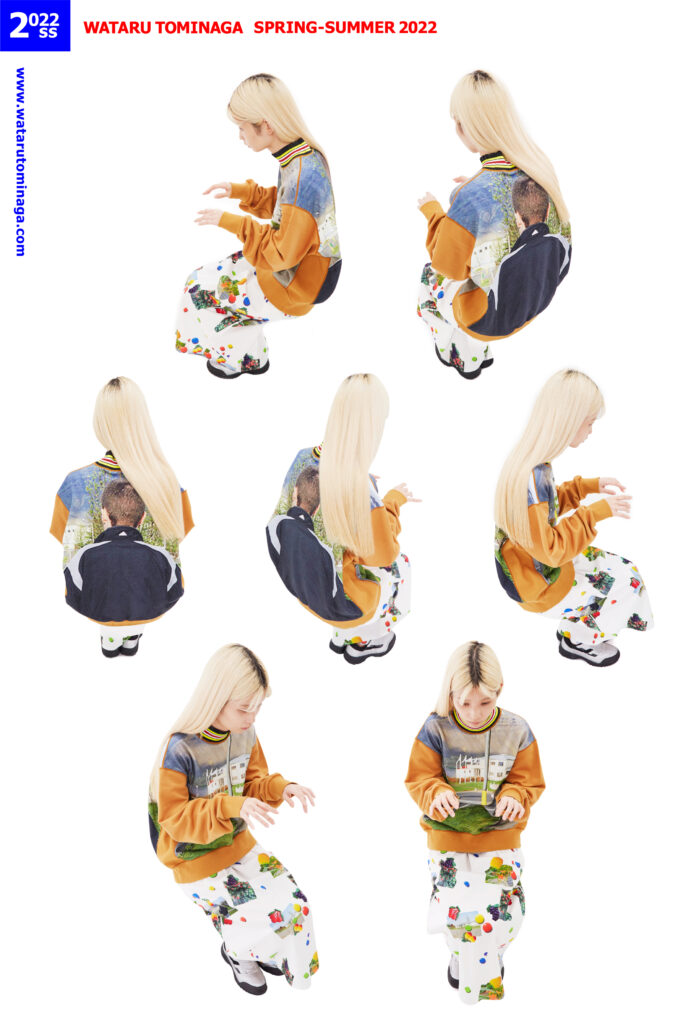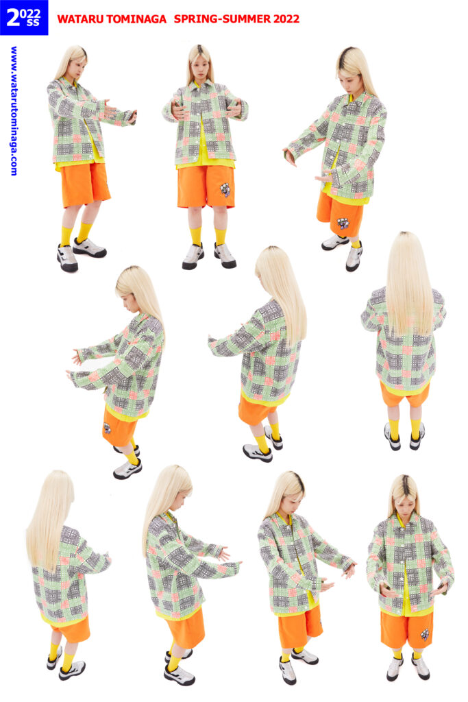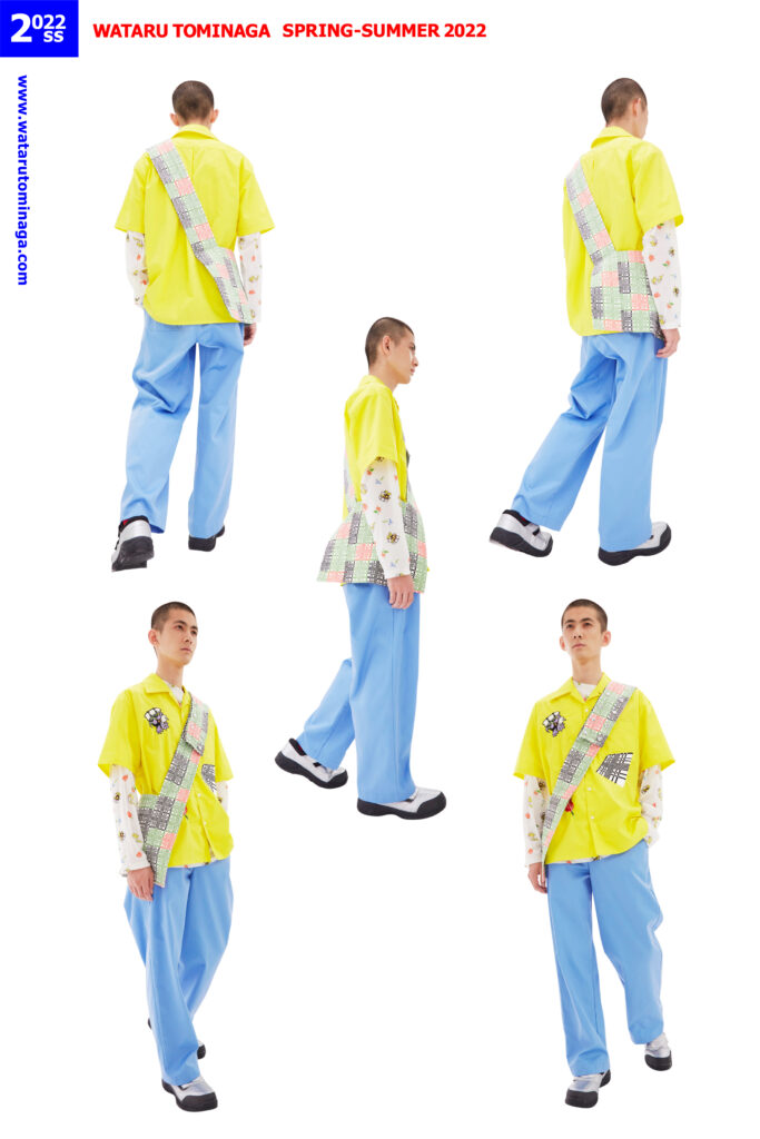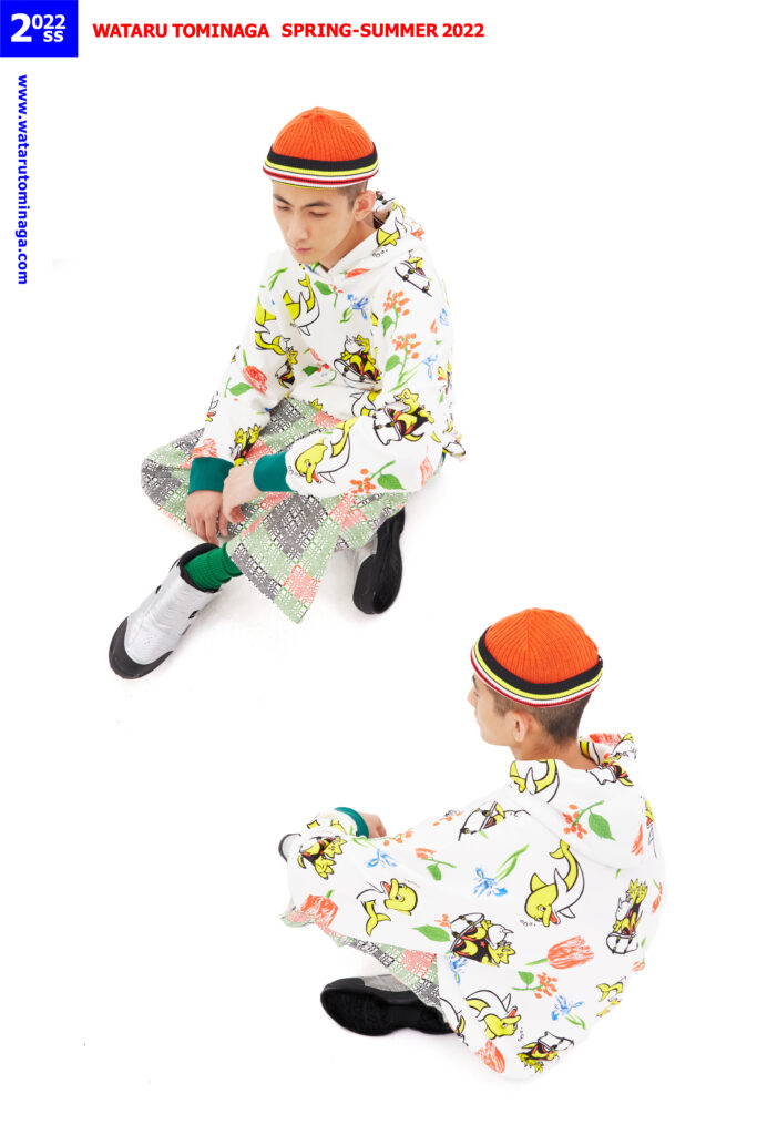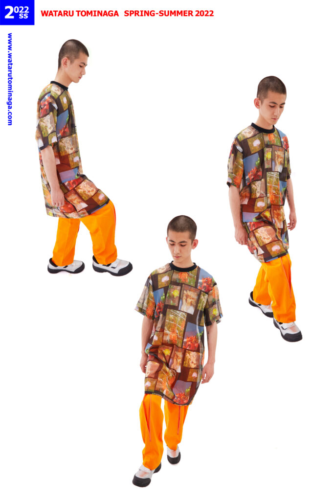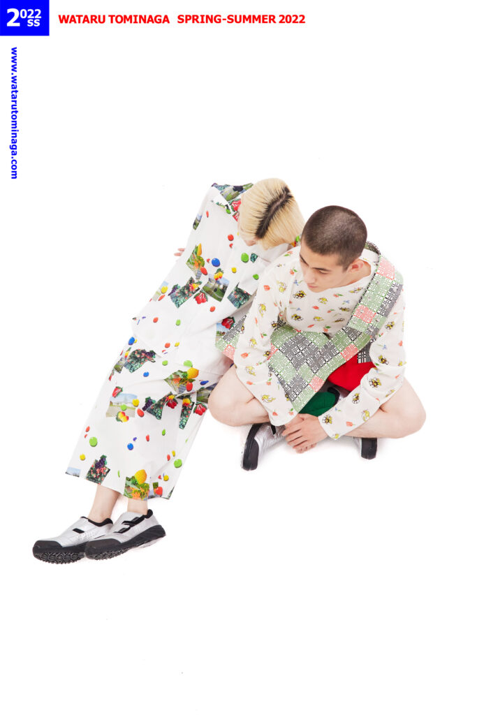 WATARU TOMINAGA Spring/Summer 2022 Collection was inspired by mixtures of various styles of printed textiles such as mascot prints for children’s clothing, vintage photo print textiles, and plaid patterns, all of which are drawn and photographed by the designer. Juxtaposing images of various styles and backgrounds, Tominaga aims to create both dissonance and harmony at the same time in the Collection.