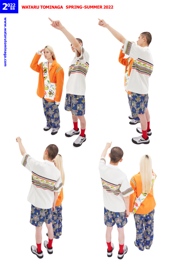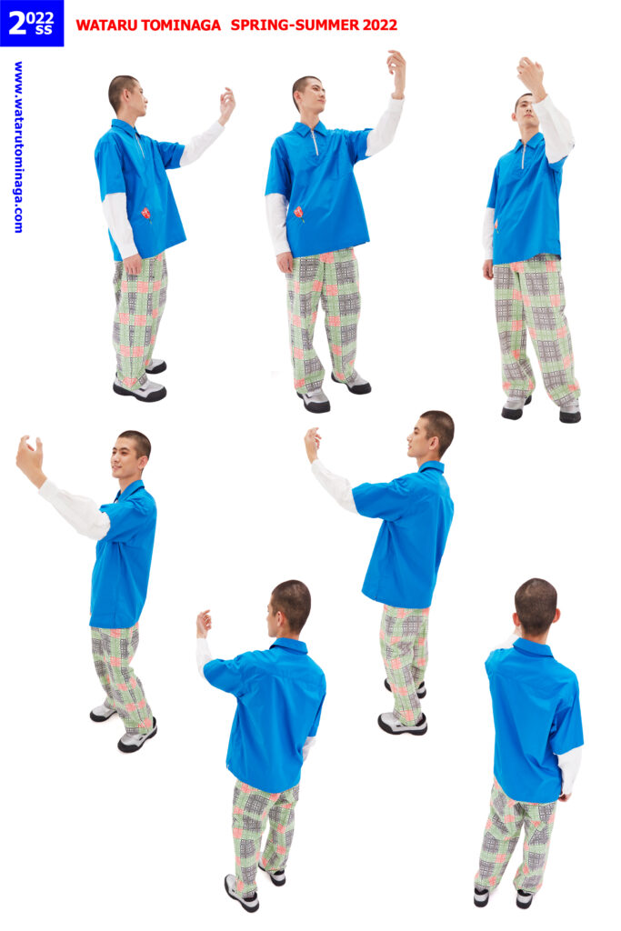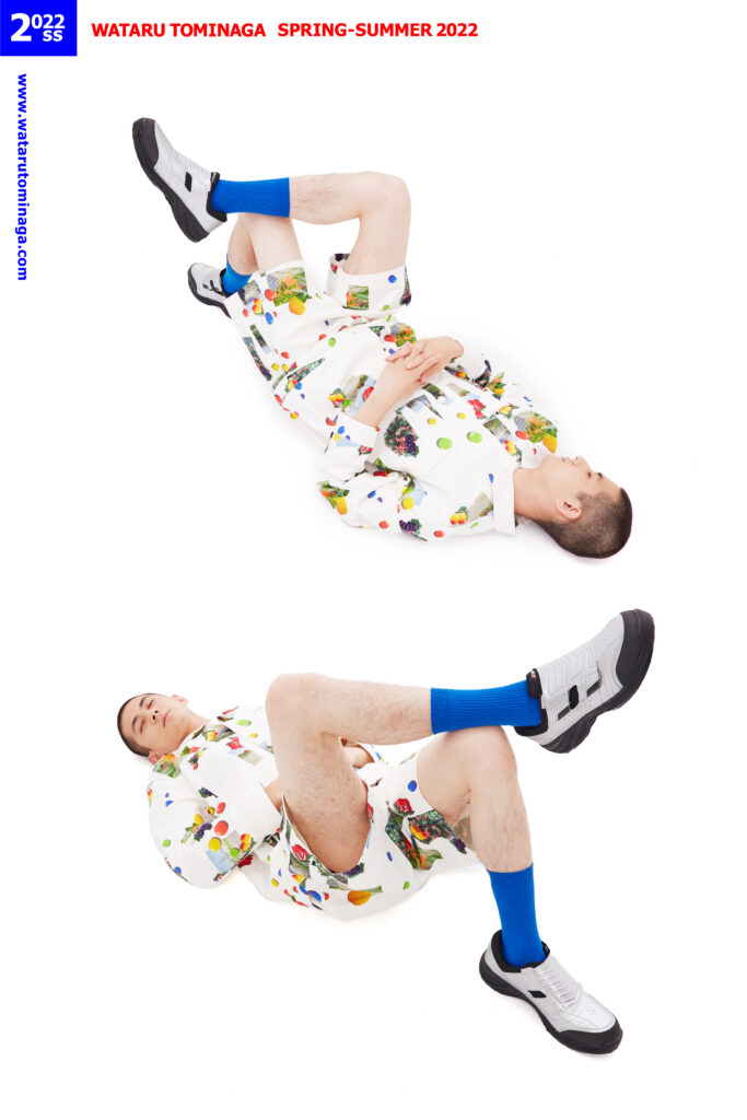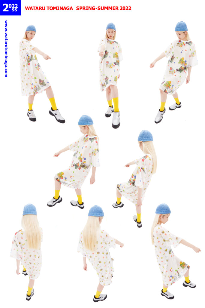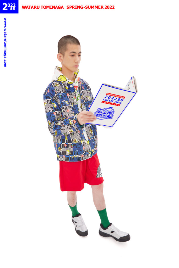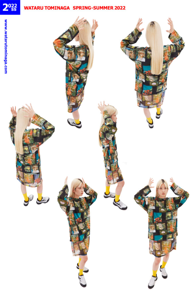 WATARU TOMINAGA Spring/Summer 2022 Collection was inspired by mixtures of various styles of printed textiles such as mascot prints for children’s clothing, vintage photo print textiles, and plaid patterns, all of which are drawn and photographed by the designer. Juxtaposing images of various styles and backgrounds, Tominaga aims to create both dissonance and harmony at the same time in the Collection.