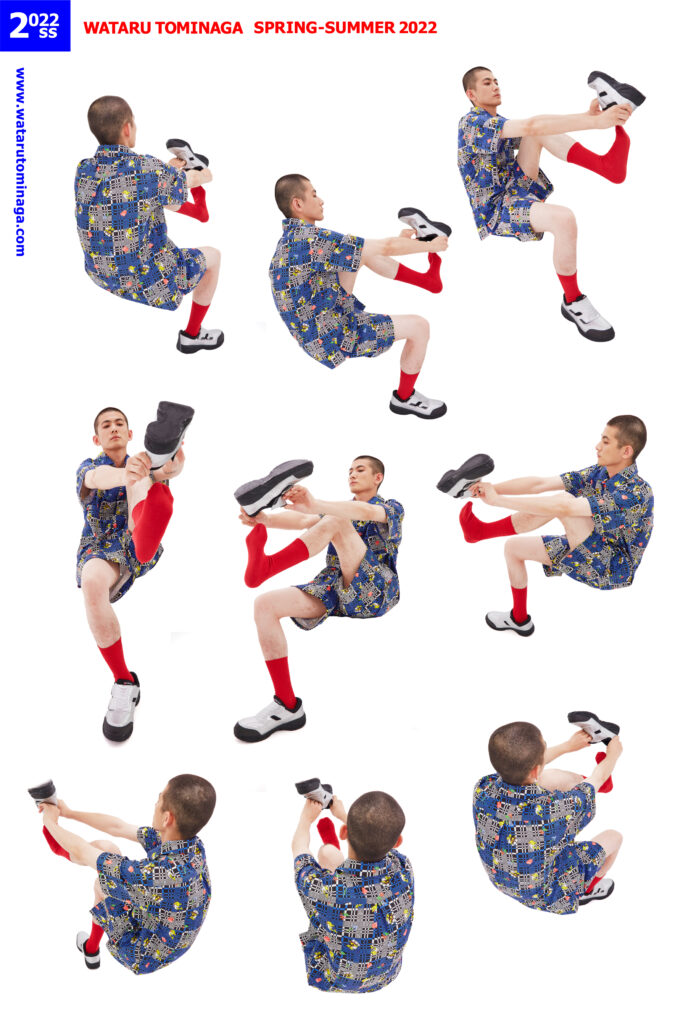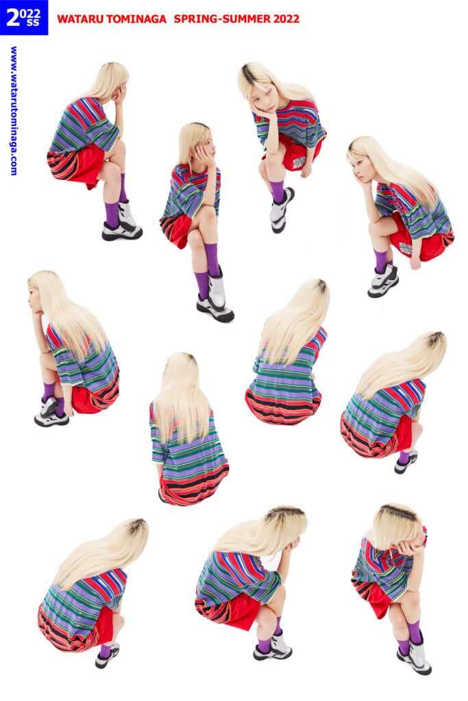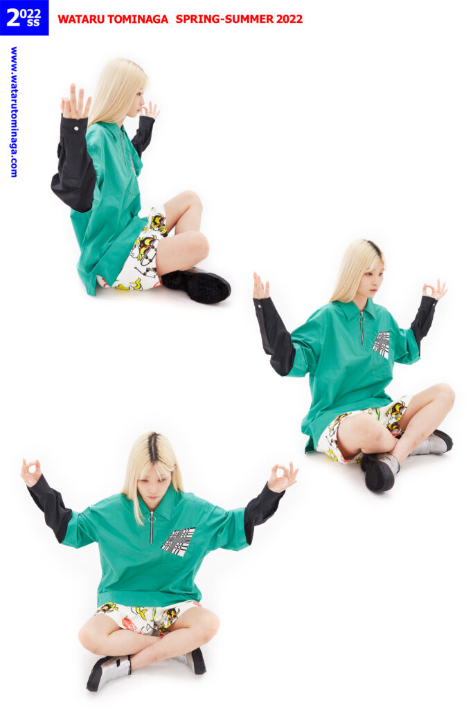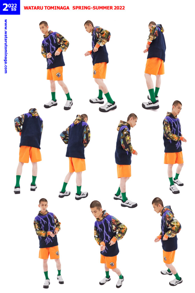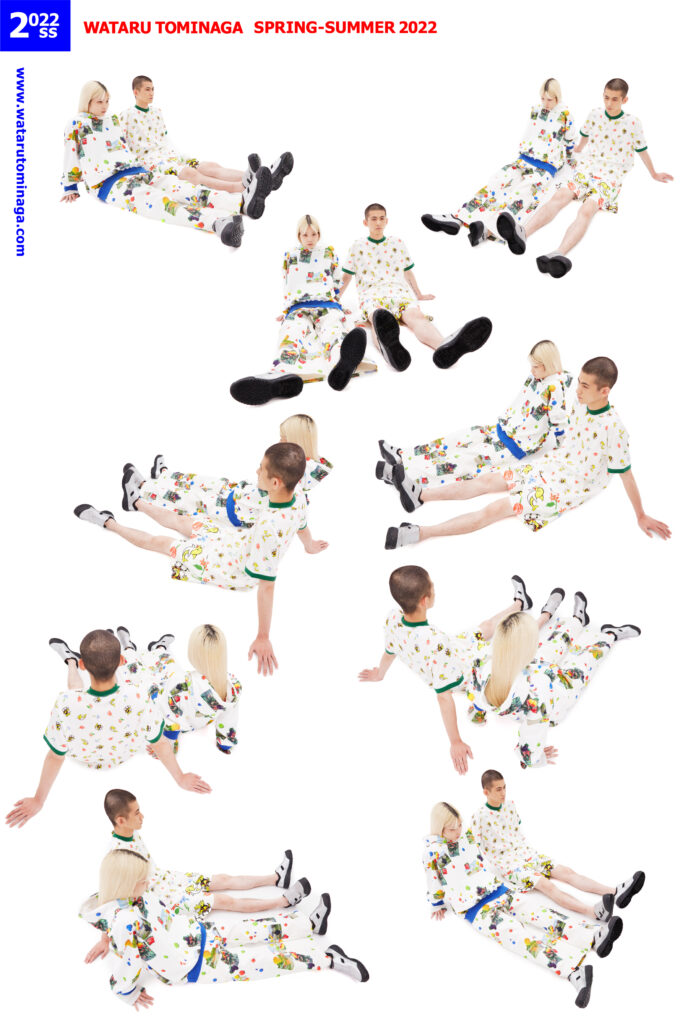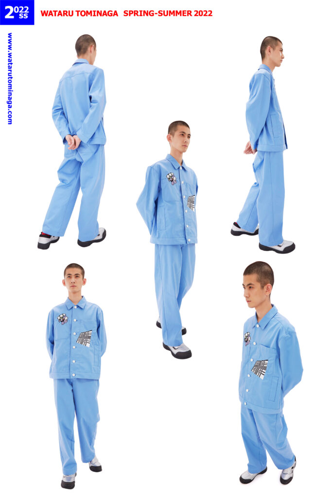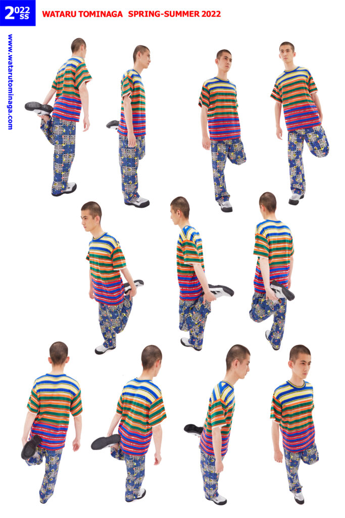 WATARU TOMINAGA Spring/Summer 2022 Collection was inspired by mixtures of various styles of printed textiles such as mascot prints for children’s clothing, vintage photo print textiles, and plaid patterns, all of which are drawn and photographed by the designer. Juxtaposing images of various styles and backgrounds, Tominaga aims to create both dissonance and harmony at the same time in the Collection.