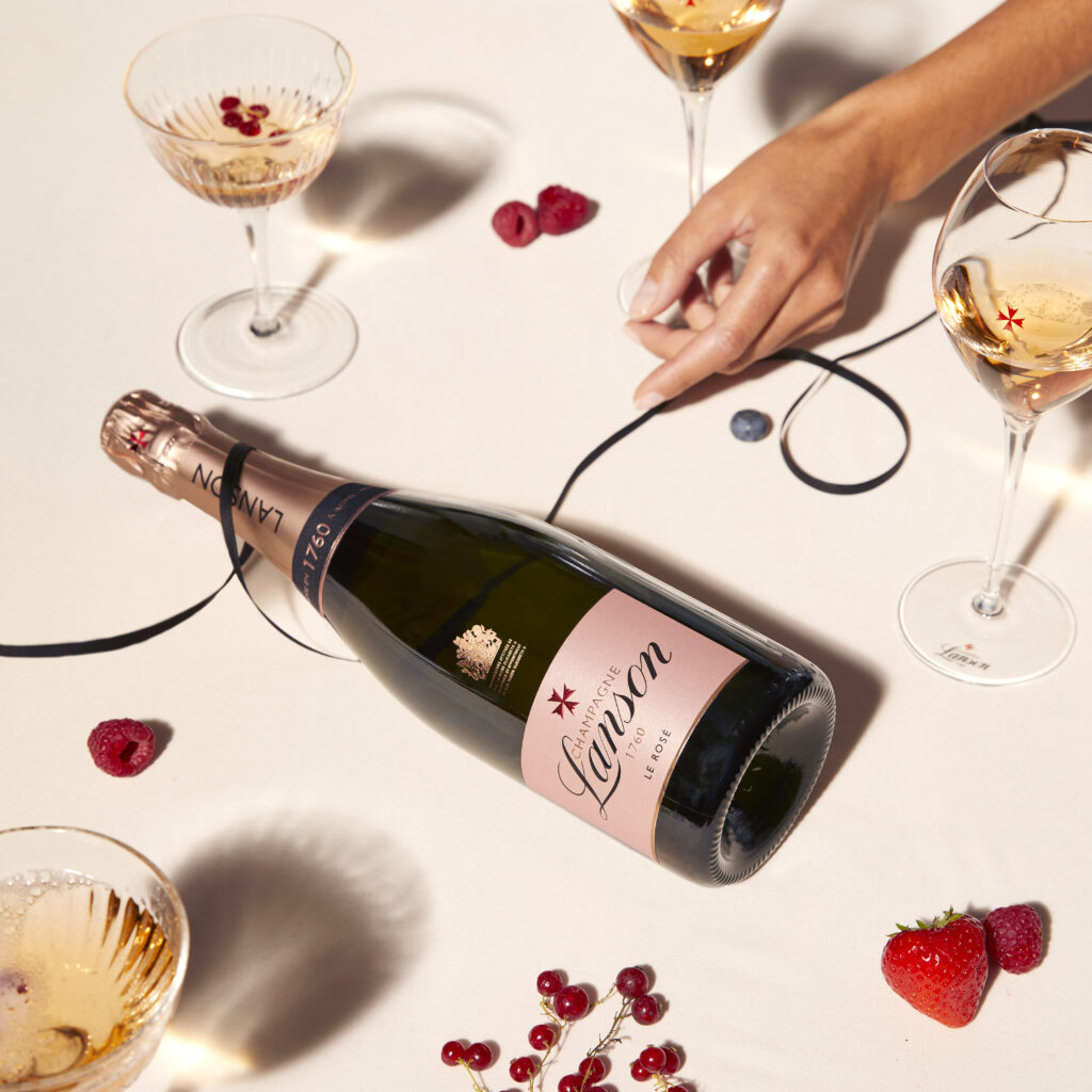 Pour la Saint-Valentin, le Champagne Lanson propose sa cuvée Le Rosé, présentée dans son étui ou en coffret cadeau avec son duo de flûtes.