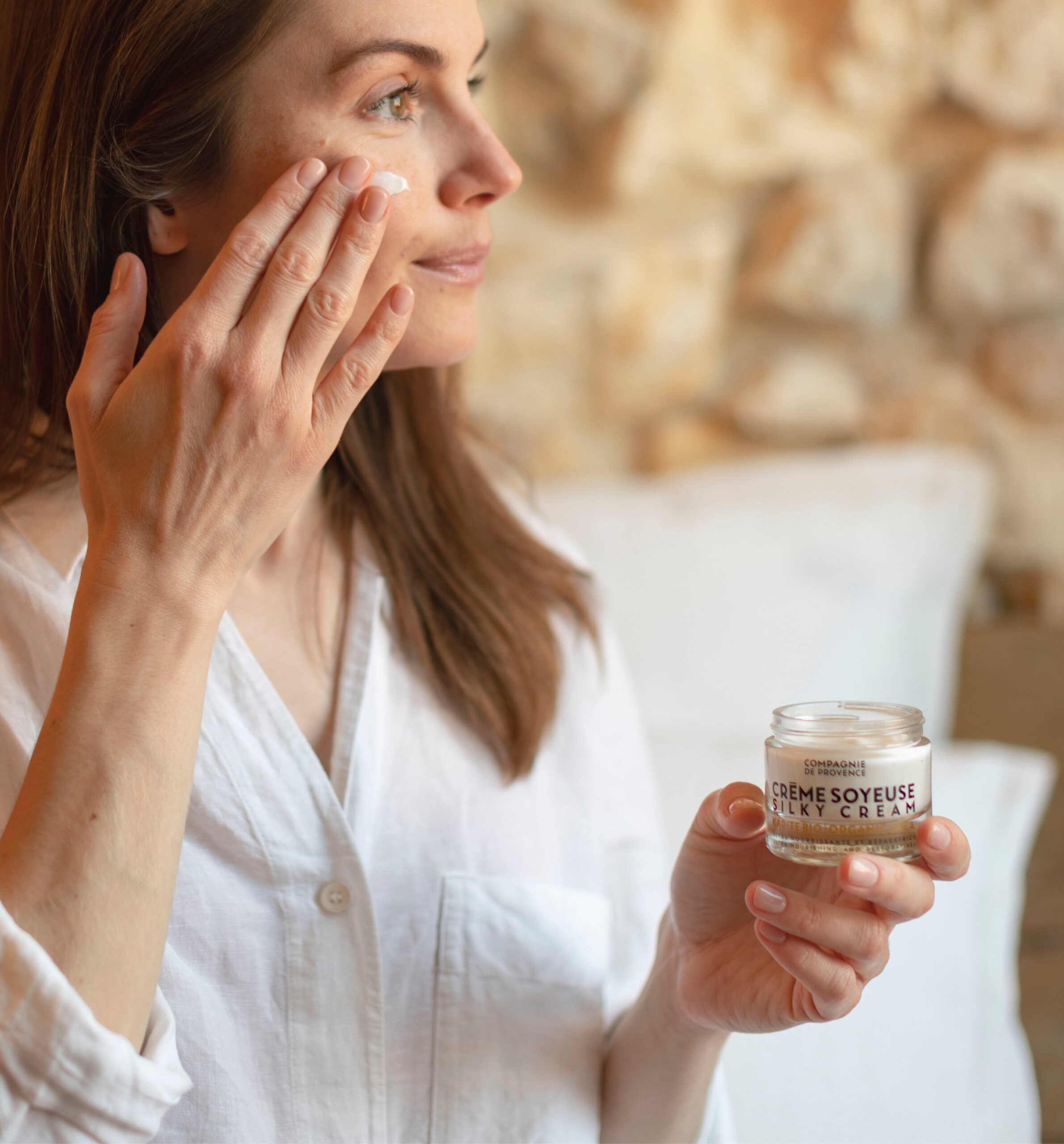 Cette crème visage onctueuse nourrit, répare et apaise les peaux sèches et sensibles. Son secret ? Le beurre de karité biologique et équitable, riche en actifs relipidants pour nourrir et réparer la peau. Il s’associe à un trio précieux d’huiles végétales de Provence* : l’huile d’amande douce pour apaiser les peaux sujettes à l’inconfort, l’huile d’olive pour hydrater et l’huile de pépins de raisin pour permettre à la peau de conserver toute son élasticité. Véritable soin SOS des peaux sèches et sensibles, la Crème soyeuse laisse la peau intensément nourrie, comme réparée. Apaisée, elle ne tiraille plus. Elle est aussi douce que de la soie. À appliquer matin et soir sur le visage et le cou durant toute l’année. Parce qu’en Provence, on connaît les effets du soleil sur la peau. Notre Crème soyeuse apporte tout son réconfort pendant l’été, après l’exposition au soleil. L’hiver, elle enveloppe la peau d’un voile de soin pour faire face aux agressions du froid. Des résultats prouvés en laboratoire : + 24.4% d’élasticité** + 29.4% d’hydratation** La peau est apaisée et nourrie