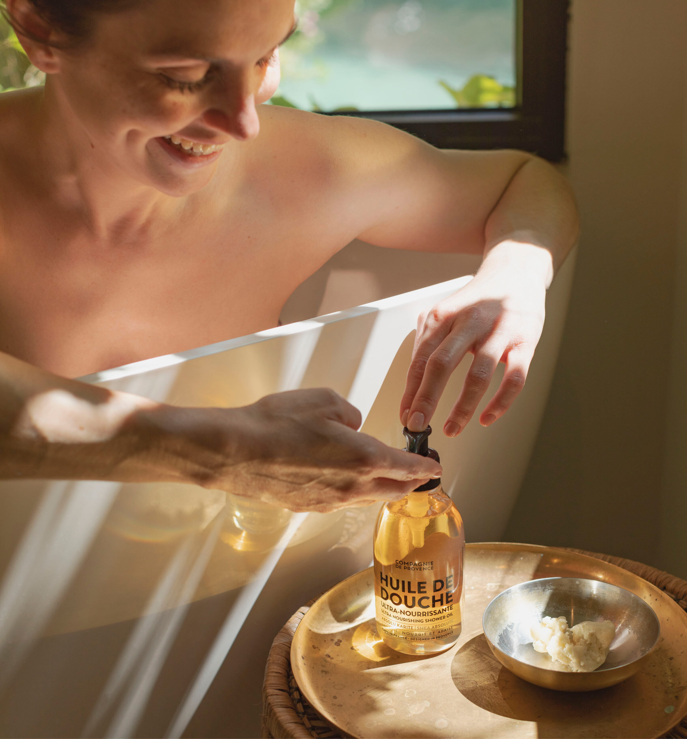 Transformez la douche en un vrai moment de réconfort grâce à la plus naturelle des huiles de douche. Notre nouvelle Huile de douche nourrissante réussit la prouesse d’être aussi naturelle que sensorielle. Cette Huile de douche est enrichie en absolu de karité et huiles végétales d’exception pour prendre soin de votre peau tout en douceur. Fabriquée au cœur de la Provence, elle nettoie et nourrit les peaux sèches et sensibles. Grâce à ses tensioactifs doux d’origine végétale, elle s’utilise aussi bien sur le visage que sur le corps. Riche en actifs relipidants, l’absolu de karité apporte ses vertus nutritives et enveloppe la peau d’une mousse réconfortante. Résultat la peau est propre, nourrie et divinement parfumée. Pour garantir une tolérance maximale, notre Huile de douche a été testée sur peaux sensibles. Et nous avons fait le choix d’une formule qui n’a rien à se reprocher : sans sulfate, sans PEG, sans EDTA, sans huiles minérales et donc sans dérivé du pétrole. Des résultats appuyés par un panel de volontaires : La peau plus douce pour 100% des testeurs* La peau ne tiraille pas pour 95% des testeurs* La peau est apaisée et confortable pour 95% des testeurs*