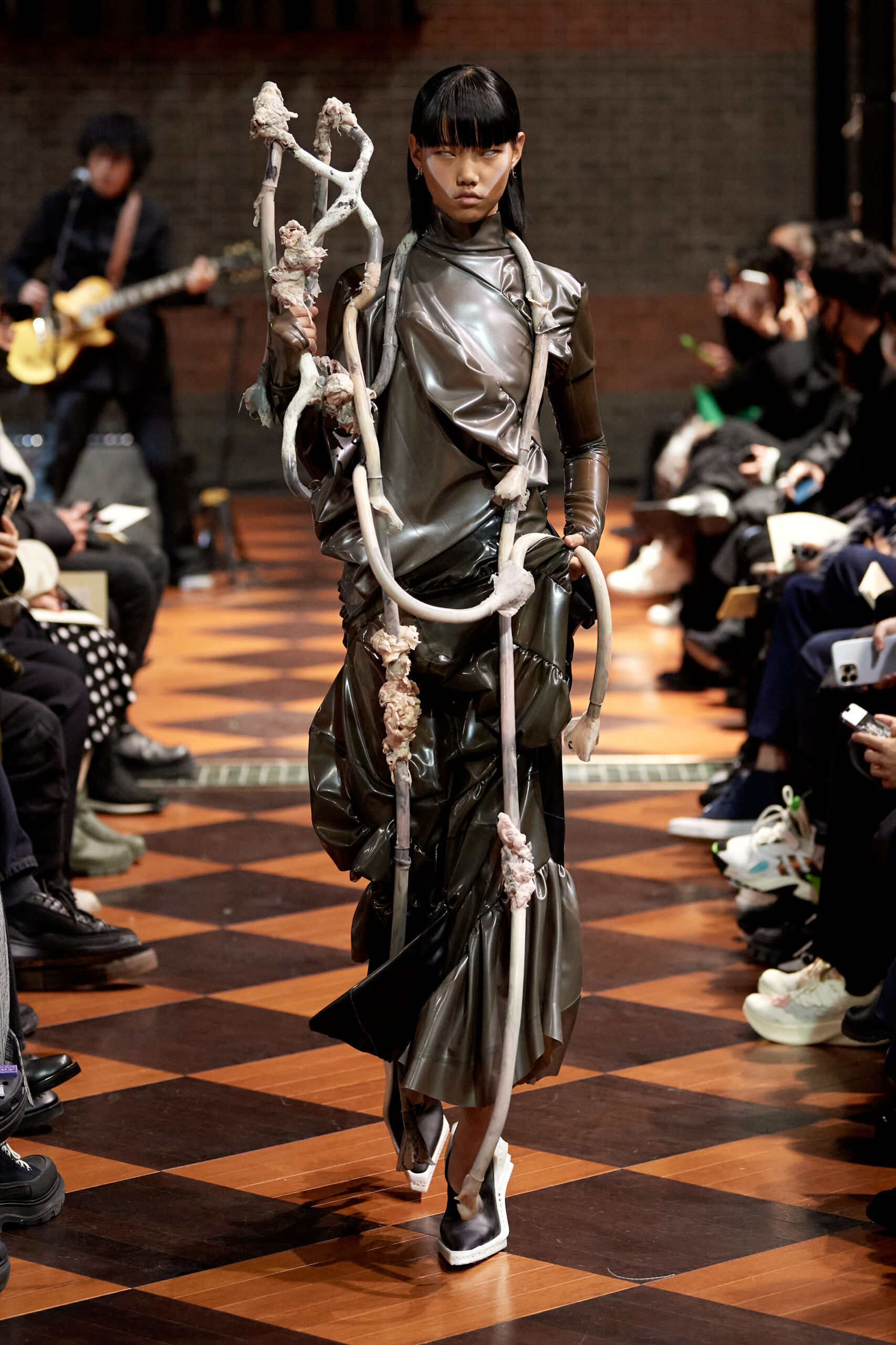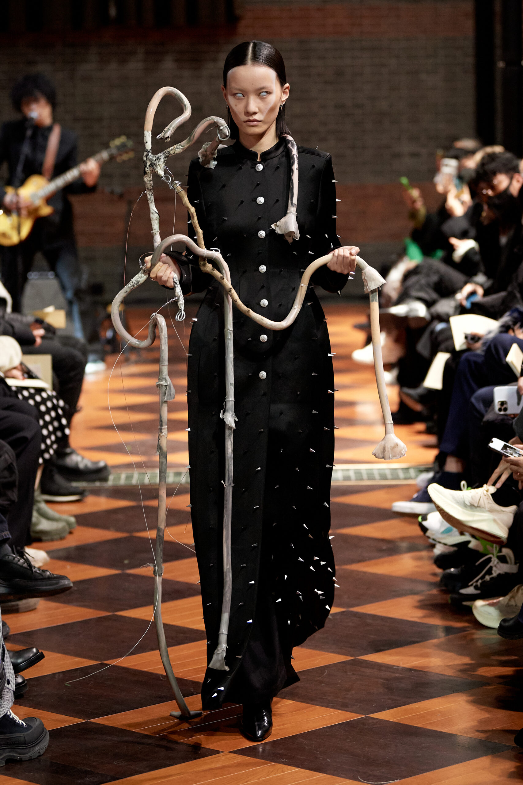 Les pièces de sculpture portées par les mannequins ont été créés par l’artiste Yuyu Wang. Ces formes organiques, réalisées en silicone, en plâtre et en résine, suscitent l’imagination de parties de corps humain, voire d’organes internes. En collaboration avec SANKUANZ, ces œuvres sont tenues en main ou enroulées autour du cou ou des membres des modèles, présentant une structure scénique composée d’objets corporels et bioniques, de parties artificielles et d’ « organes » évoquant une silhouette hybride.