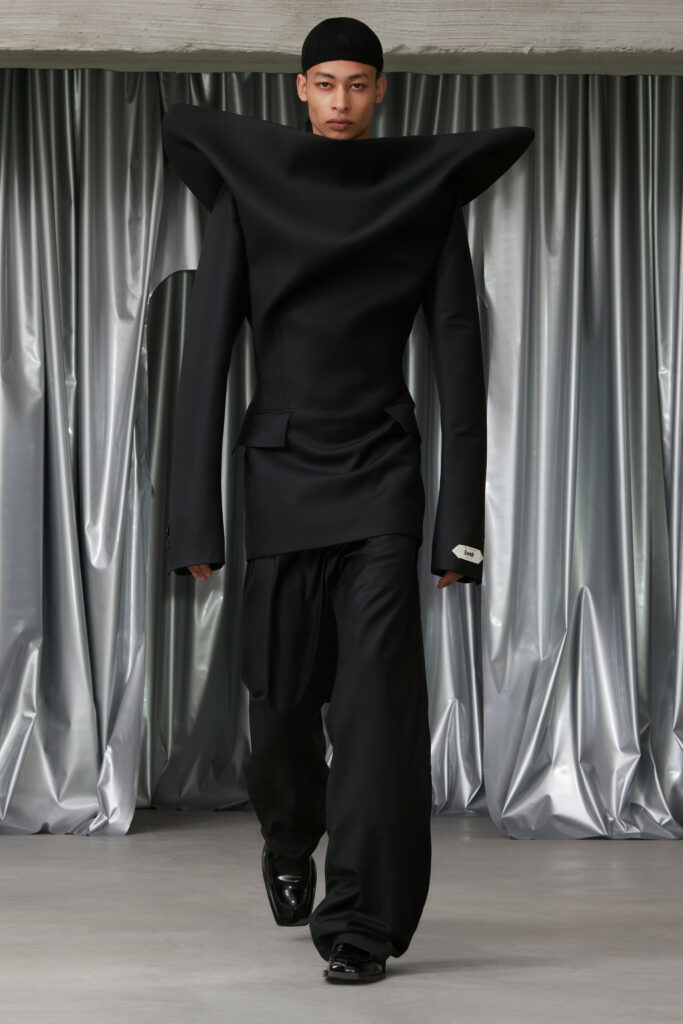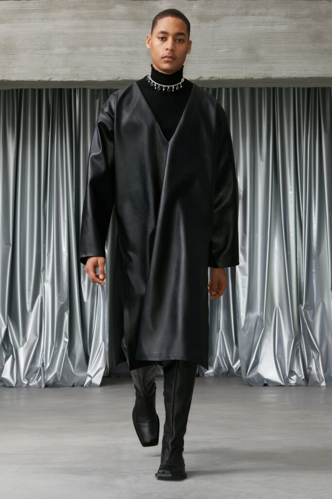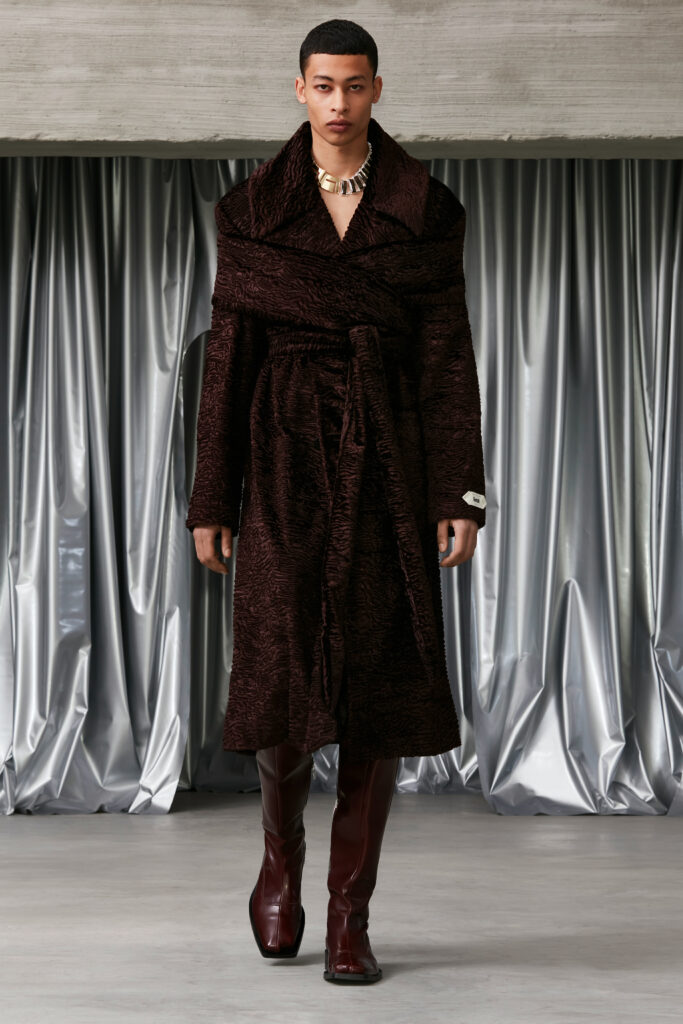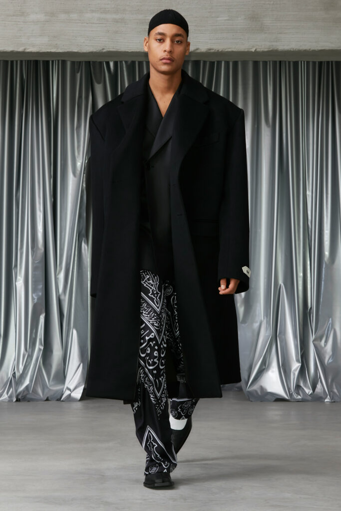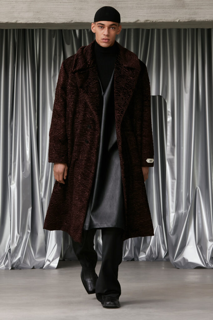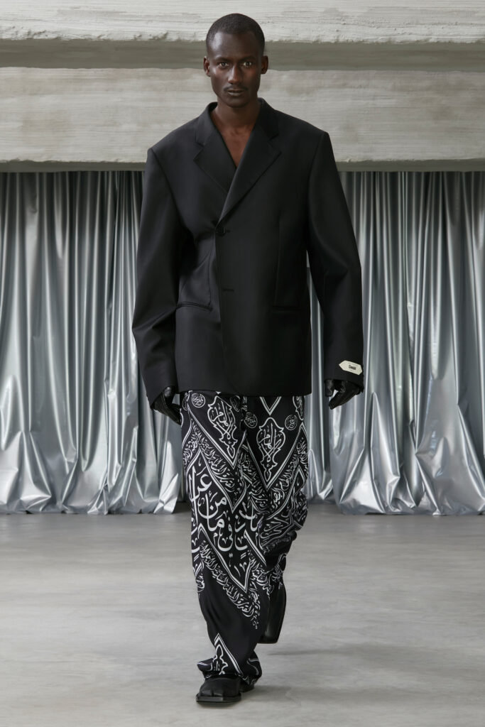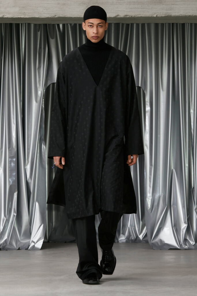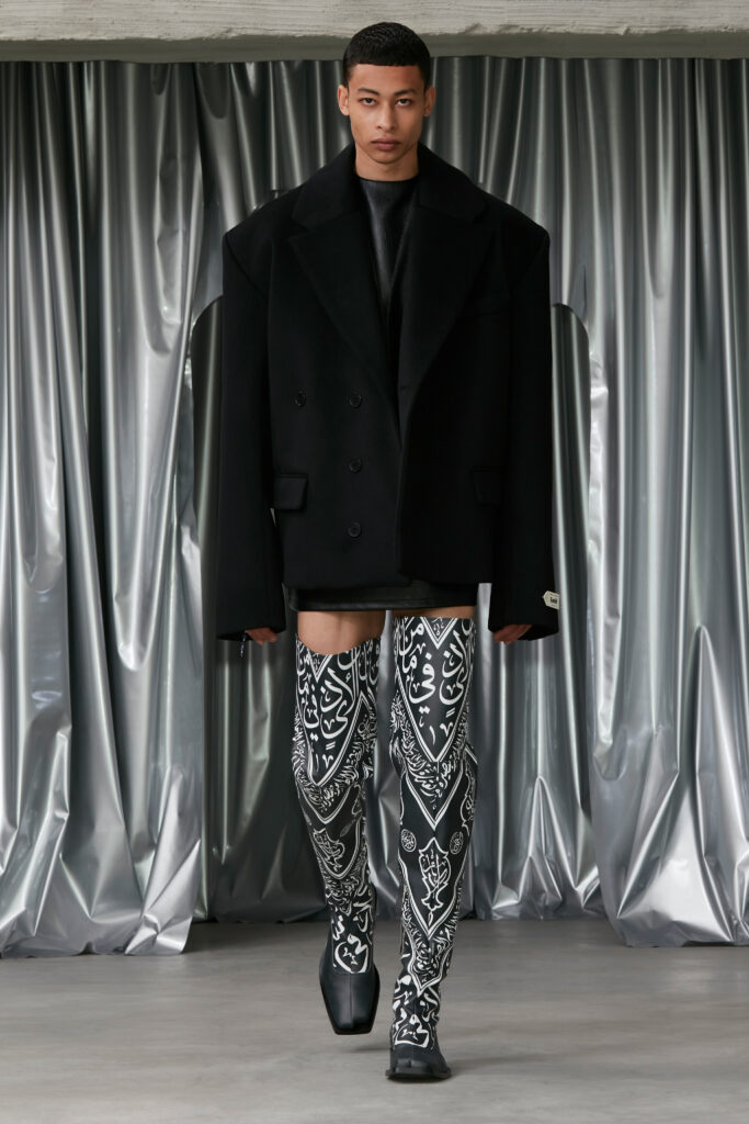 AUTOMNE 2022 a commencé par une exploration profondément personnelle de notre relation avec la religion, la couture et le sexe. Nous avons toujours parlé de la mode comme d’une sorte de protection, physique et spirituelle. La mode comme un bouclier. Nous sommes tombés sur les sous-vêtements d’un soldat ottoman du 16e siècle. Ces robes en soie destinées à être portées sous l’armure étaient recouvertes de calligraphies protectrices peintes à la main. Ce mélange de religion, de superstition et d’art nous a rappelé le grand-père de Serhat, qui écrivait ces écritures protectrices en arabe pour tous ceux qui en avaient besoin dans leur village en Turquie. Elles étaient normalement cachées dans des pendentifs en cuir (en turc muskas) ou cousues dans des sous-vêtements. Dans un rêve, les mots « Safe From Harm » (à l’abri du danger) nous sont apparus et sont devenus une affirmation que nous avons illustré sur une calligraphie arabe créée par l’artiste syrien Abdelrazak Shaballot et imprimée sur de la soie. Une autre piste de réflexion est notre étude des codes de l’habillement formel et religieux. Les caftans et tuniques associés à des bottes montantes deviennent des robes lorsqu’ils sont portés sans pantalon, exposant une partie de la chair sur le haut de la cuisse. Le faux astrakan provient de souvenirs de membres plus âgés de la famille, un matériau courant dans de nombreux pays musulmans. Tout comme la taqiyah, la calotte crânienne tricotée, également appelée kufi, topi ou takke selon les régions. D’autres codes vestimentaires traditionnels sont issus de l’étude des détails de la haute couture du milieu du siècle dernier. Des cols et des poignets exagérés en fourrure synthétique, des dos exposés ainsi que des bijoux conçus par Nhat-Vu Dang à partir d’un mélange de pierres et de bijoux de récupération plaqués en argent et en or. Le spectacle a été mis en scène et filmé dans l’atelier des architectes Brandlhuber+ à Berlin, avec un public