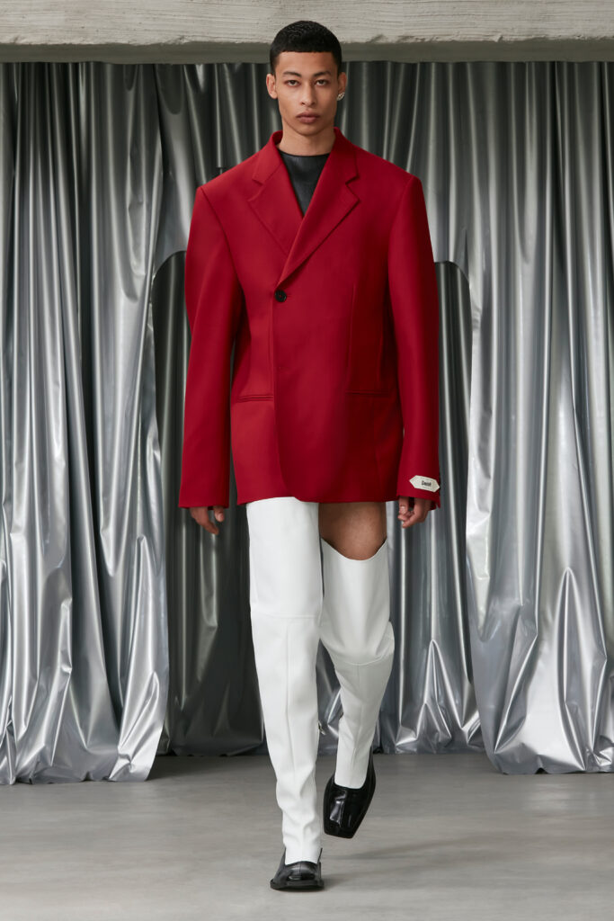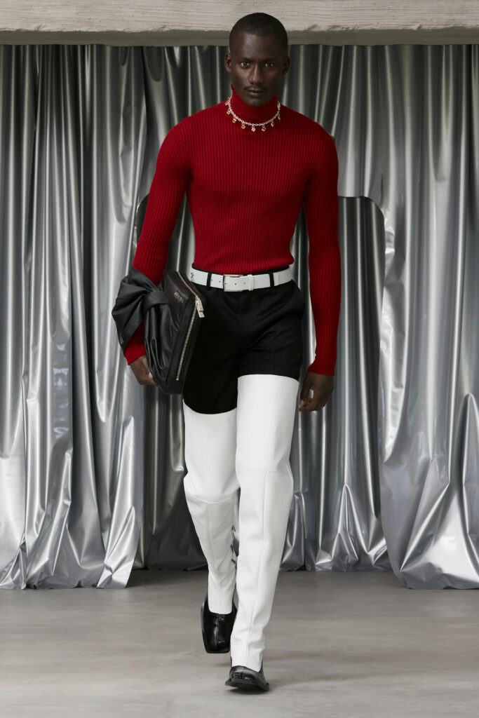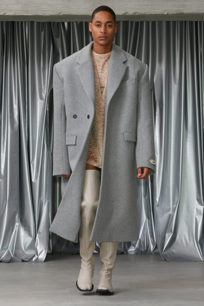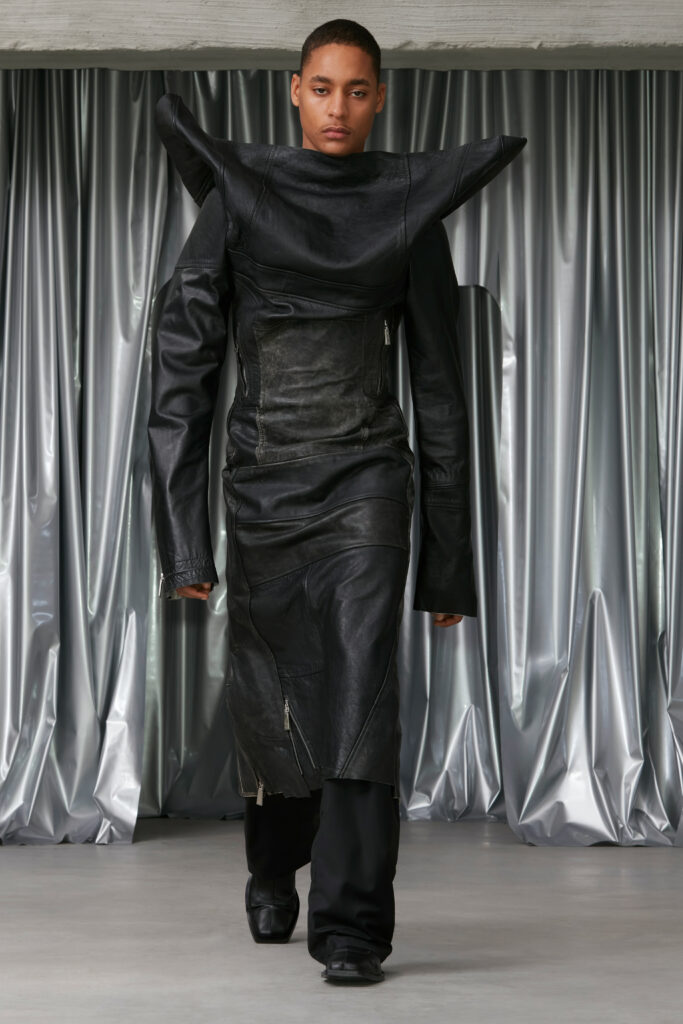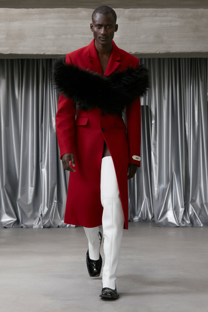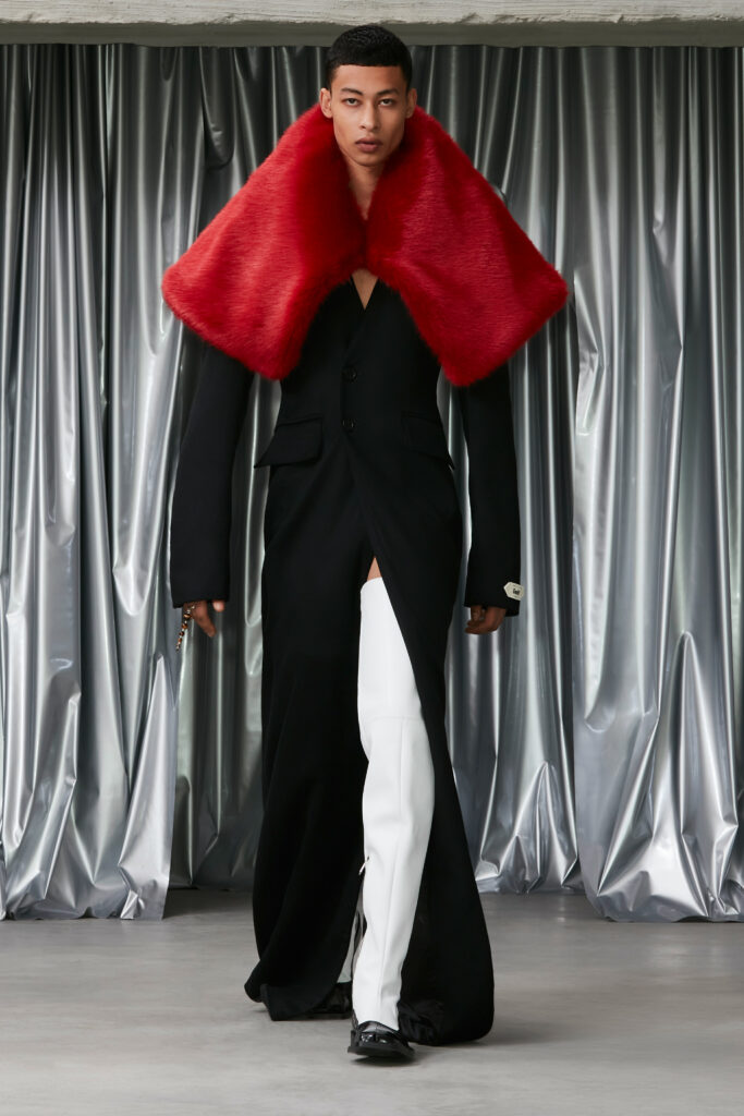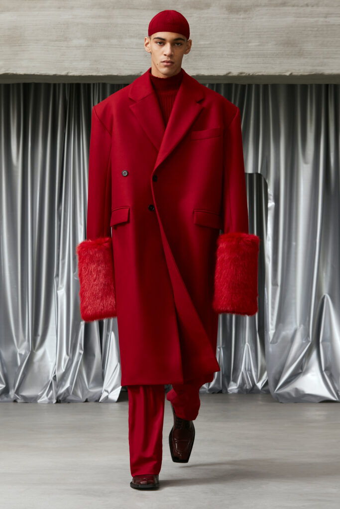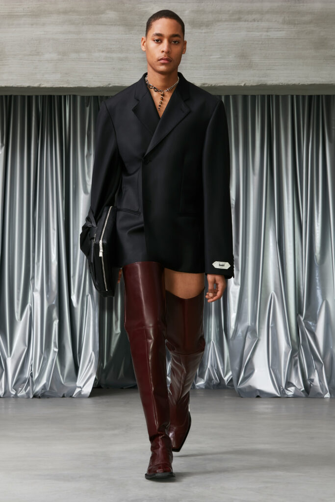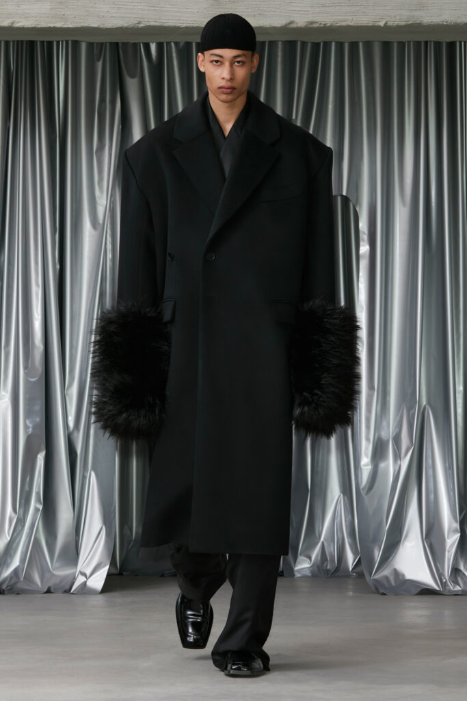 AUTOMNE 2022 a commencé par une exploration profondément personnelle de notre relation avec la religion, la couture et le sexe. Nous avons toujours parlé de la mode comme d’une sorte de protection, physique et spirituelle. La mode comme un bouclier. Nous sommes tombés sur les sous-vêtements d’un soldat ottoman du 16e siècle. Ces robes en soie destinées à être portées sous l’armure étaient recouvertes de calligraphies protectrices peintes à la main. Ce mélange de religion, de superstition et d’art nous a rappelé le grand-père de Serhat, qui écrivait ces écritures protectrices en arabe pour tous ceux qui en avaient besoin dans leur village en Turquie. Elles étaient normalement cachées dans des pendentifs en cuir (en turc muskas) ou cousues dans des sous-vêtements. Dans un rêve, les mots « Safe From Harm » (à l’abri du danger) nous sont apparus et sont devenus une affirmation que nous avons illustré sur une calligraphie arabe créée par l’artiste syrien Abdelrazak Shaballot et imprimée sur de la soie. Une autre piste de réflexion est notre étude des codes de l’habillement formel et religieux. Les caftans et tuniques associés à des bottes montantes deviennent des robes lorsqu’ils sont portés sans pantalon, exposant une partie de la chair sur le haut de la cuisse. Le faux astrakan provient de souvenirs de membres plus âgés de la famille, un matériau courant dans de nombreux pays musulmans. Tout comme la taqiyah, la calotte crânienne tricotée, également appelée kufi, topi ou takke selon les régions. D’autres codes vestimentaires traditionnels sont issus de l’étude des détails de la haute couture du milieu du siècle dernier. Des cols et des poignets exagérés en fourrure synthétique, des dos exposés ainsi que des bijoux conçus par Nhat-Vu Dang à partir d’un mélange de pierres et de bijoux de récupération plaqués en argent et en or. Le spectacle a été mis en scène et filmé dans l’atelier des architectes Brandlhuber+ à Berlin, avec un public