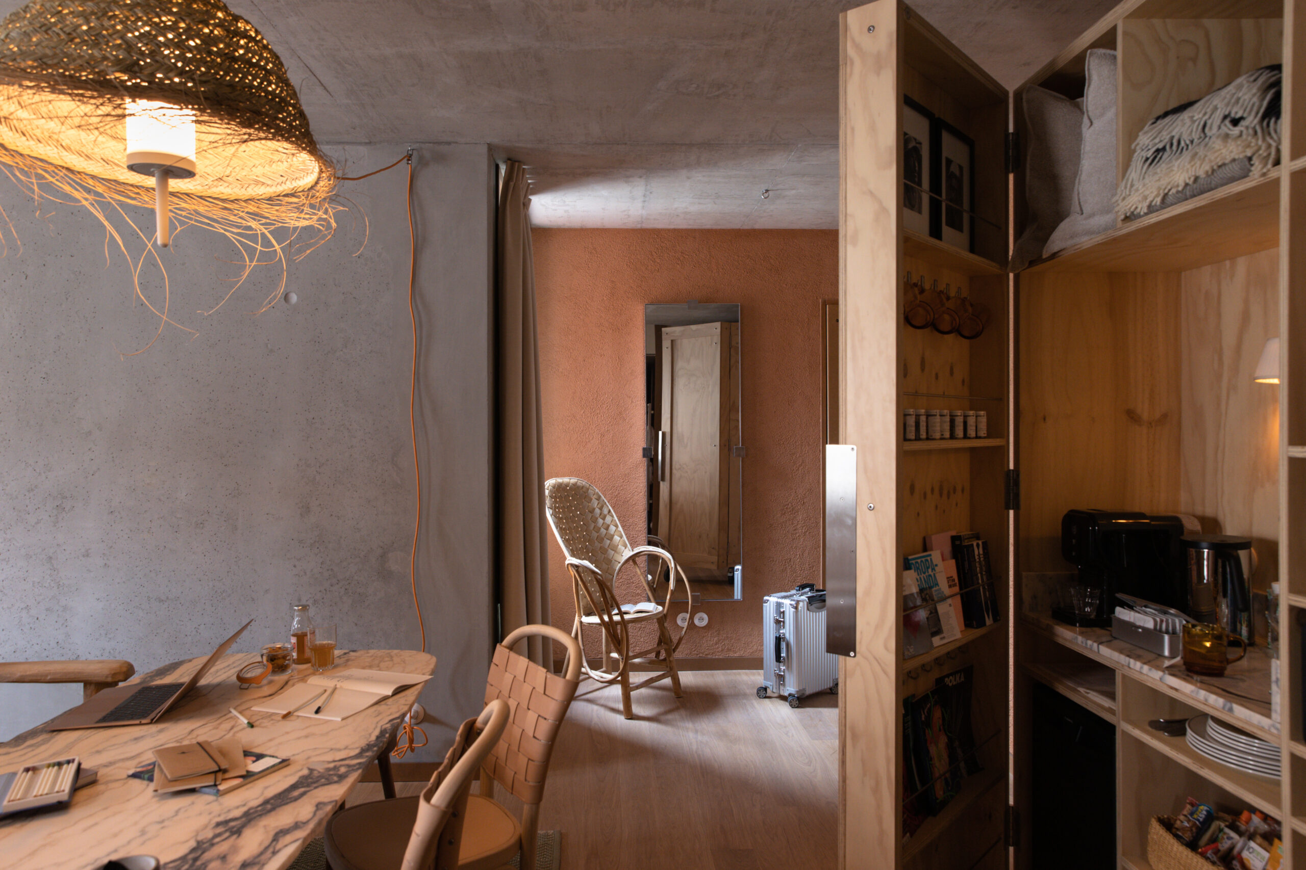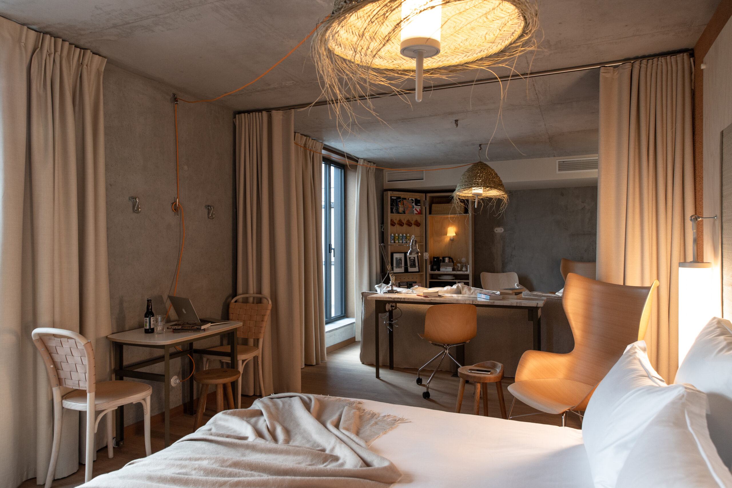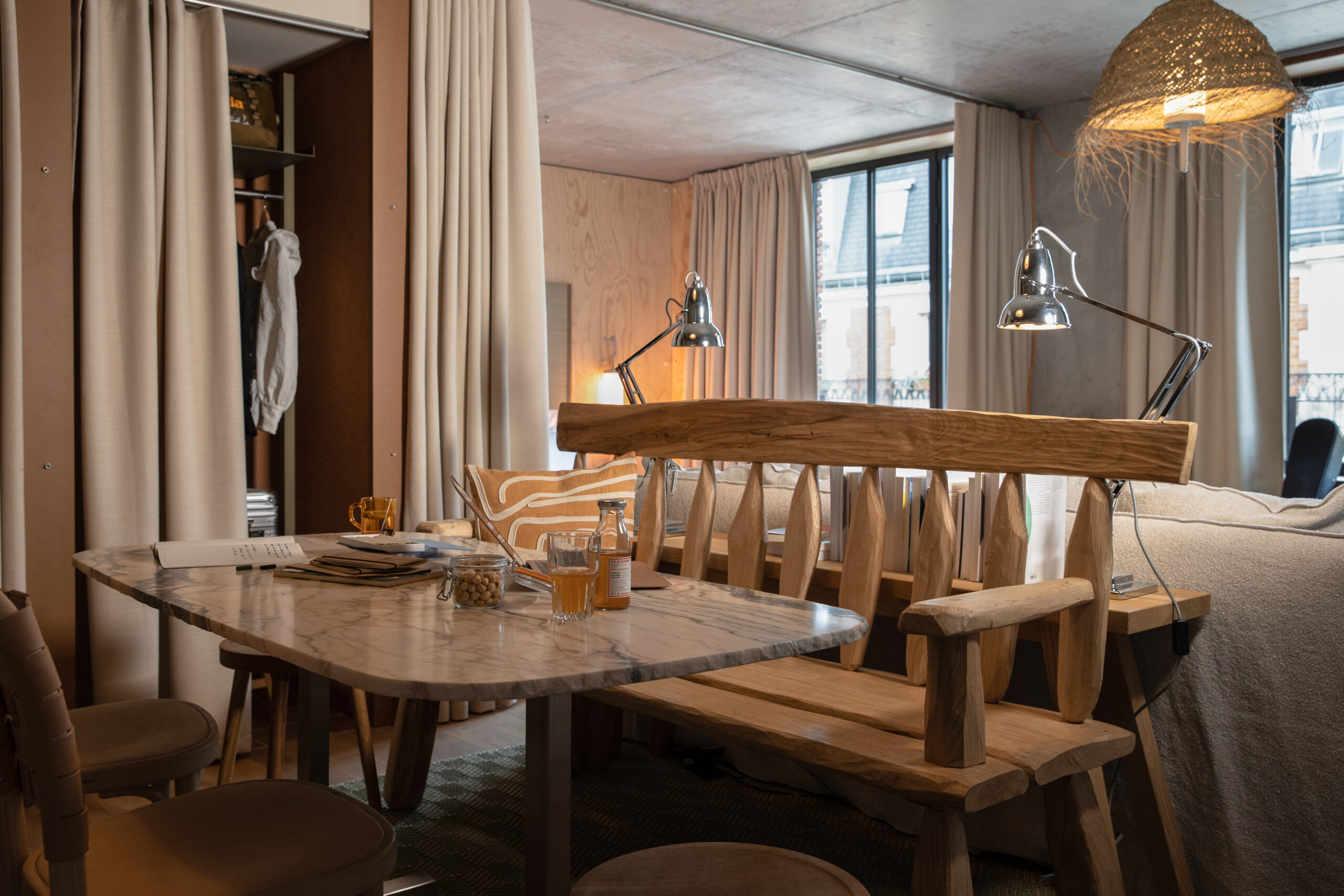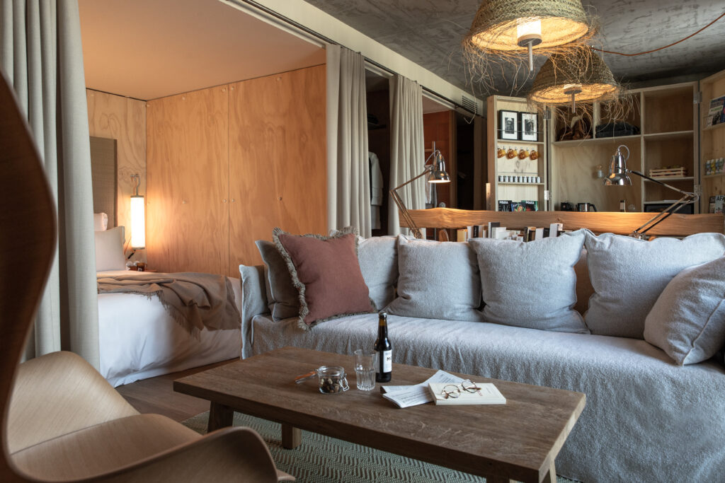 MOB HOUSE, c’est surtout le travail consacré au coeur même de l’errance et de l’hospitalité. Depuis la construction du bâtiment, privilégiant le savoir-faire d’artisans venus de France et d’Italie. Jusqu’à la cuisine ouverte, offrant à la vue des convives la confection des plats qu’ils vont déguster. Avec ses espaces dévolus au travailleur nomade, qui vient là pour une heure ou un rendez-vous, pour la journée ou le temps d’un déjeuner professionnel. Avec sa boutique proposant à la convoitise du visiteur et à l’achat du travailleur des objets de papeterie, de dessin ou d’écriture. Avec ses salles de conversations, accueillant des équipes venues là trouver le refuge, tout à la fois dépaysant, accueillant et stimulant, susceptible de les aider à réfléchir, laborer, produire ensemble leurs projets. Et puis, et peut être plus que tout, c’est dans » la chambre 3 en 1 » que la centralité du travail et de la production s’incarne au MOB HOUSE. C’est là que se croisent sans jamais se confondre, le travail et le repos, le professionnel et l’intime. C’est là que, pour le prix d’une nuit d’hôtel, l’entrepreneur voyageur dispose désormais, en un seul et même espace modulaire, d’une grande chambre, d’une authentique salle de réunion et d’un vrai bureau.