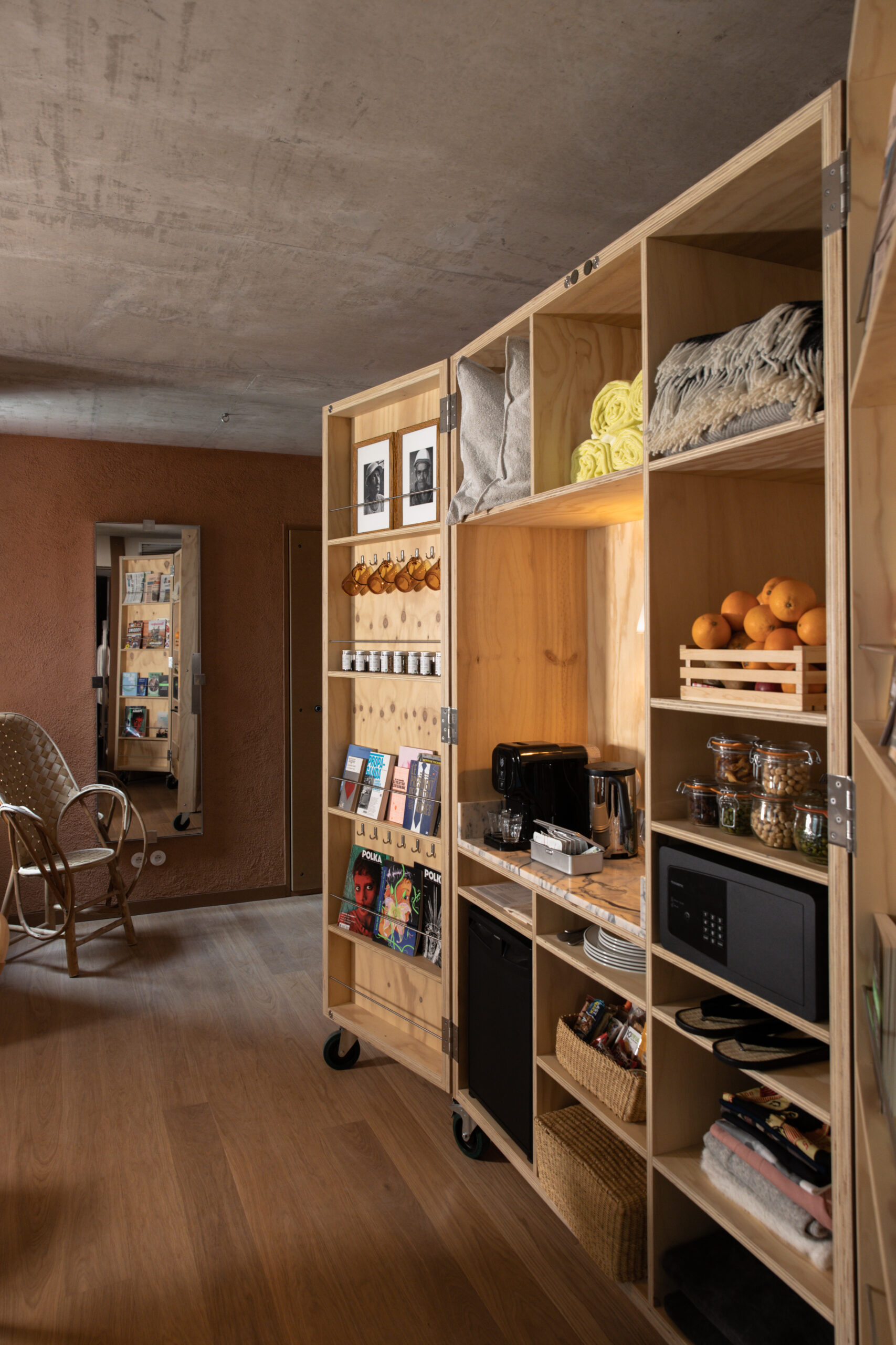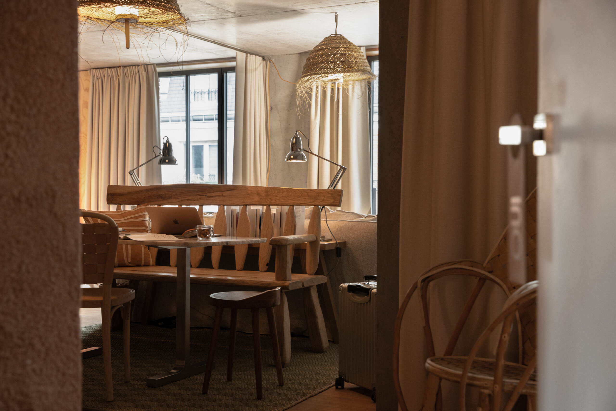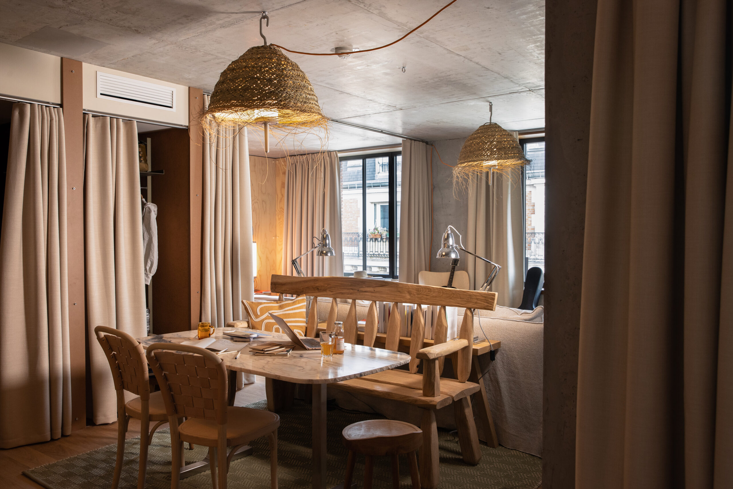 MOB HOUSE, c’est surtout le travail consacré au coeur même de l’errance et de l’hospitalité. Depuis la construction du bâtiment, privilégiant le savoir-faire d’artisans venus de France et d’Italie. Jusqu’à la cuisine ouverte, offrant à la vue des convives la confection des plats qu’ils vont déguster. Avec ses espaces dévolus au travailleur nomade, qui vient là pour une heure ou un rendez-vous, pour la journée ou le temps d’un déjeuner professionnel. Avec sa boutique proposant à la convoitise du visiteur et à l’achat du travailleur des objets de papeterie, de dessin ou d’écriture. Avec ses salles de conversations, accueillant des équipes venues là trouver le refuge, tout à la fois dépaysant, accueillant et stimulant, susceptible de les aider à réfléchir, laborer, produire ensemble leurs projets. Et puis, et peut être plus que tout, c’est dans » la chambre 3 en 1 » que la centralité du travail et de la production s’incarne au MOB HOUSE. C’est là que se croisent sans jamais se confondre, le travail et le repos, le professionnel et l’intime. C’est là que, pour le prix d’une nuit d’hôtel, l’entrepreneur voyageur dispose désormais, en un seul et même espace modulaire, d’une grande chambre, d’une authentique salle de réunion et d’un vrai bureau.