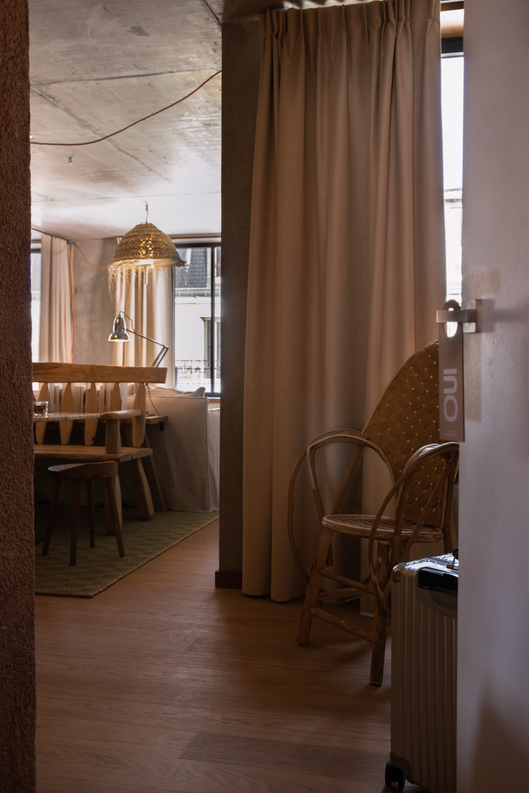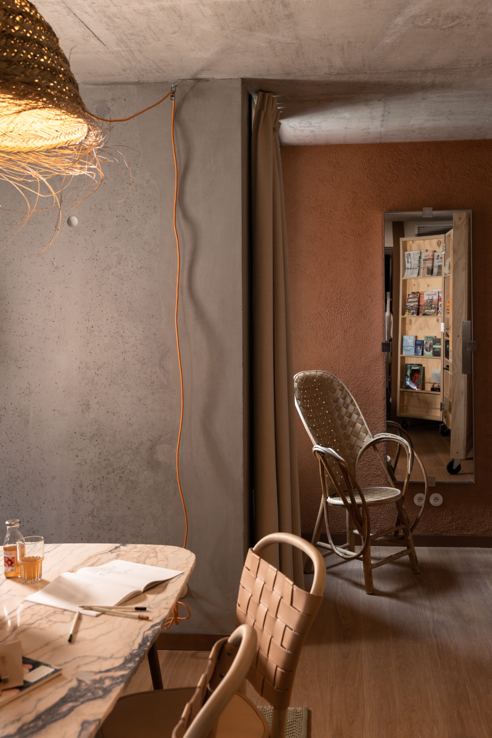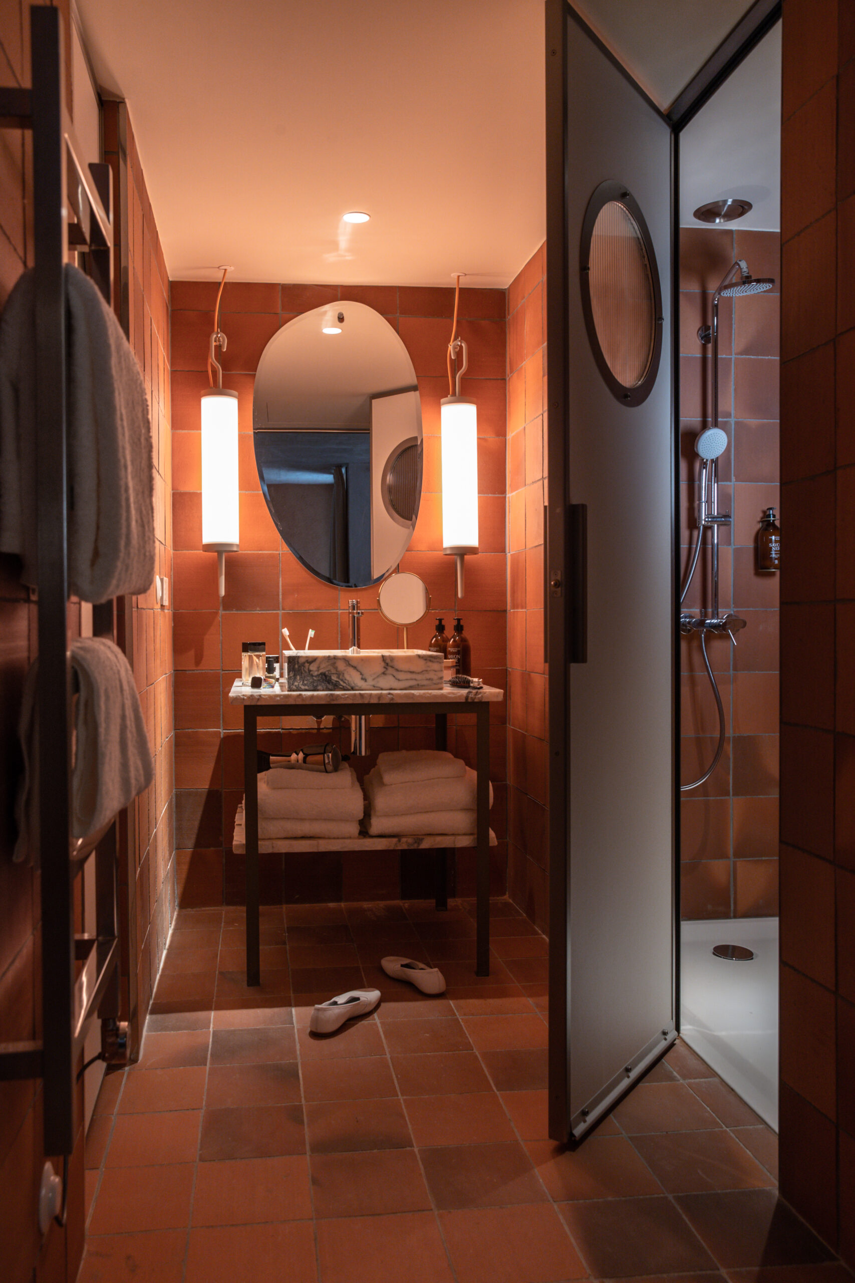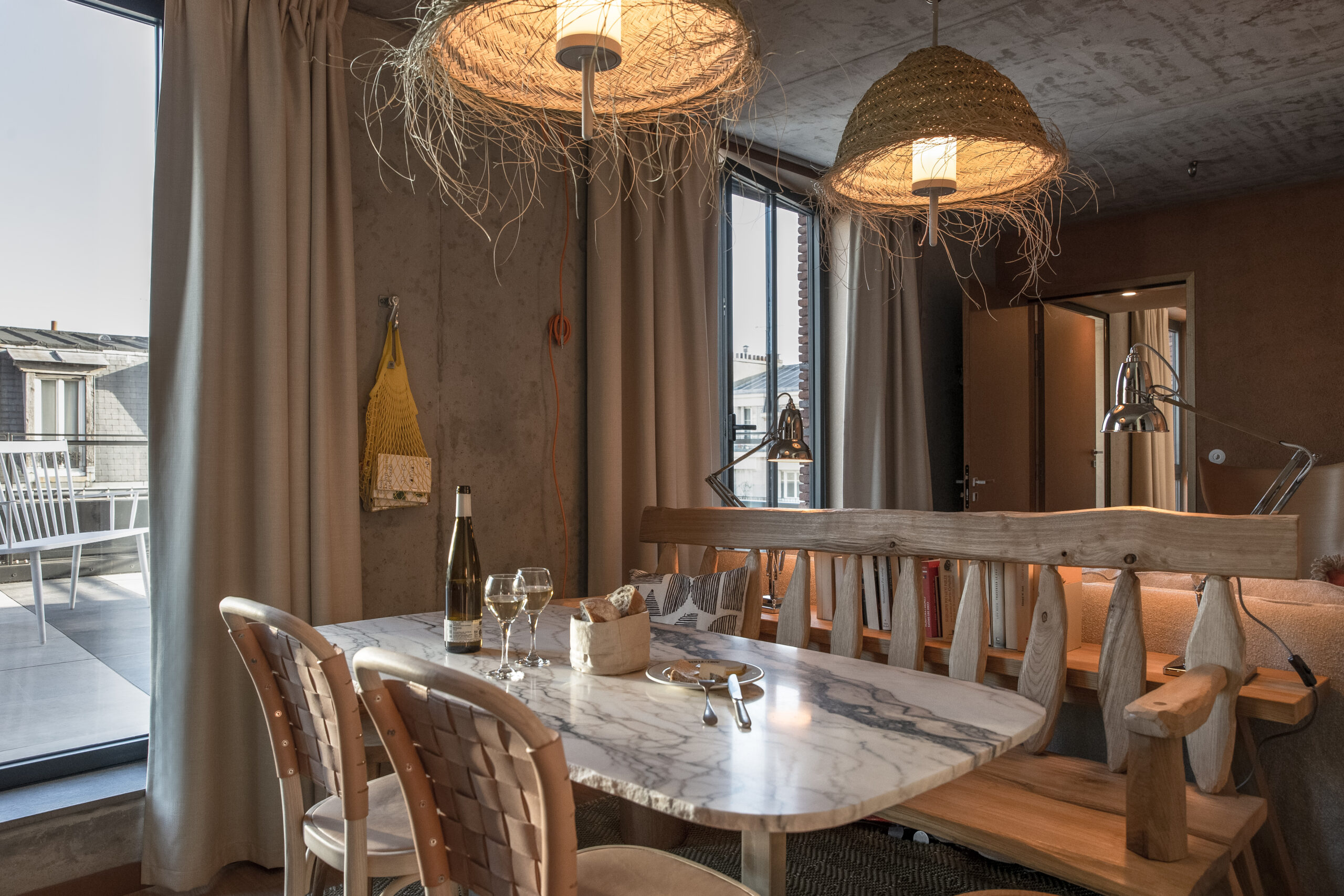 MOB HOUSE, c’est surtout le travail consacré au coeur même de l’errance et de l’hospitalité. Depuis la construction du bâtiment, privilégiant le savoir-faire d’artisans venus de France et d’Italie. Jusqu’à la cuisine ouverte, offrant à la vue des convives la confection des plats qu’ils vont déguster. Avec ses espaces dévolus au travailleur nomade, qui vient là pour une heure ou un rendez-vous, pour la journée ou le temps d’un déjeuner professionnel. Avec sa boutique proposant à la convoitise du visiteur et à l’achat du travailleur des objets de papeterie, de dessin ou d’écriture. Avec ses salles de conversations, accueillant des équipes venues là trouver le refuge, tout à la fois dépaysant, accueillant et stimulant, susceptible de les aider à réfléchir, laborer, produire ensemble leurs projets. Et puis, et peut être plus que tout, c’est dans » la chambre 3 en 1 » que la centralité du travail et de la production s’incarne au MOB HOUSE. C’est là que se croisent sans jamais se confondre, le travail et le repos, le professionnel et l’intime. C’est là que, pour le prix d’une nuit d’hôtel, l’entrepreneur voyageur dispose désormais, en un seul et même espace modulaire, d’une grande chambre, d’une authentique salle de réunion et d’un vrai bureau.