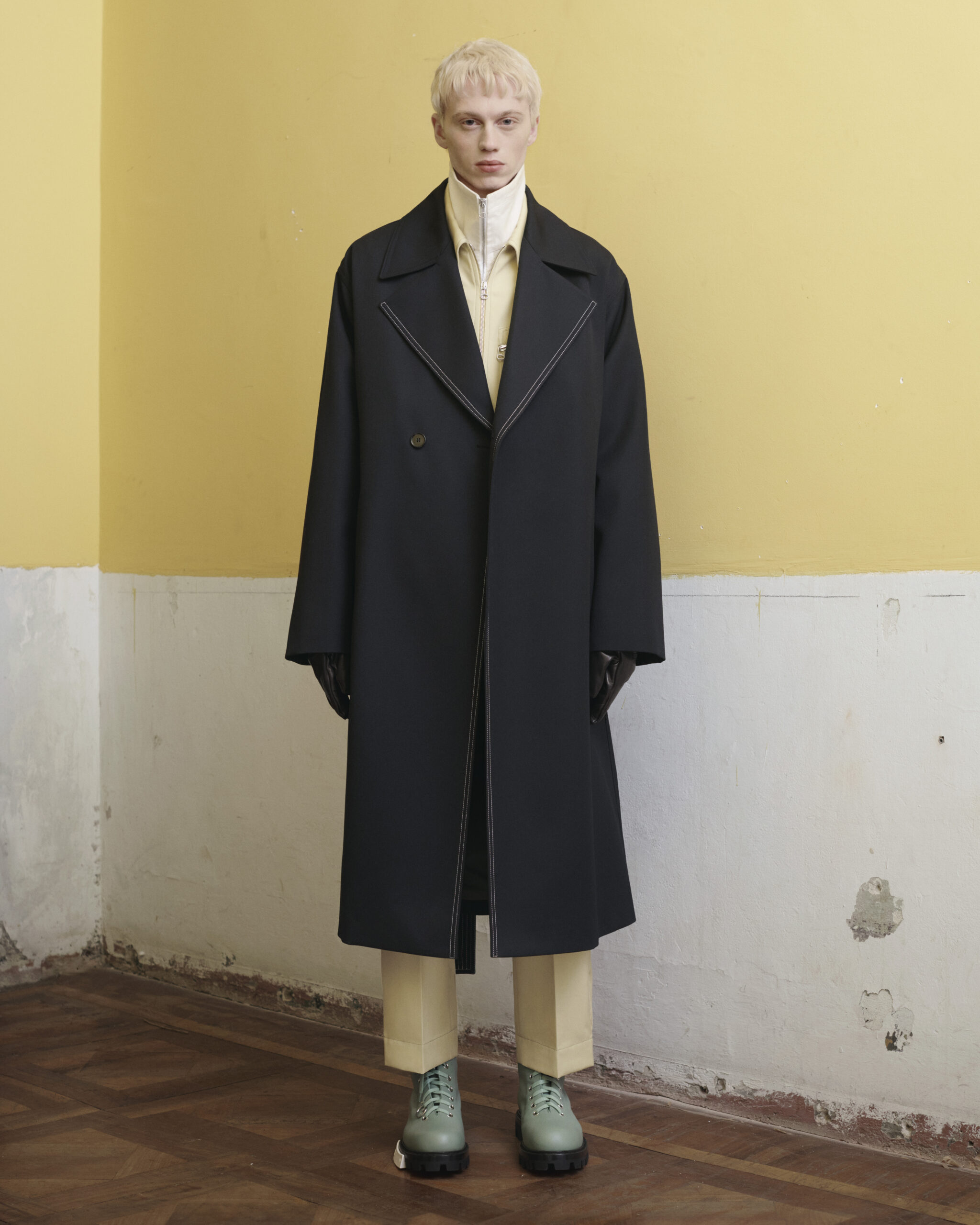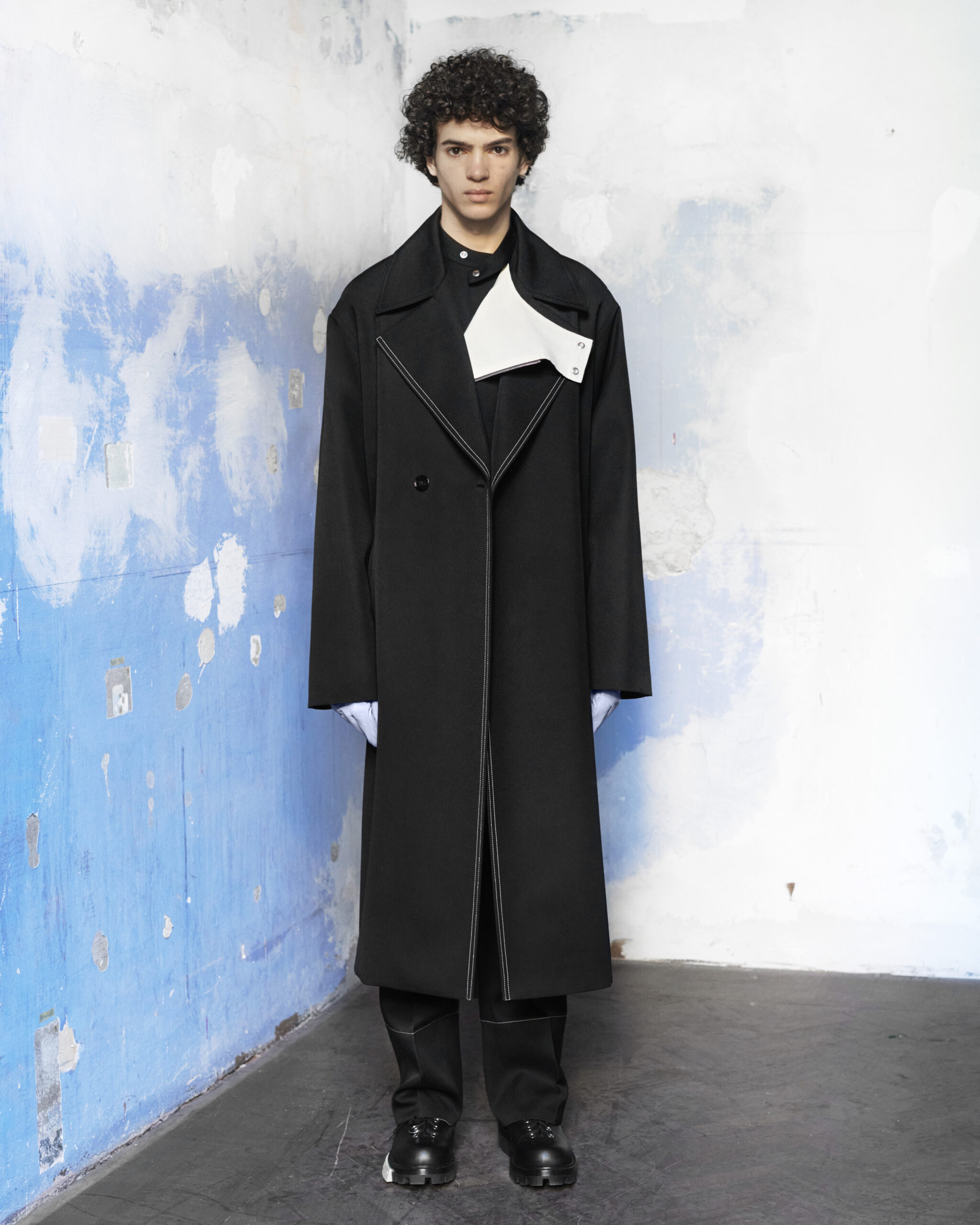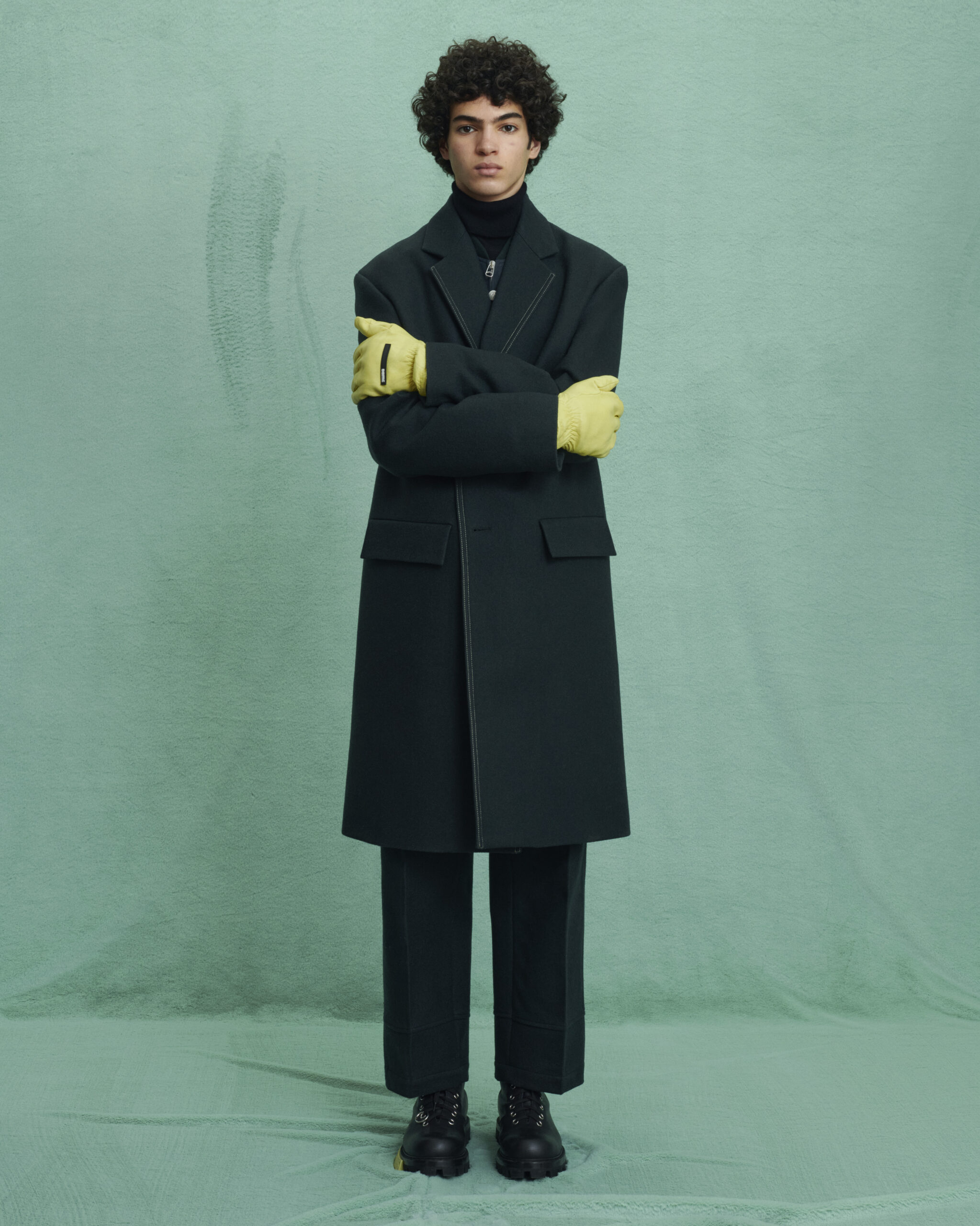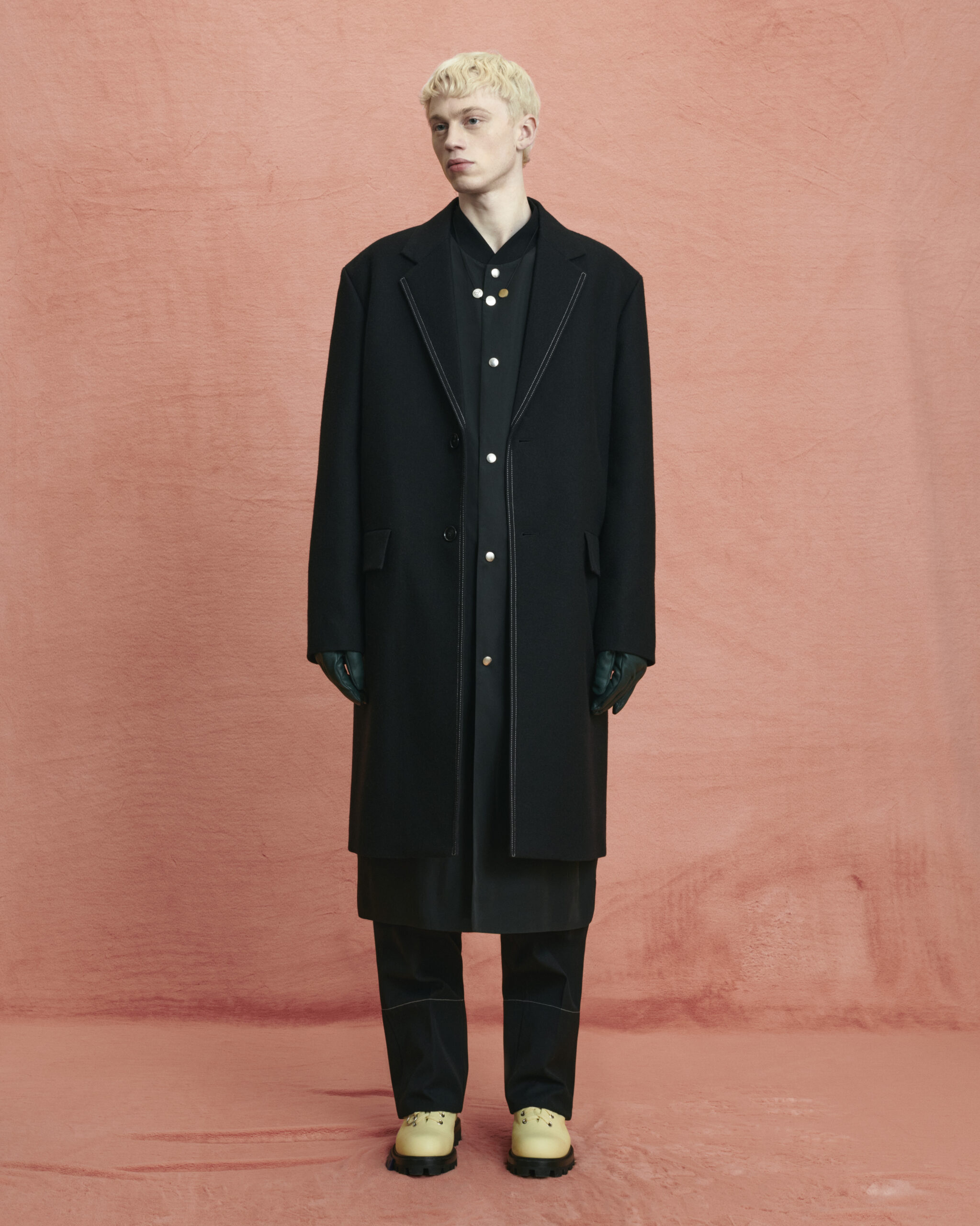 Fabrics are custom developed. Compat felted tailoring wools, spongy double-faced wool with a hammered texture, fluid viscose, quilted printed velvet, strong raw cotton gabardine, garment-dyed recycled nylon sergé and crisp cotton poplin, angular workwear recycled polyester. Soft nappa leather is padded and delicate, and curly shearlings add an inflated feeling to accessories. Boots and shoes are strong-soled, with soft leather uppers and few construction lines: pure, strong forms anchored by OAMC’s contrast outsole clip.