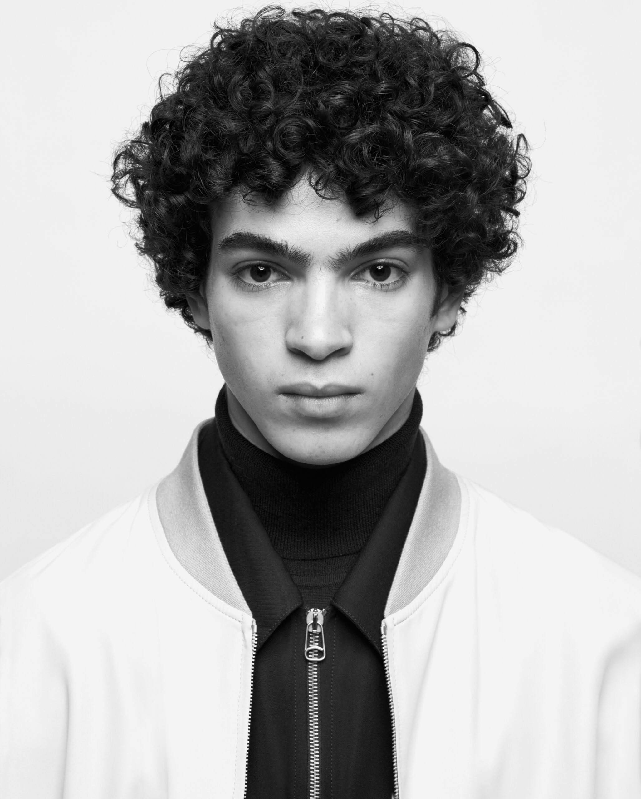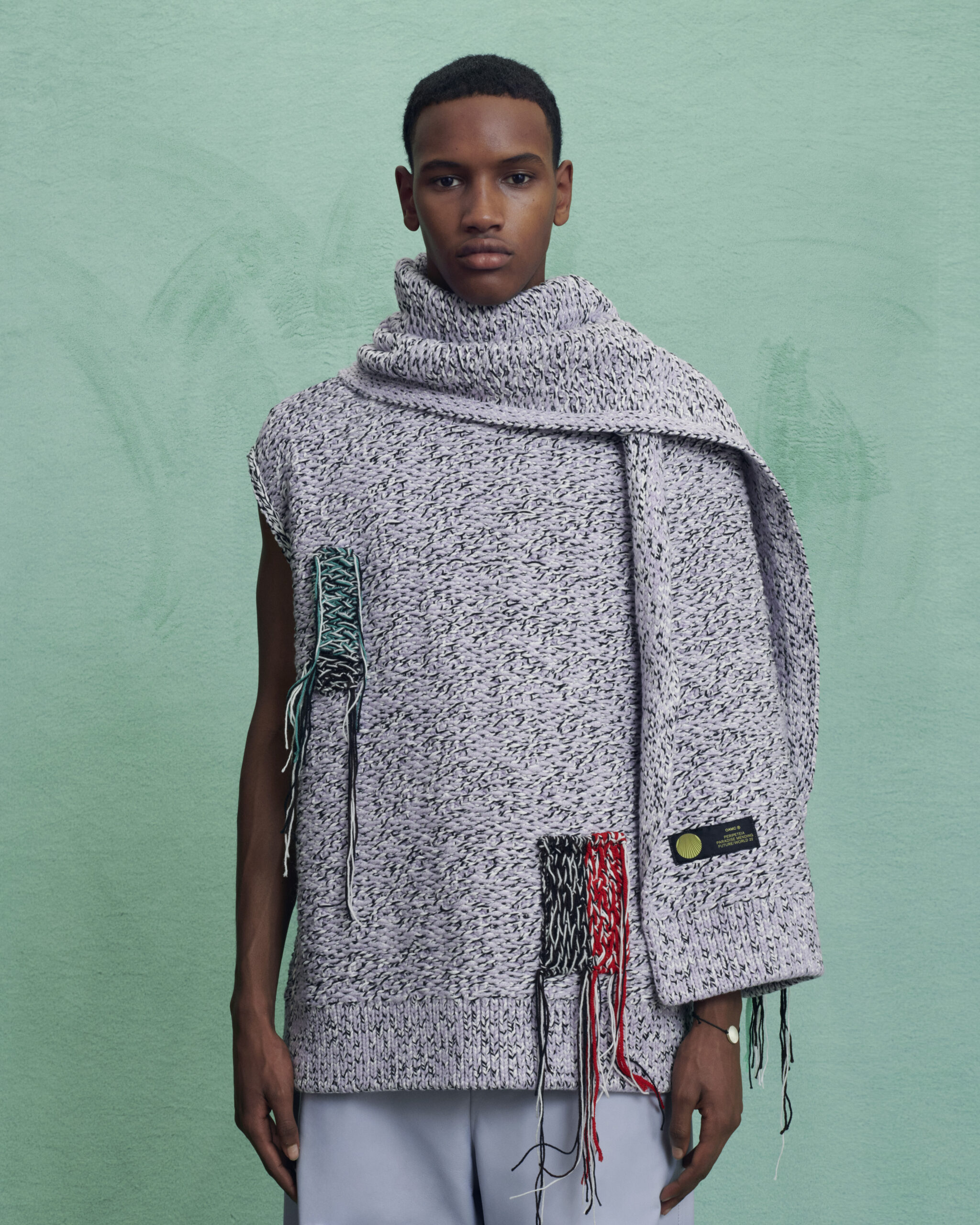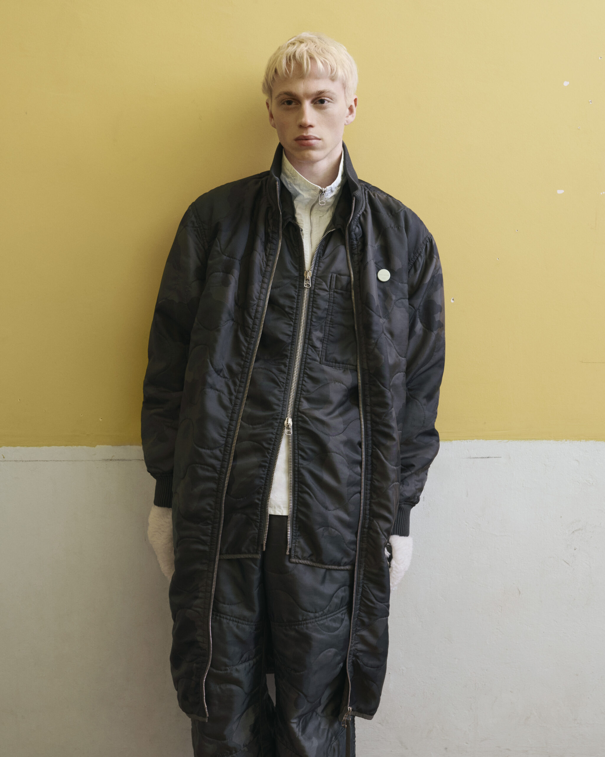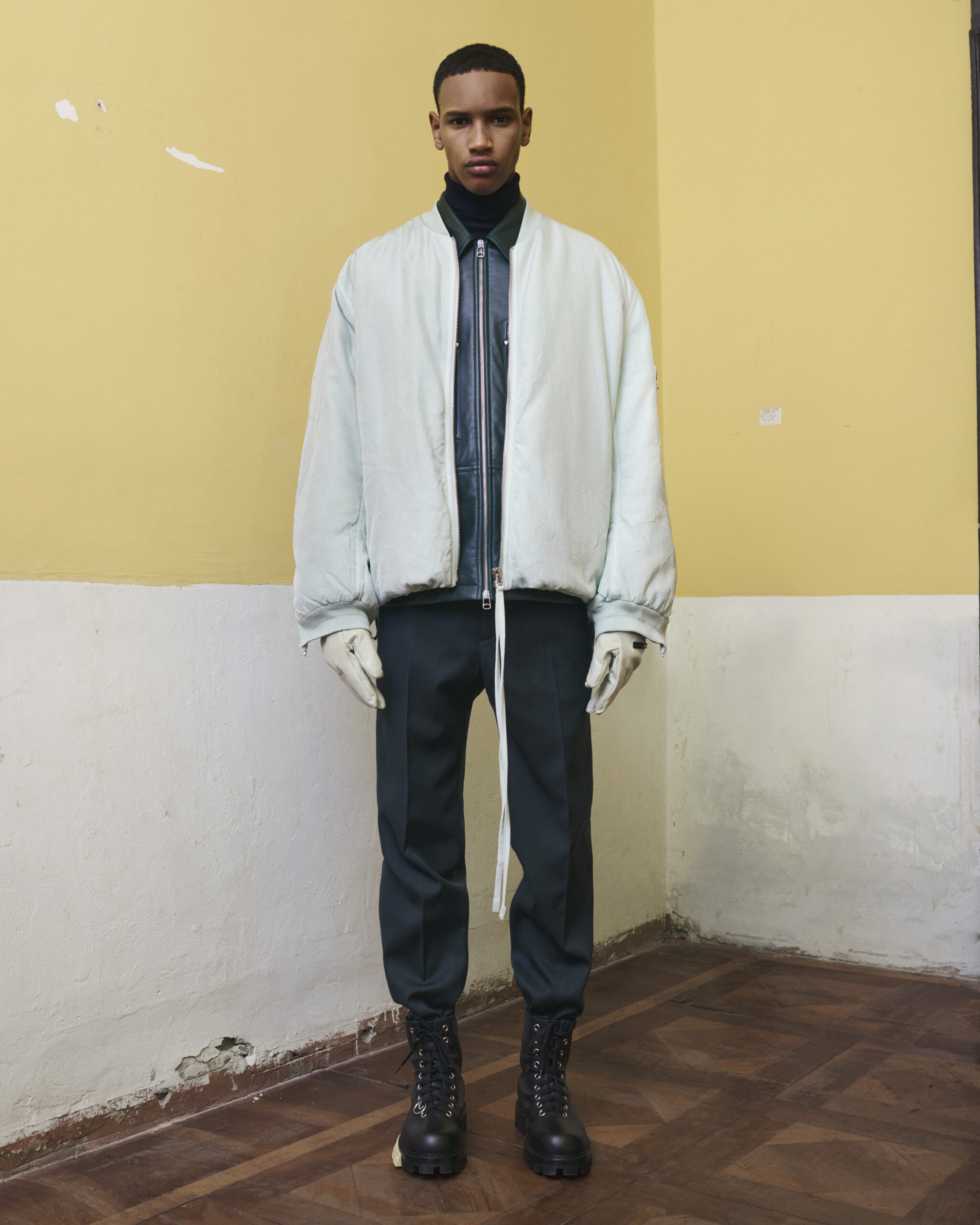 Fabrics are custom developed. Compat felted tailoring wools, spongy double-faced wool with a hammered texture, fluid viscose, quilted printed velvet, strong raw cotton gabardine, garment-dyed recycled nylon sergé and crisp cotton poplin, angular workwear recycled polyester. Soft nappa leather is padded and delicate, and curly shearlings add an inflated feeling to accessories. Boots and shoes are strong-soled, with soft leather uppers and few construction lines: pure, strong forms anchored by OAMC’s contrast outsole clip.