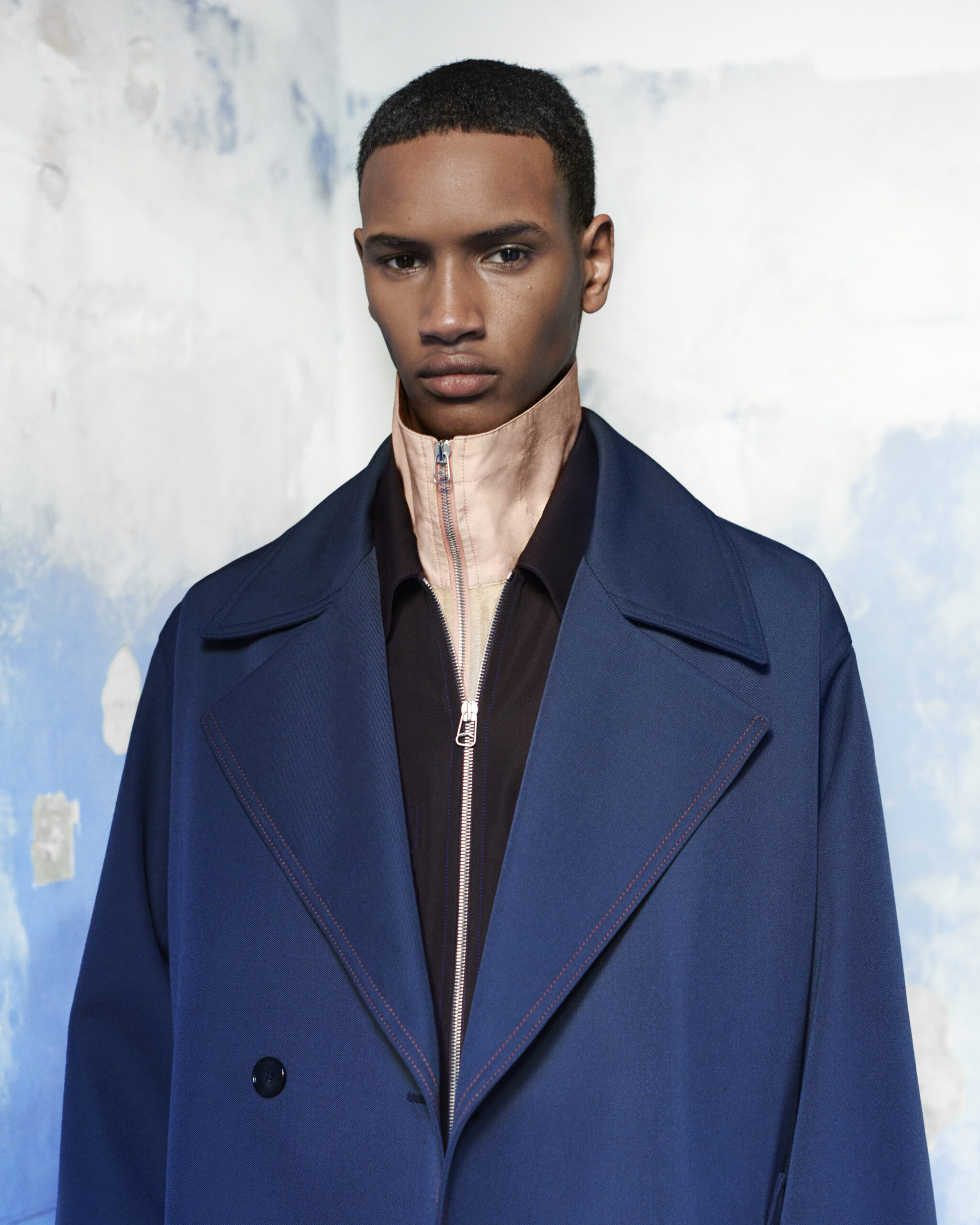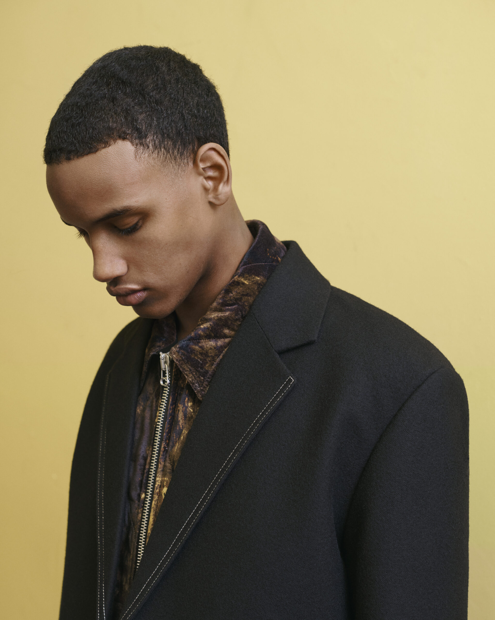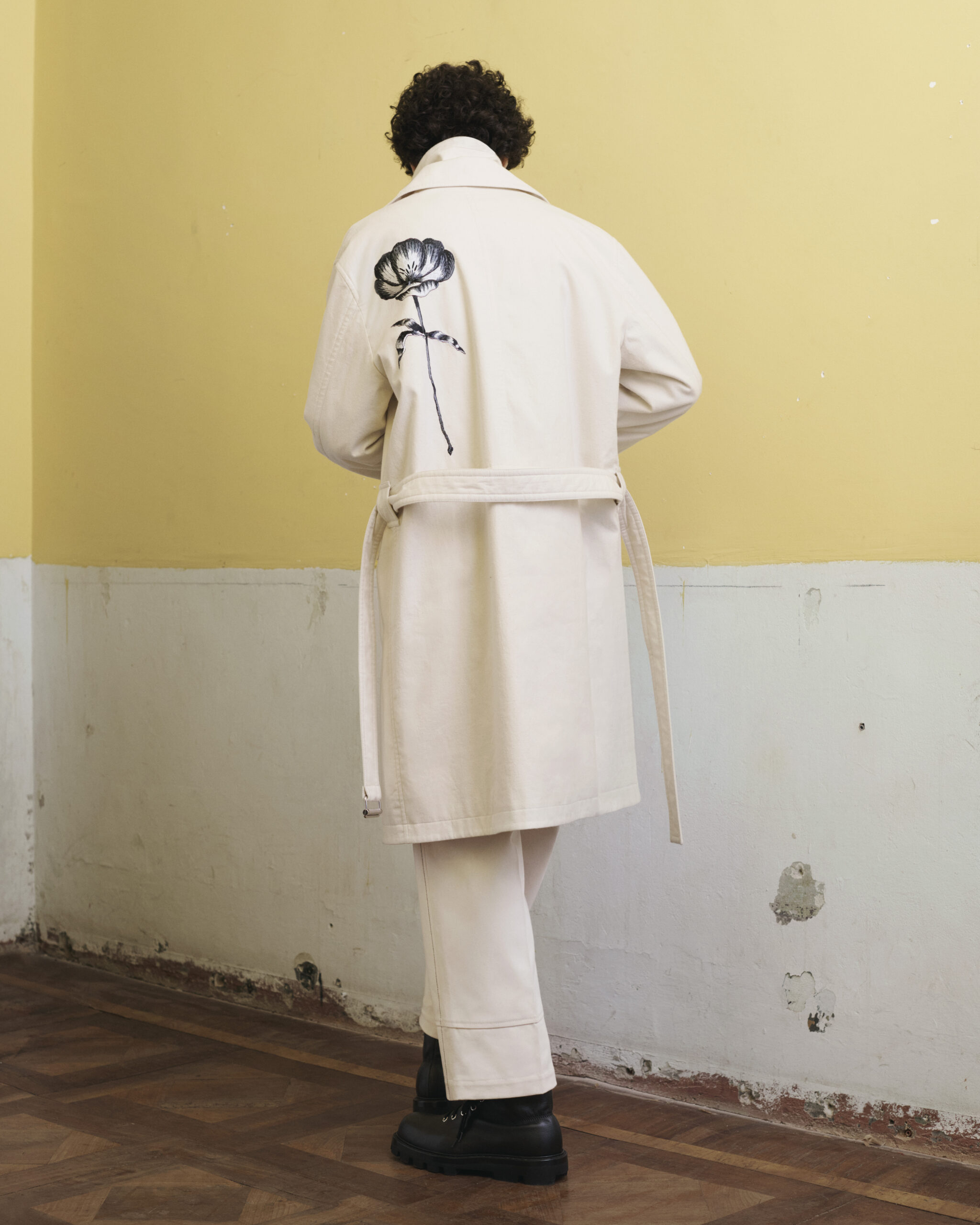 Nature through the human eye. What surrounds us and how it permeates our decision making and aesthetic. The magnitude of nature is always somewhere in the collective consciousness, and now, perhaps, more than ever. While our creations can never approach the perfection we find in the natural world, we are constantly working within a natural framework. Cotton, wool, shearling, leather, metal. The building blocks of the collection, which are manipulated and shaped to express the aesthetics and functionality that enhance our life. The Fall/Winter 2022 collection began as a study of nature: there is an aesthetic appreciation, and yet the demonstration of aesthetic in nature is always tied to function. Layers of tree bark and moss, floral colors and shapes, and watercolor motifs in the sky at dusk are reflected in man-made translations of functional garment patterning. Hand-knit undulating jacquards echo a jagged landscape, the trace of a human hand evident in the attached patchwork of contrast threads. Cold dye cottons, with their ‘maltinto’ effect, leave reminders of the water that flowed through the fabric. Direct embroideries, featuring singular flowers, add fragility to robust coats and jackets. A wool jacquard draws the strata of a rock face.