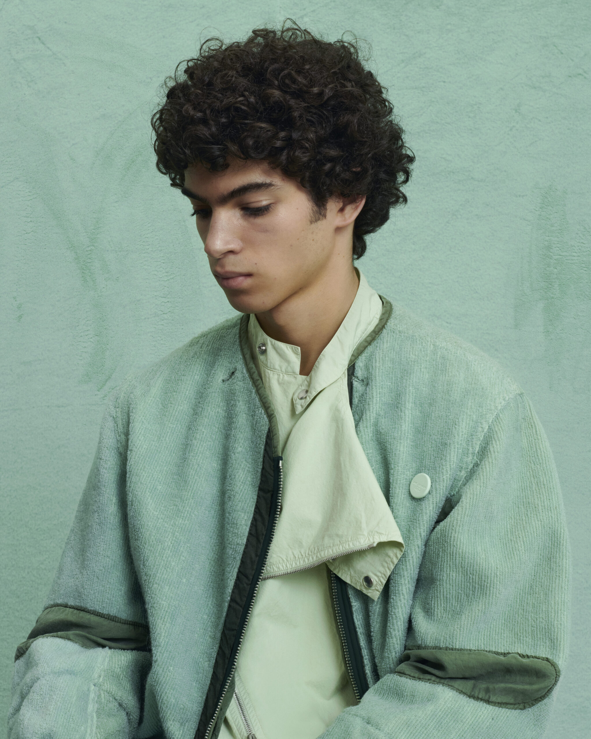 The second season of OAMC Re:Work amplifies the artisanal approach through dye, detail, and shape. There are no standardized patterns as each garment needs to be custom fit and adjusted in accordance to the shape of the original vintage piece. Ready-made items are taken apart, refitted, adjusted, constructed, and overdyed. The exploration of military field jacket liners has a strong presence; lined with wool and overdyed. New garment shapes are created using vintage military blankets printed with camouflage motifs, also overdyed. Wool liners are overdyed and re-shaped, and vintage Swiss military shirts and trousers are re-shaped and overdyed to create relevant forms.