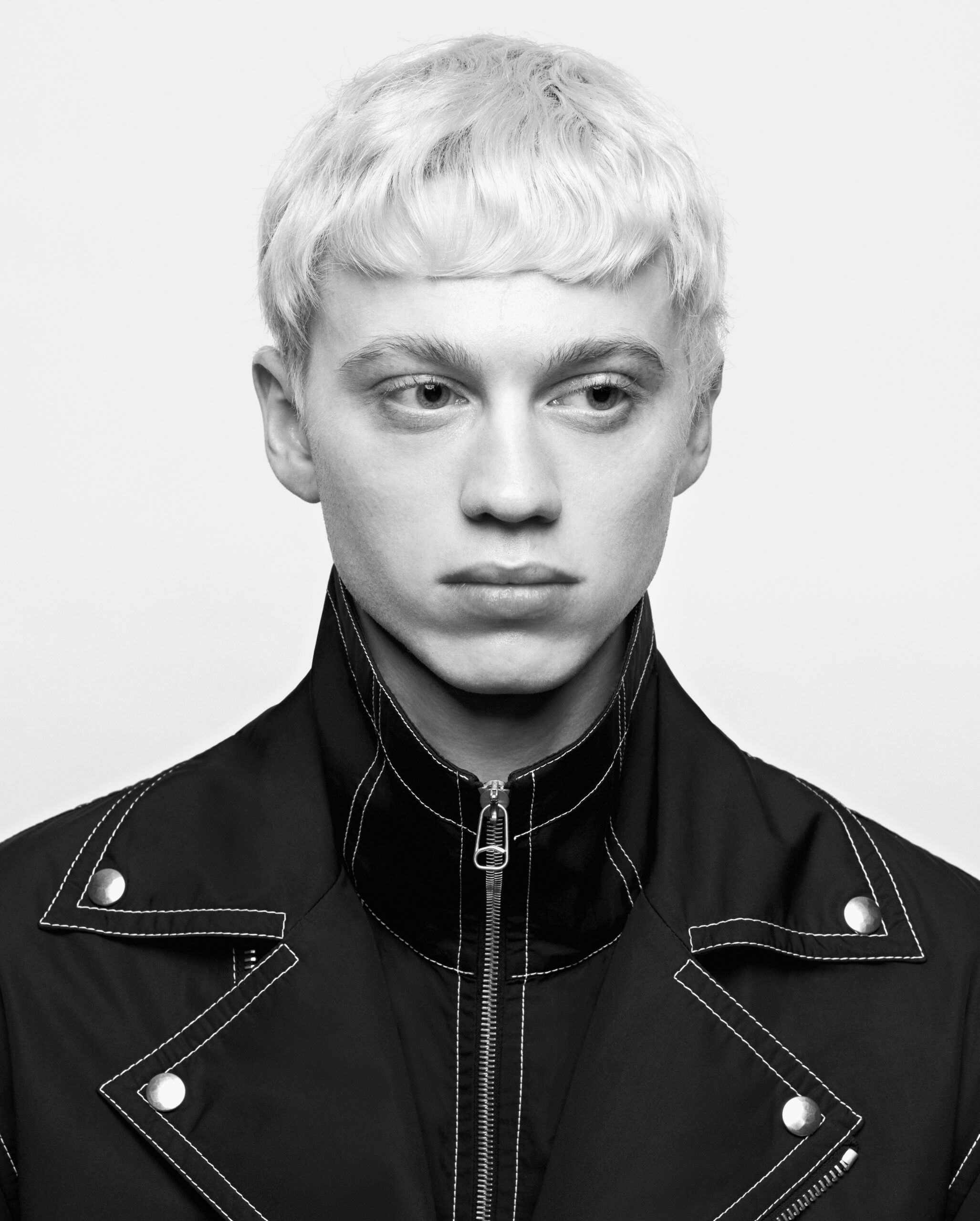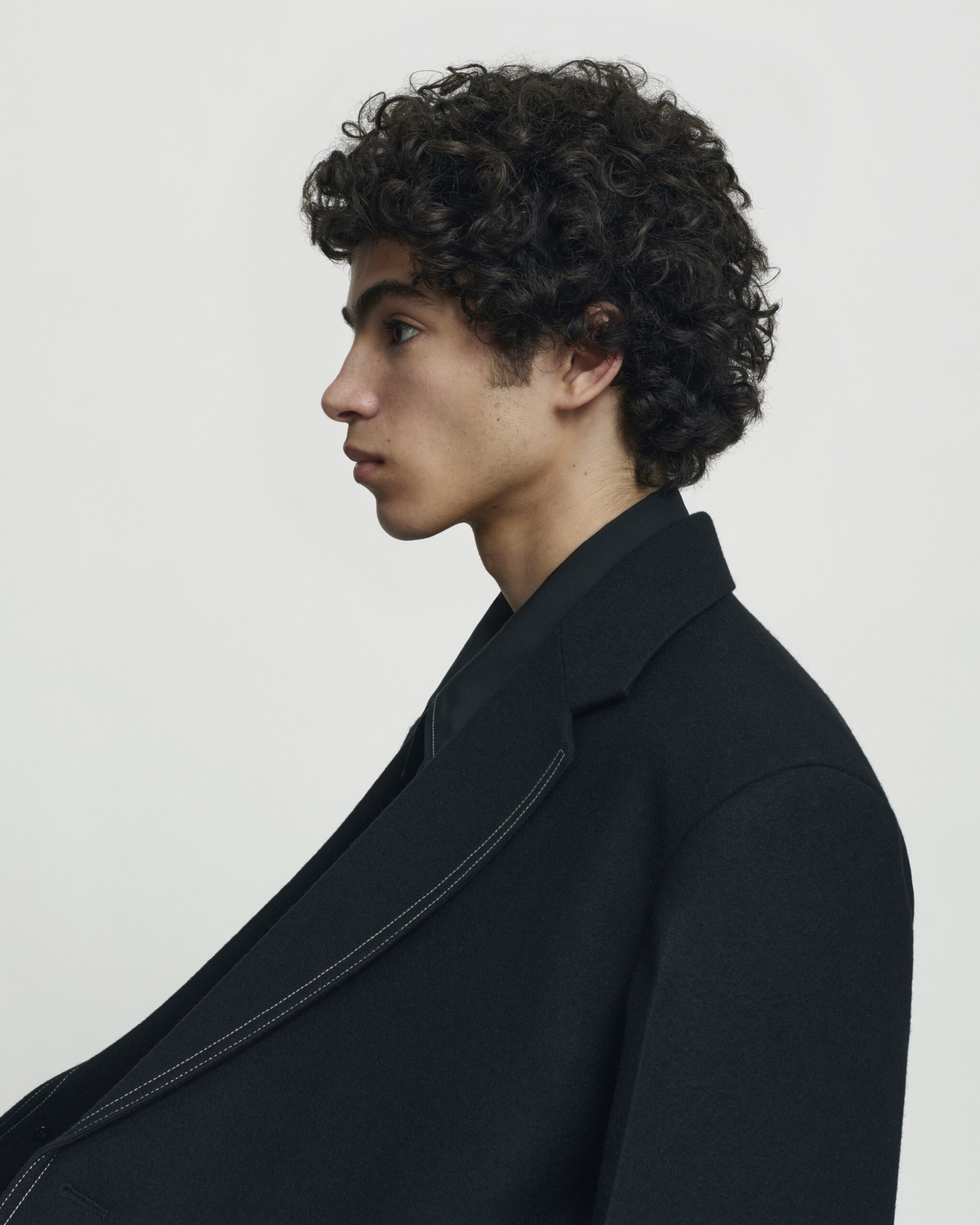 The silhouette is geometric, precise, and angular both in tailoring and pressed workwear shapes. Lines of contrast topstitching reinforce the form at the center front, adding elongation, or framing functional details as pockets and seamwork. Shirt overlaps petal over lapels and front openings, stovepipe stand collars give structure while extending high on the neck. Round, pillowy down coats, with and without utility pocketing, in leather or in recycled nylon, create both comforting softness and substantial volume.