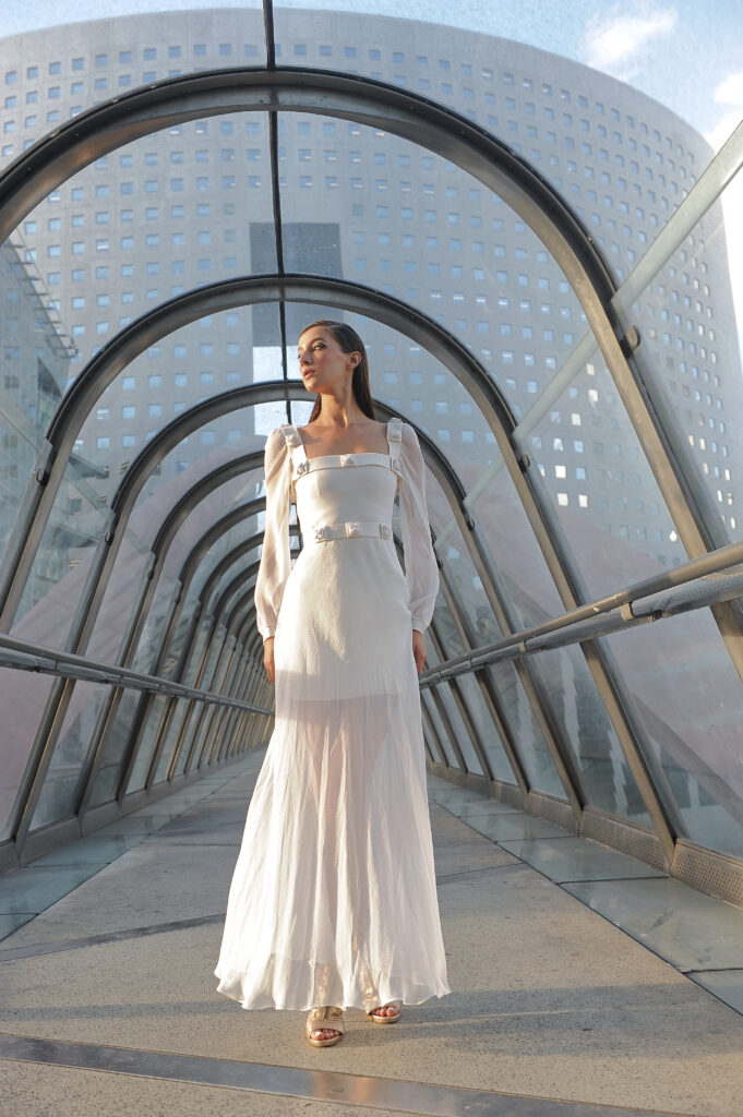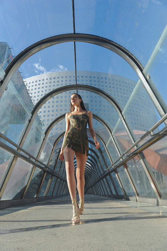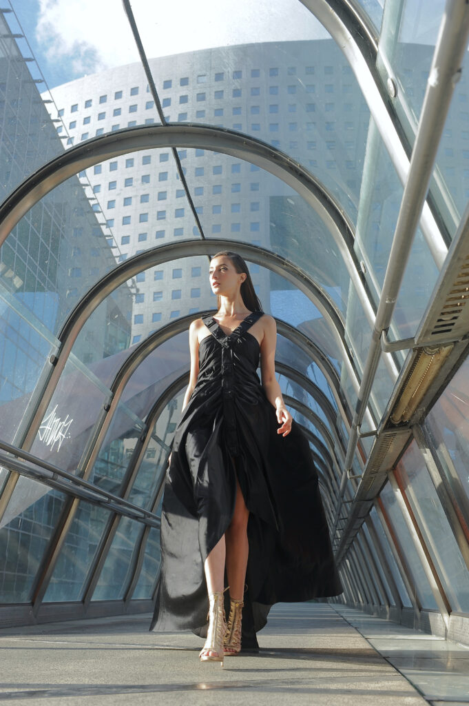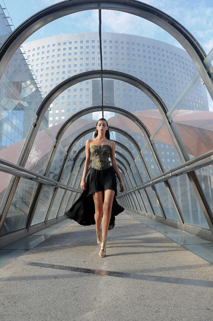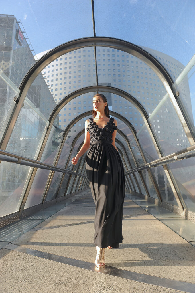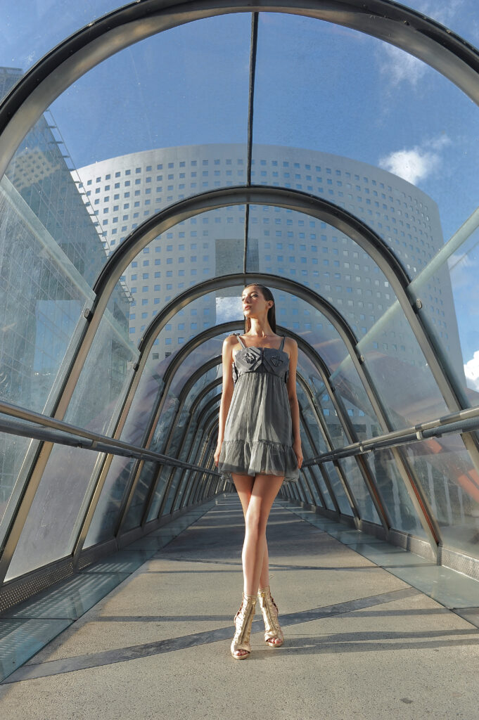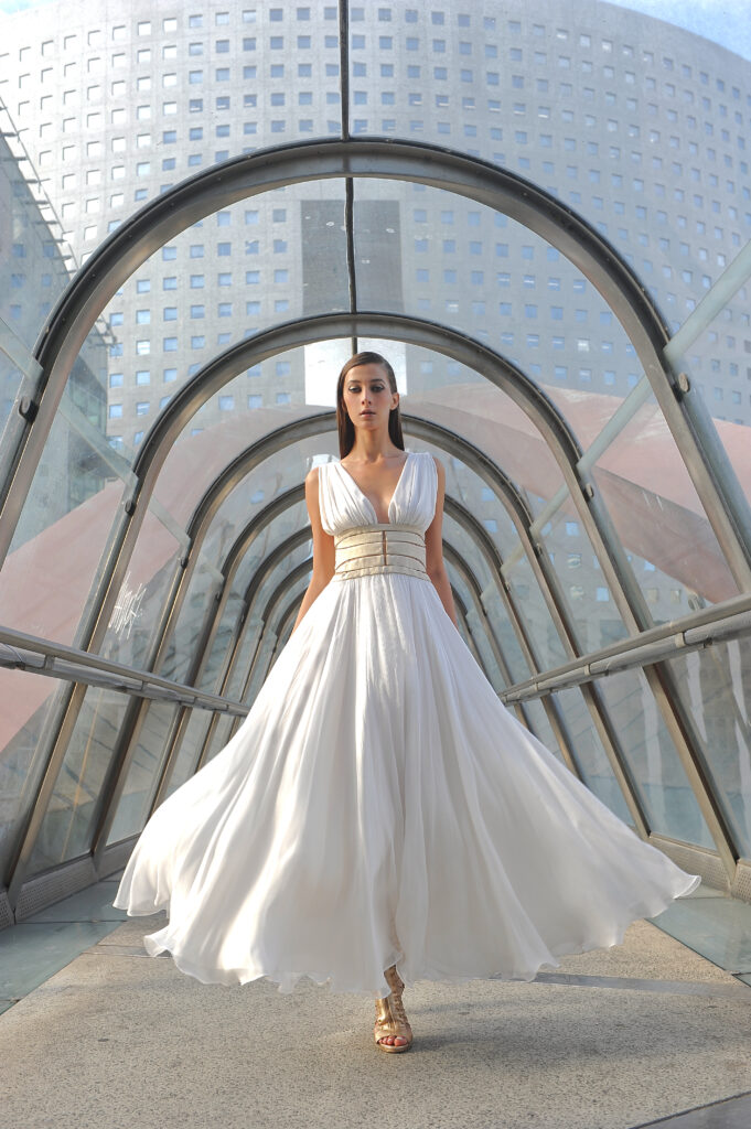 Suite attendue de la collection couture, Farhad Re présente sa première collection Prêt-à-Porter. On retrouve la femme guerrière et conquérante, signature du créateur, dans des robes 100% chiffon et tulle de soie. Les détails très travaillés attestent de la volonté de haut de gamme de Farhad, tels les carrés en organza de soie, découpés et pliés à la main pour former une fleurs, détail que l’on retrouve sur la collection couture. À noter que les teintures de la collection – vert, bleu, rose – sont 100 % écologiques et spécialement élaborées pour cette collection, lui conférant un caractère unique. Les armures or créées pour la couture ont été ici déclinées en ceinture, en bustier et en robe. Une collection volontairement sexy, aux fentes vertigineuses, qui ne sont pas sans rappeler les toges des femmes de l’antiquité romaine. La fluidité contraste avec la rigidité des armures or et des ceintures en fleurs d’organza. Une femme consciente que la terre est fragile et que la réponse à toutes nos questions se trouve au-delà de notre planète.