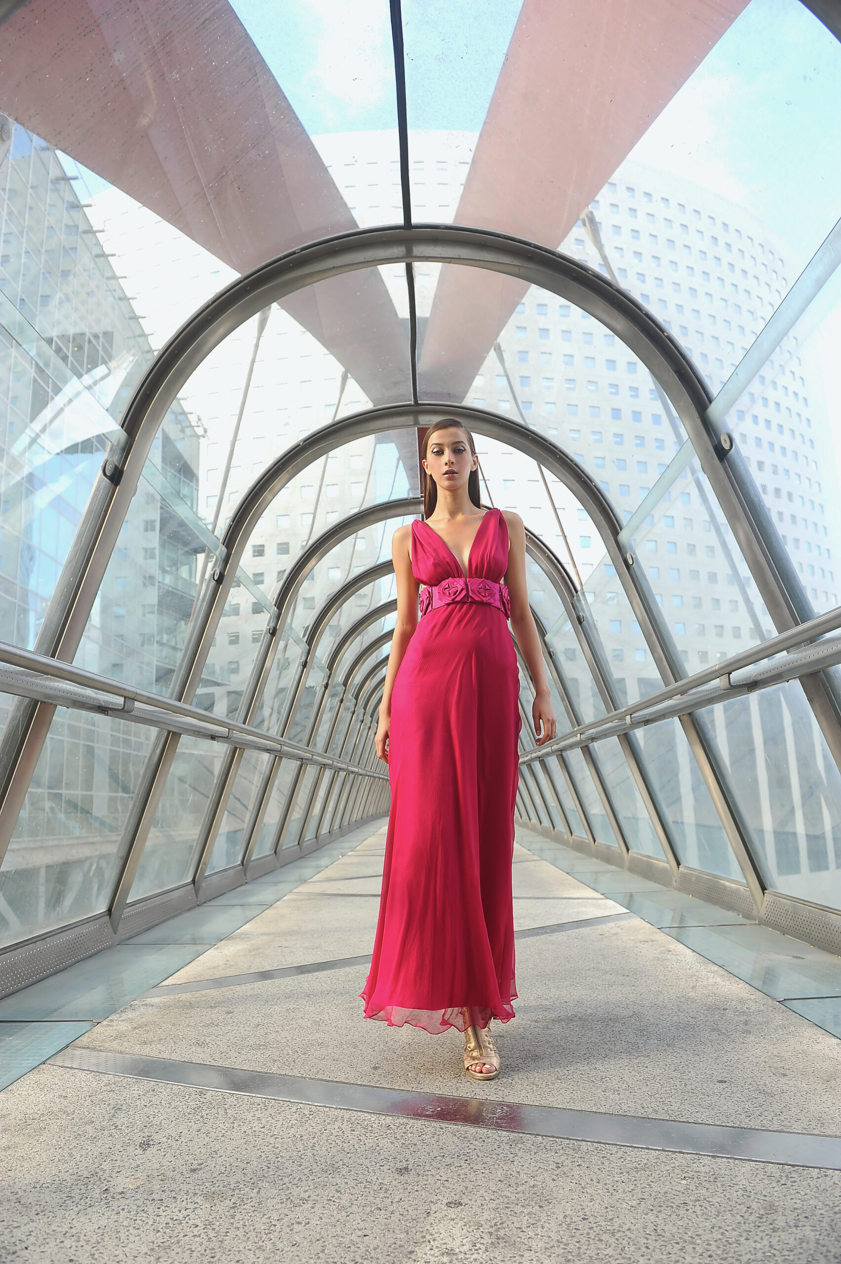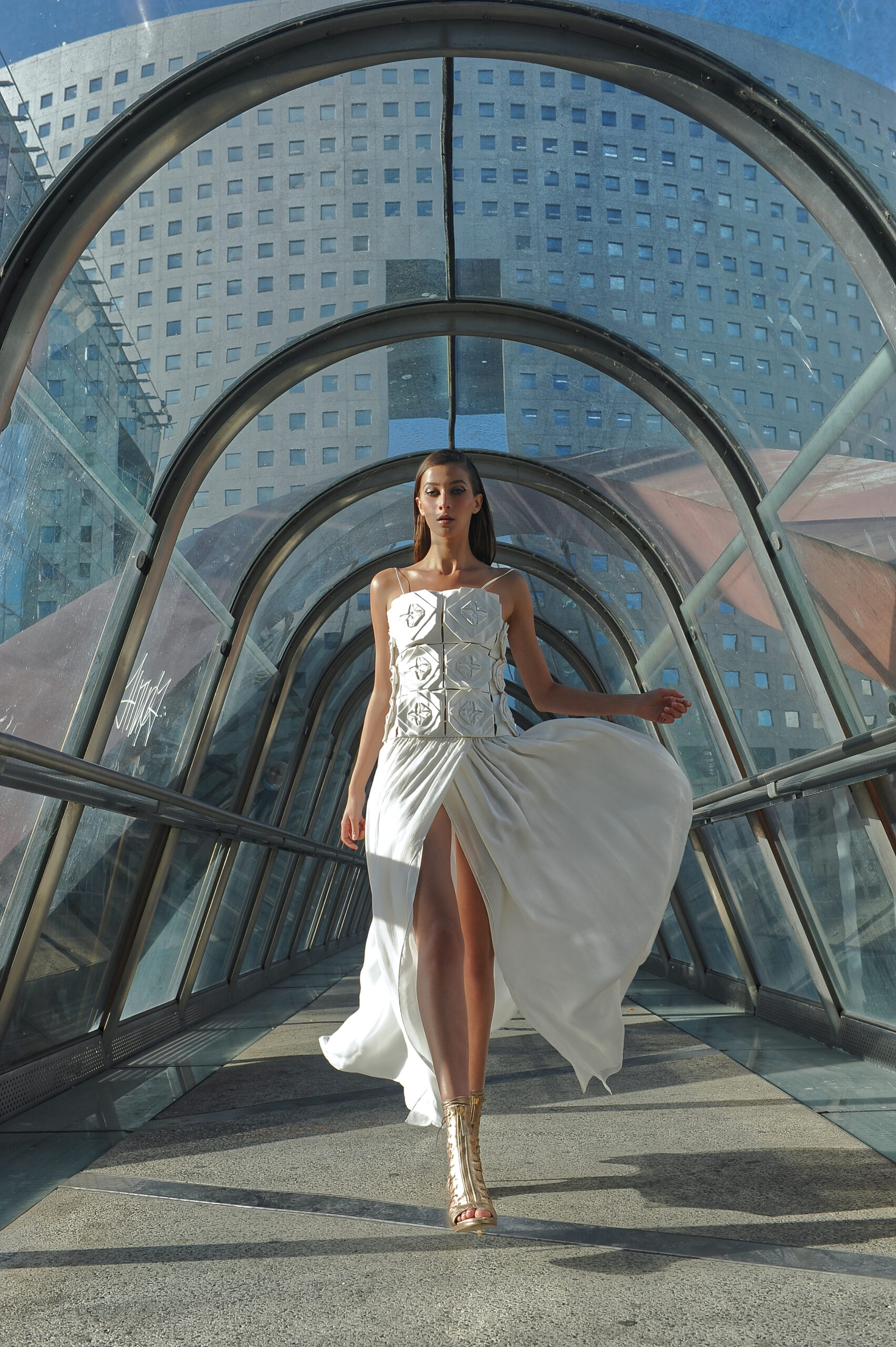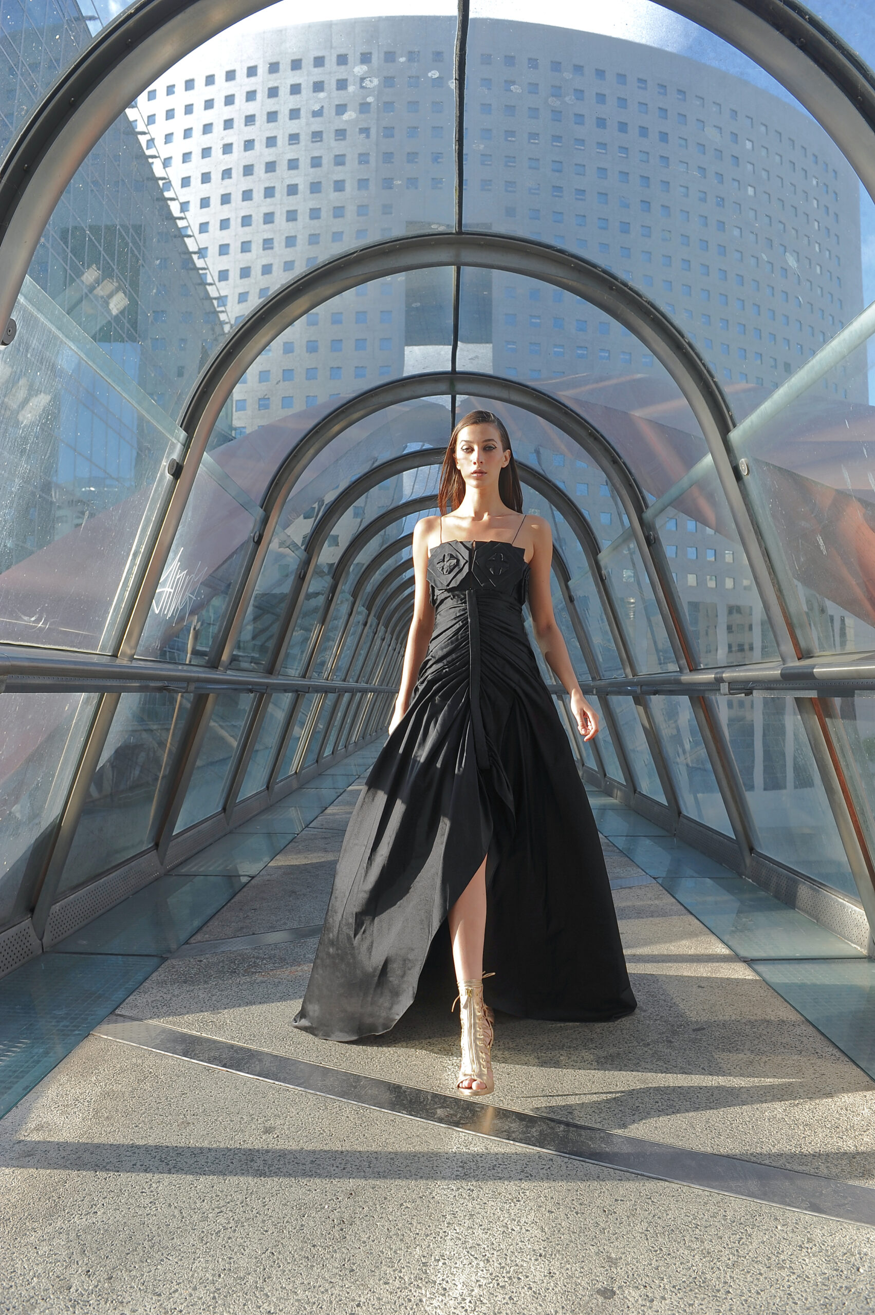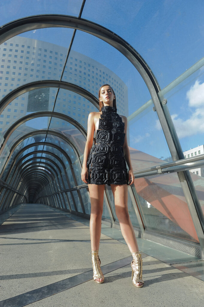 Suite attendue de la collection couture, Farhad Re présente sa première collection Prêt-à-Porter. On retrouve la femme guerrière et conquérante, signature du créateur, dans des robes 100% chiffon et tulle de soie. Les détails très travaillés attestent de la volonté de haut de gamme de Farhad, tels les carrés en organza de soie, découpés et pliés à la main pour former une fleurs, détail que l’on retrouve sur la collection couture. À noter que les teintures de la collection – vert, bleu, rose – sont 100 % écologiques et spécialement élaborées pour cette collection, lui conférant un caractère unique. Les armures or créées pour la couture ont été ici déclinées en ceinture, en bustier et en robe. Une collection volontairement sexy, aux fentes vertigineuses, qui ne sont pas sans rappeler les toges des femmes de l’antiquité romaine. La fluidité contraste avec la rigidité des armures or et des ceintures en fleurs d’organza. Une femme consciente que la terre est fragile et que la réponse à toutes nos questions se trouve au-delà de notre planète.