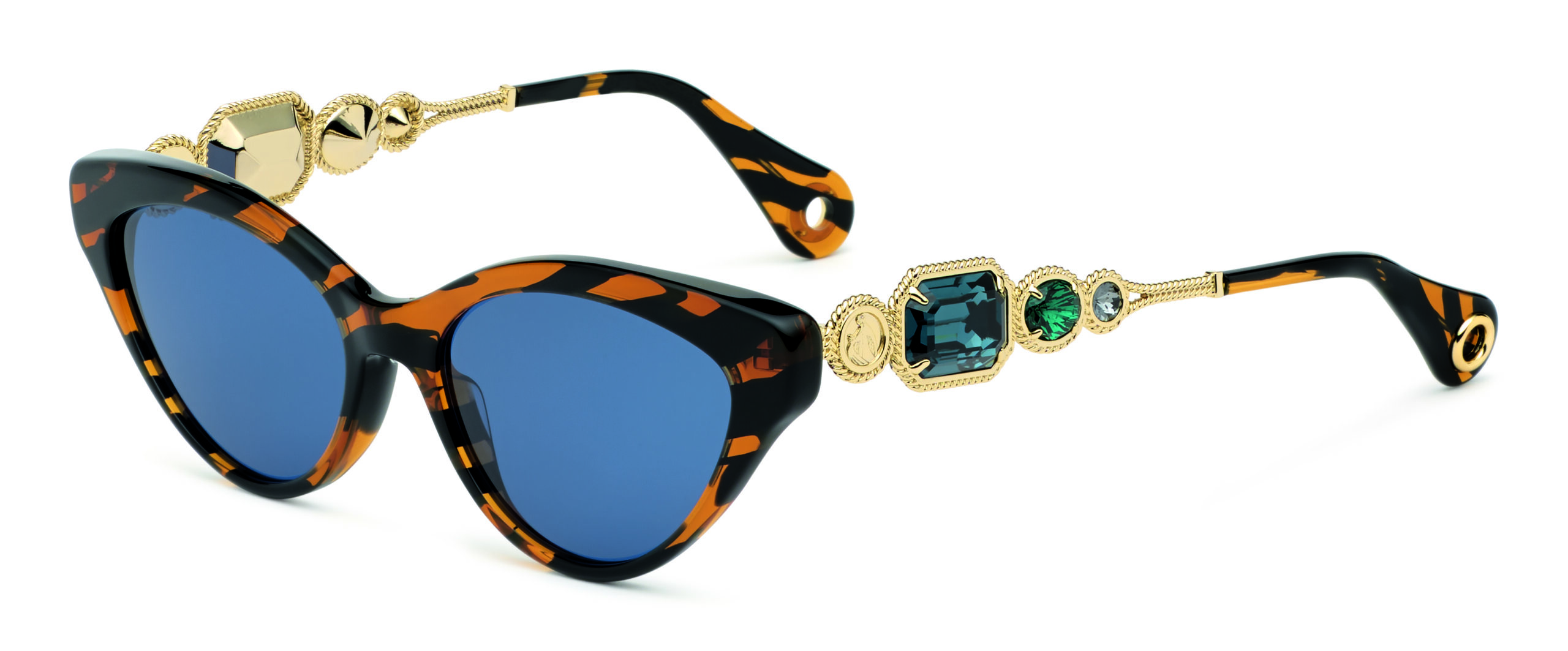 Ce chic modèle cat-eye affiche l’exclusif acétate imprimé tigre et trois colorés cristaux Swarovski sur les branches en métal, tout près du logo Mère et Fille, transformant ainsi ces solaires en véritable bijou. Les embouts de branches, avec leur découpe, peuvent accueillir la chaîne à lunettes Lanvin.