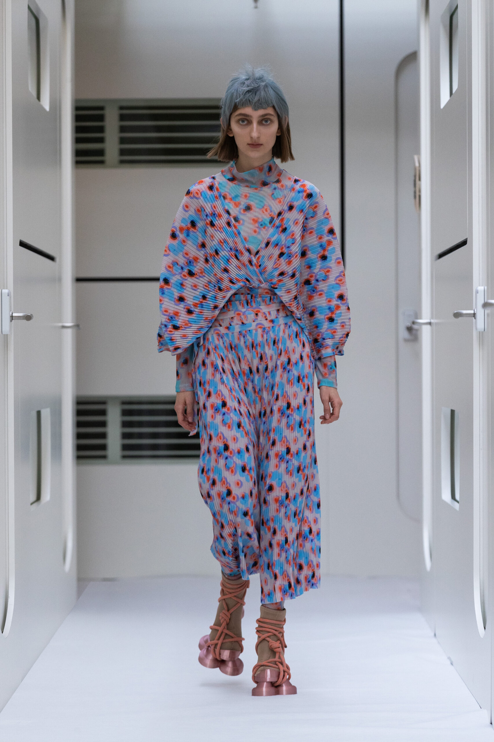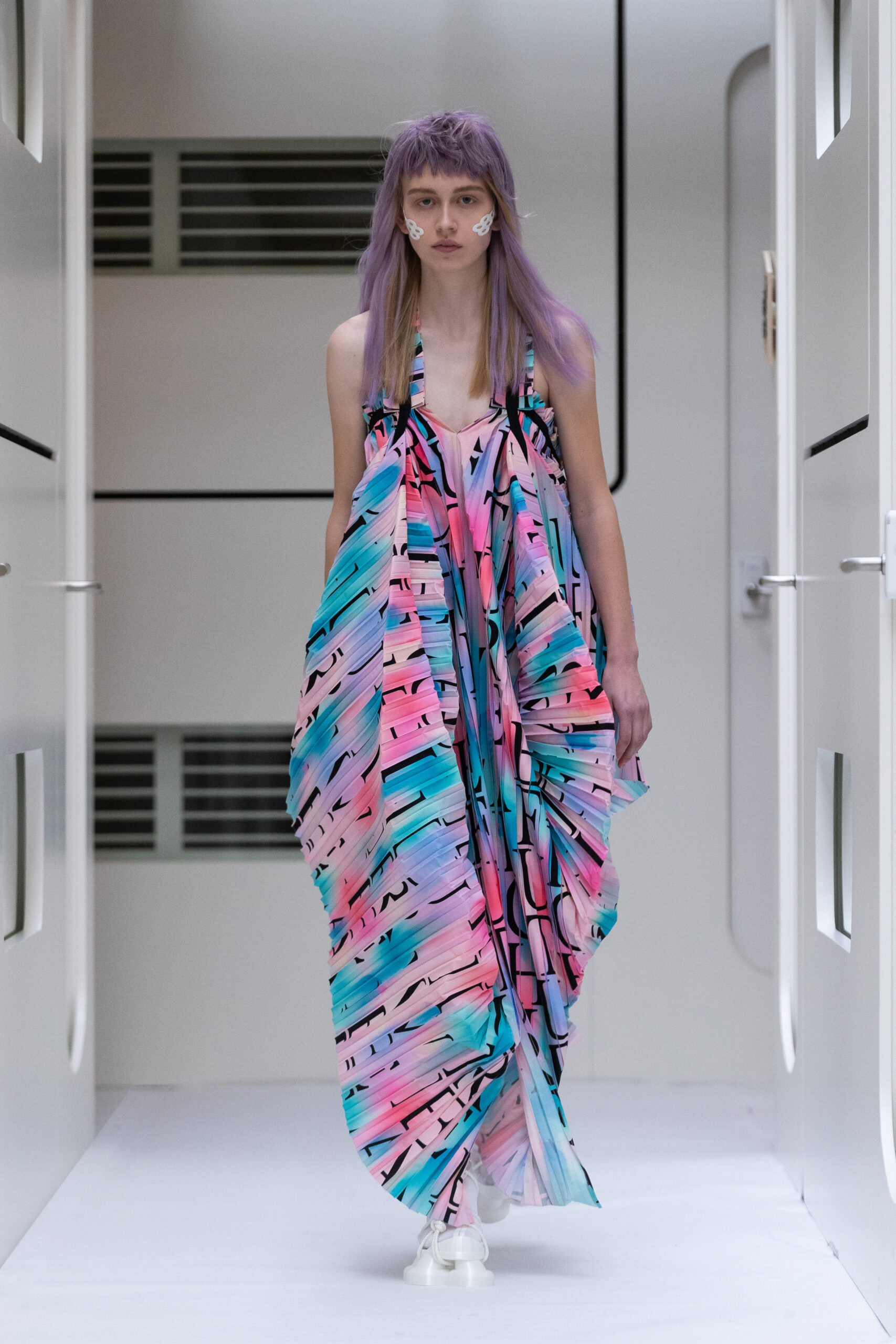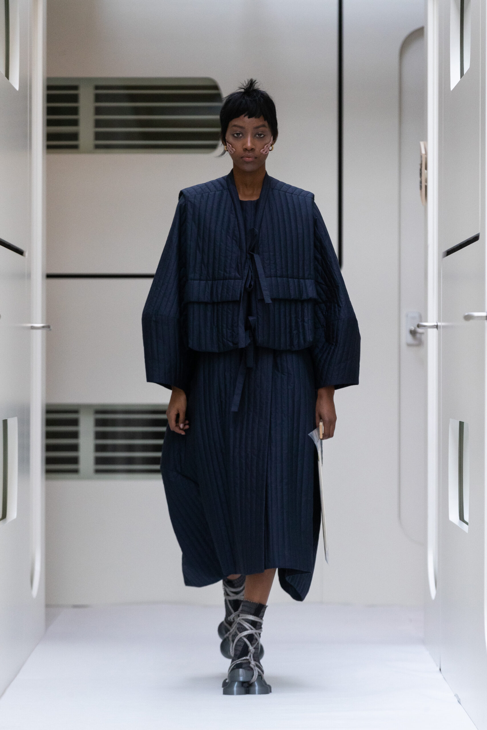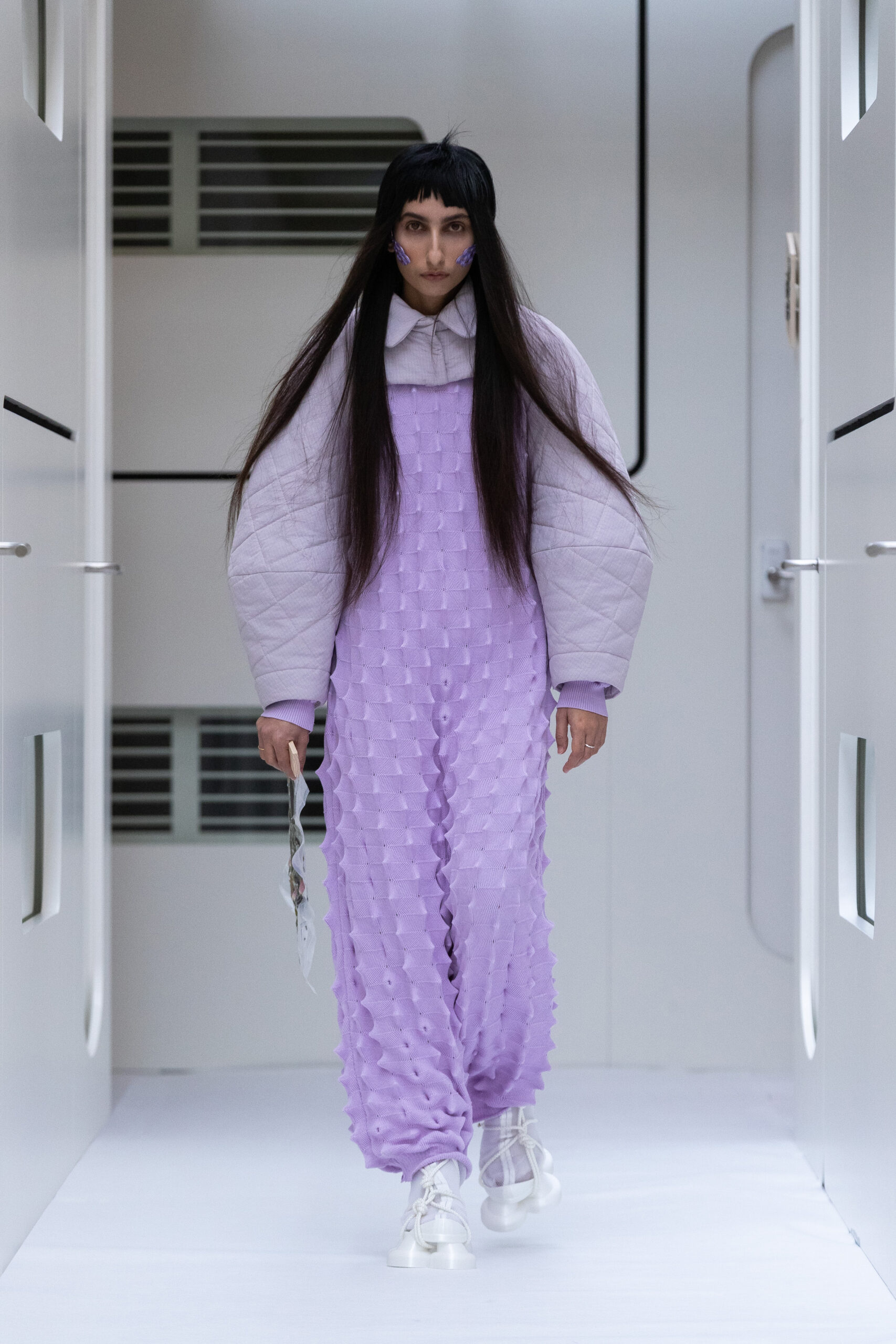 The silhouettes are bulky and voluminous, with details inspired by protection gear like hoodies, special buckles, belts, vests and placement pockets. Padded dresses mixing the old-school woman silhouette with protection wear in off-white, pale lilac and with a print of spinning distant planets. Craft jumpsuit in greywashed navy denim, Apollo vest with special binding, Orbit dress with placement pockets and Helium denim dungarees. An eccentric sculptural plissé group in a florescent print of flashing lights and planets. The paper plane knit is an assembly instruction and the jacquard knit reveals floating moon landscapes and spaceships.