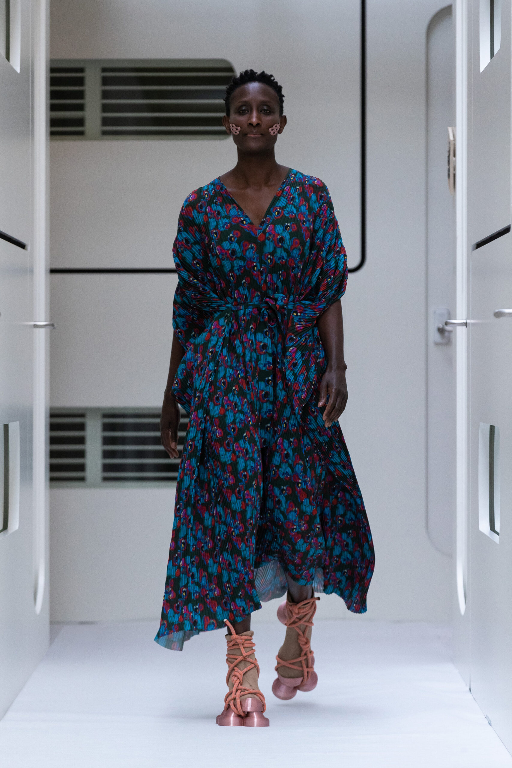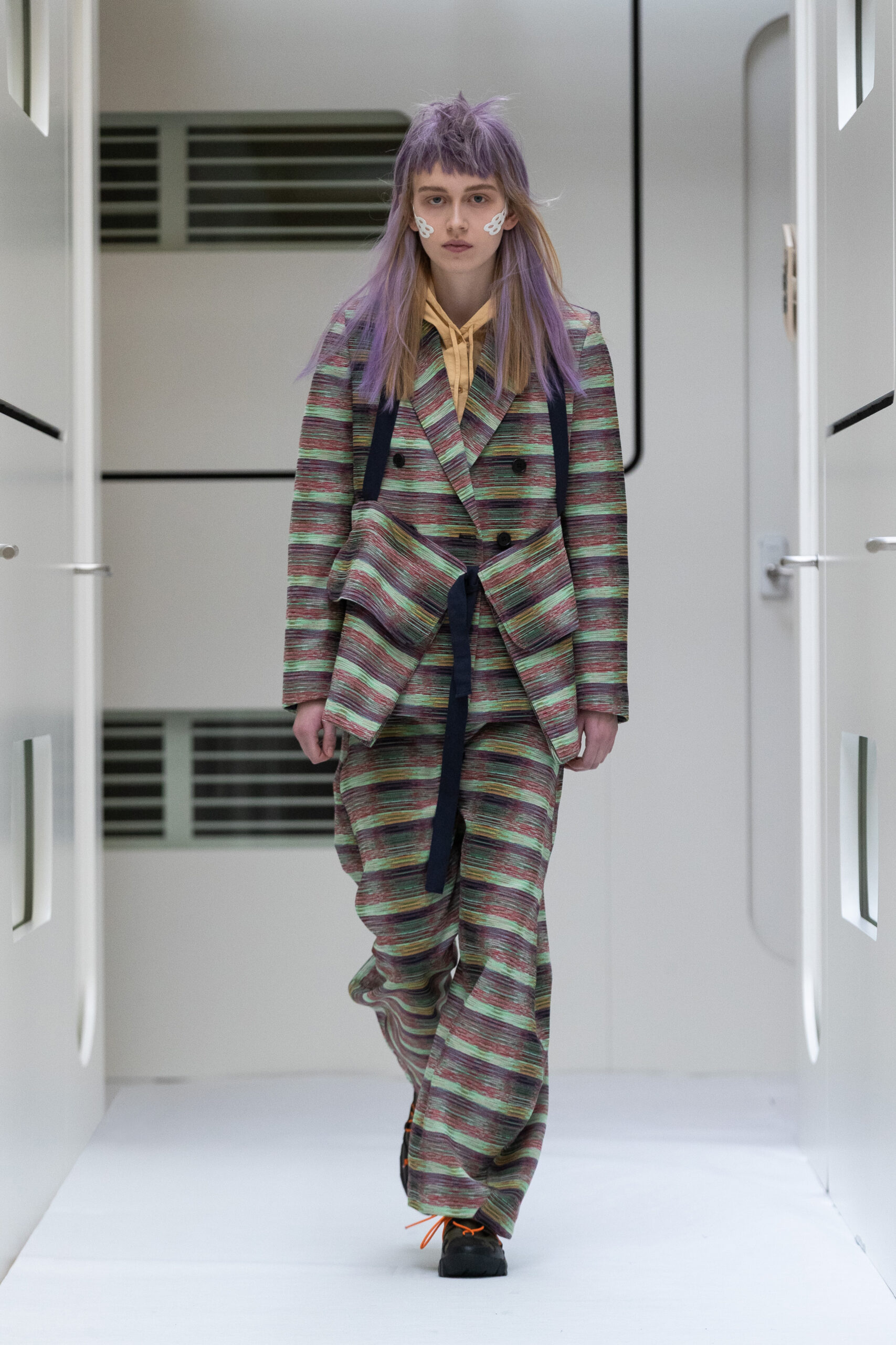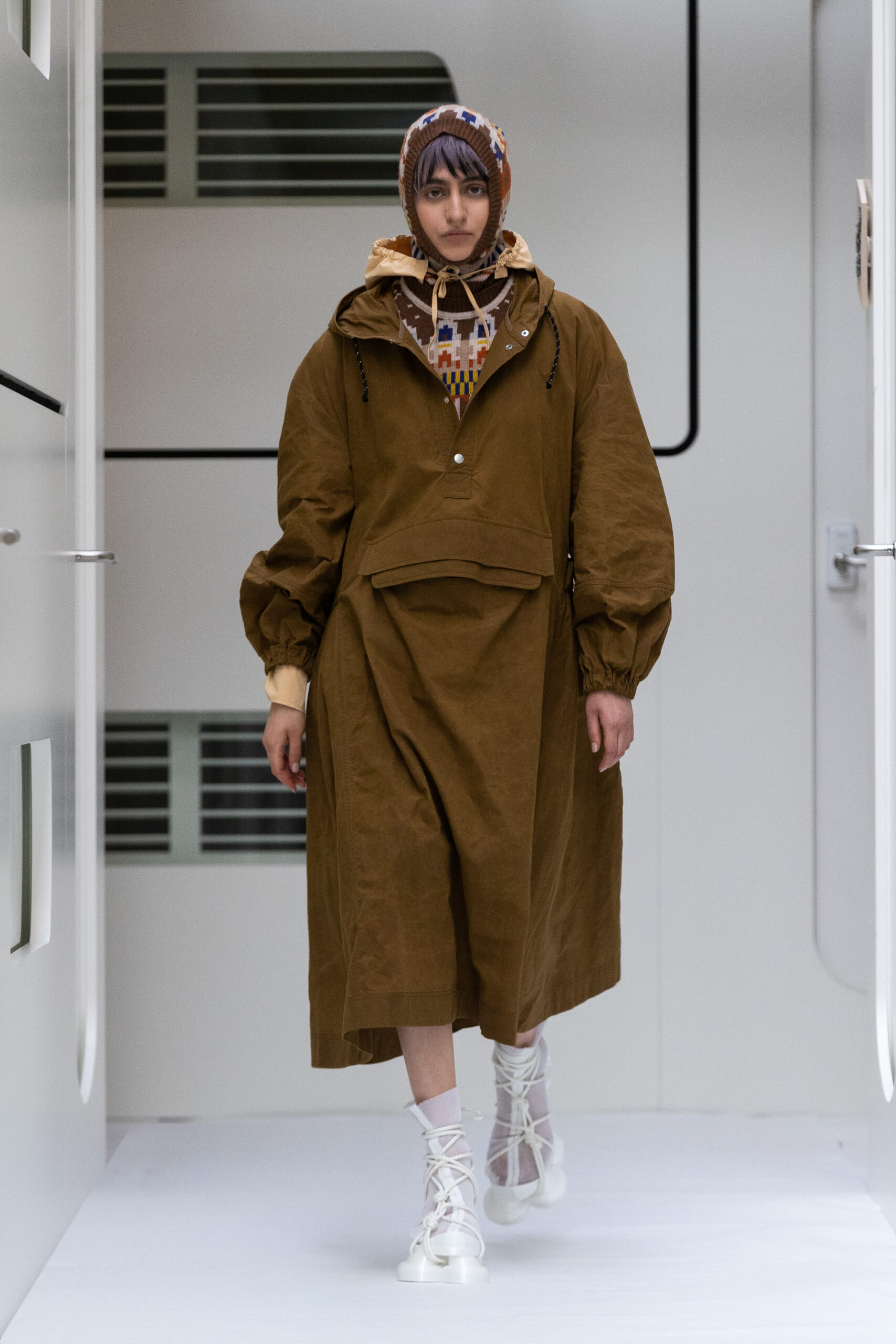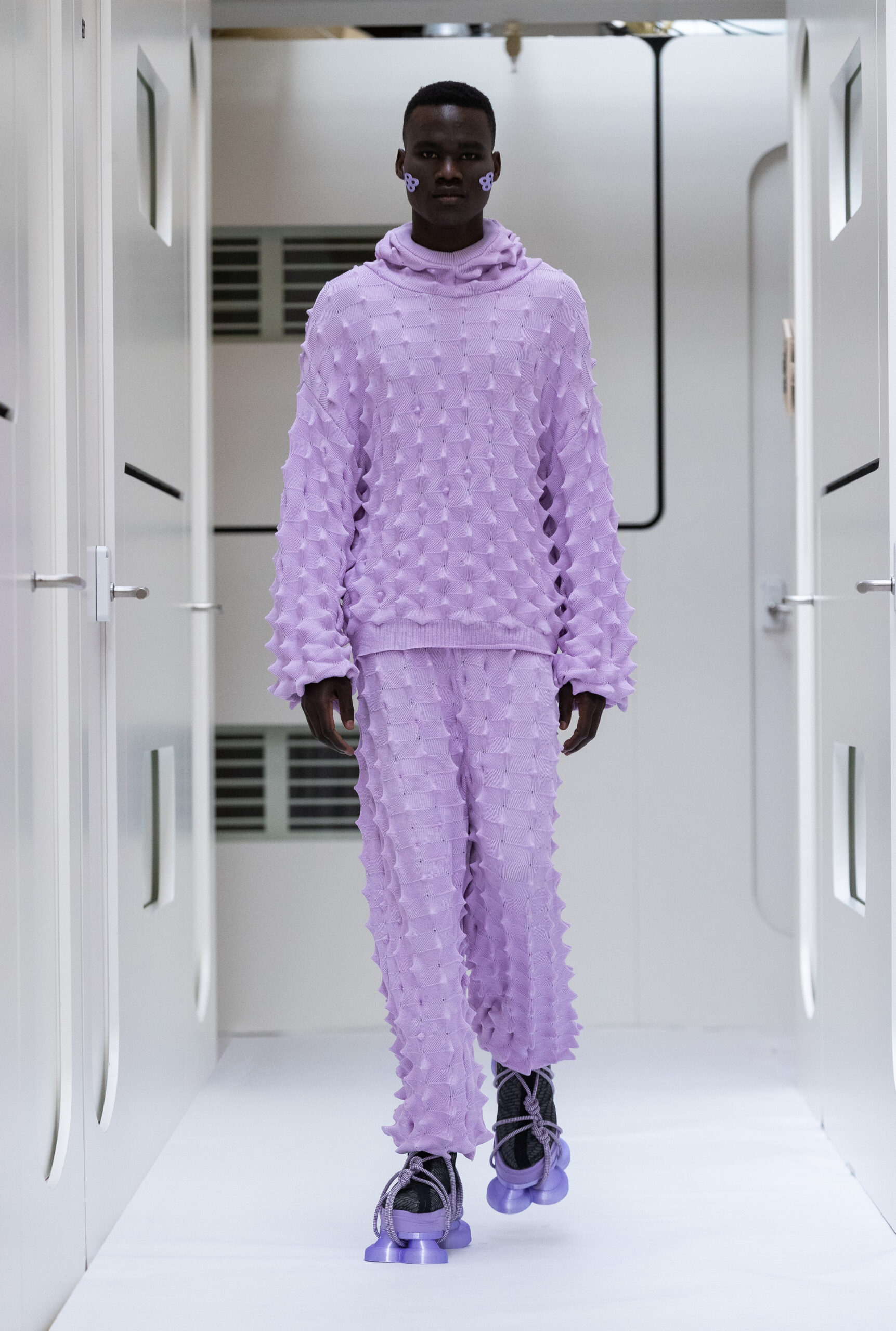 The silhouettes are bulky and voluminous, with details inspired by protection gear like hoodies, special buckles, belts, vests and placement pockets. Padded dresses mixing the old-school woman silhouette with protection wear in off-white, pale lilac and with a print of spinning distant planets. Craft jumpsuit in greywashed navy denim, Apollo vest with special binding, Orbit dress with placement pockets and Helium denim dungarees. An eccentric sculptural plissé group in a florescent print of flashing lights and planets. The paper plane knit is an assembly instruction and the jacquard knit reveals floating moon landscapes and spaceships.