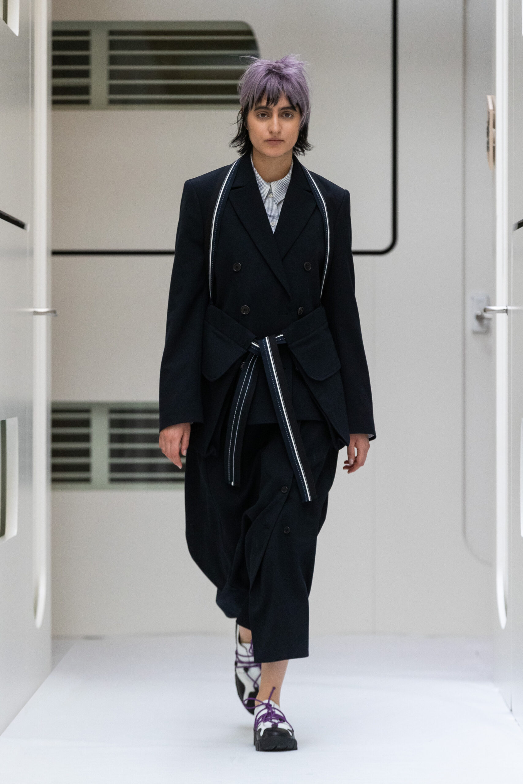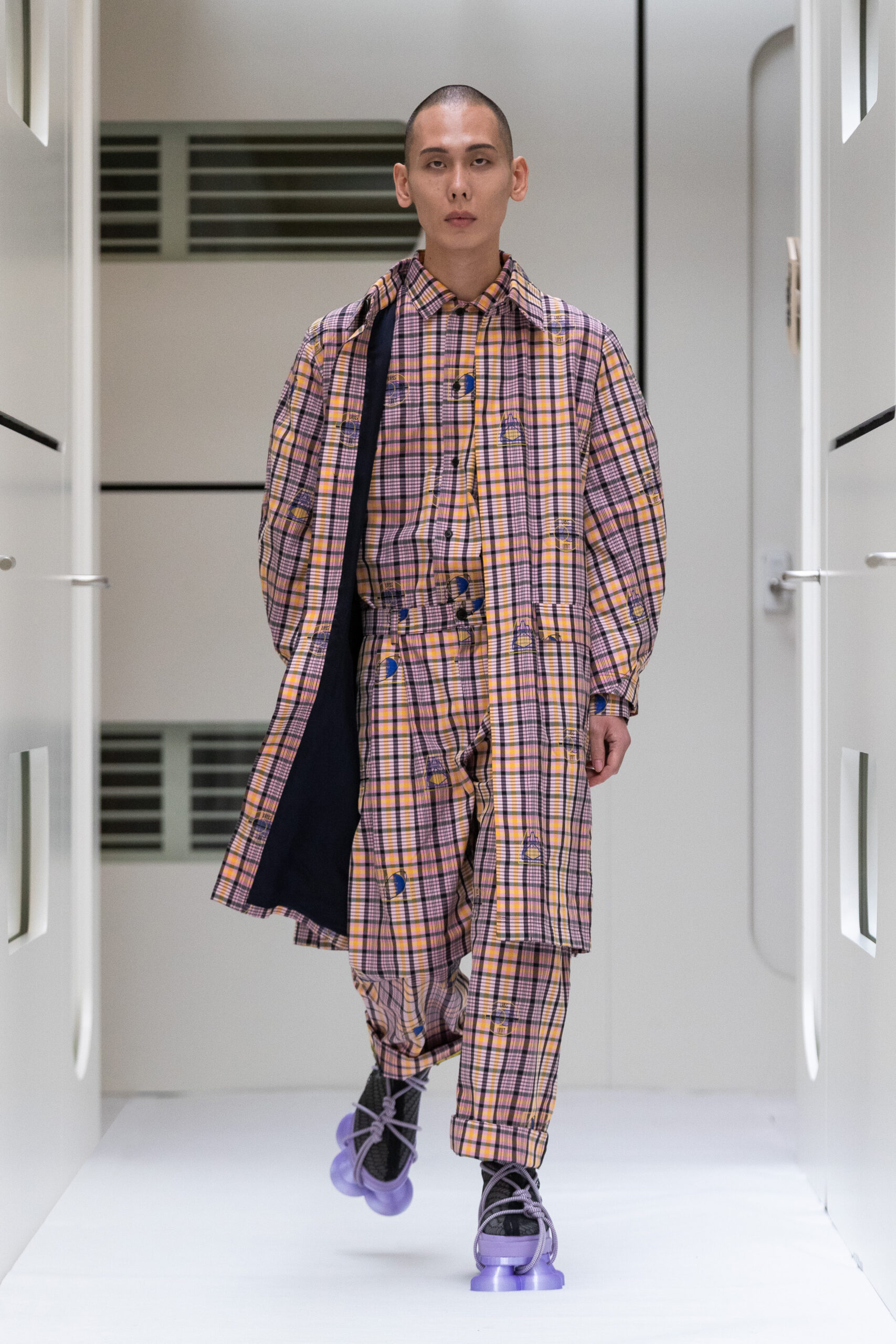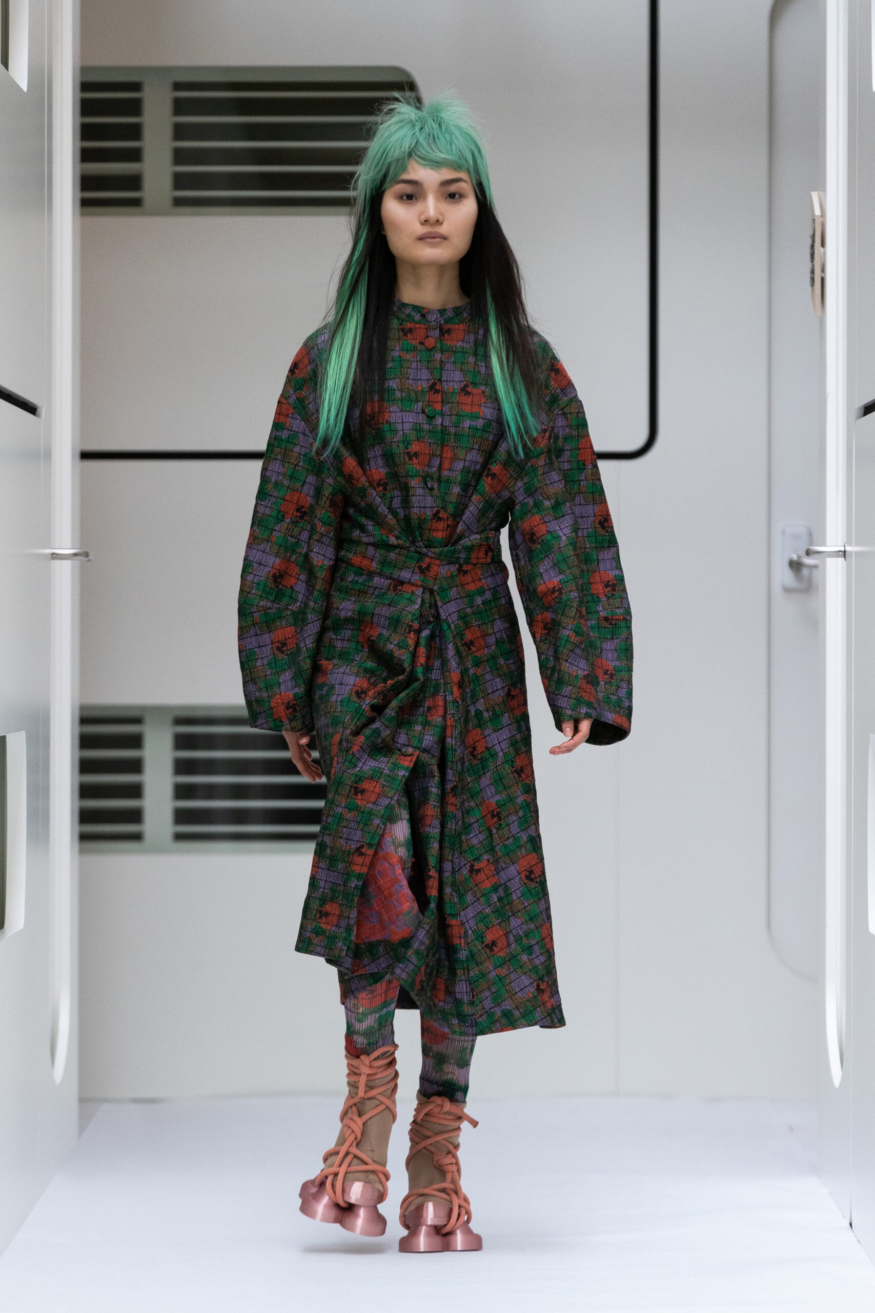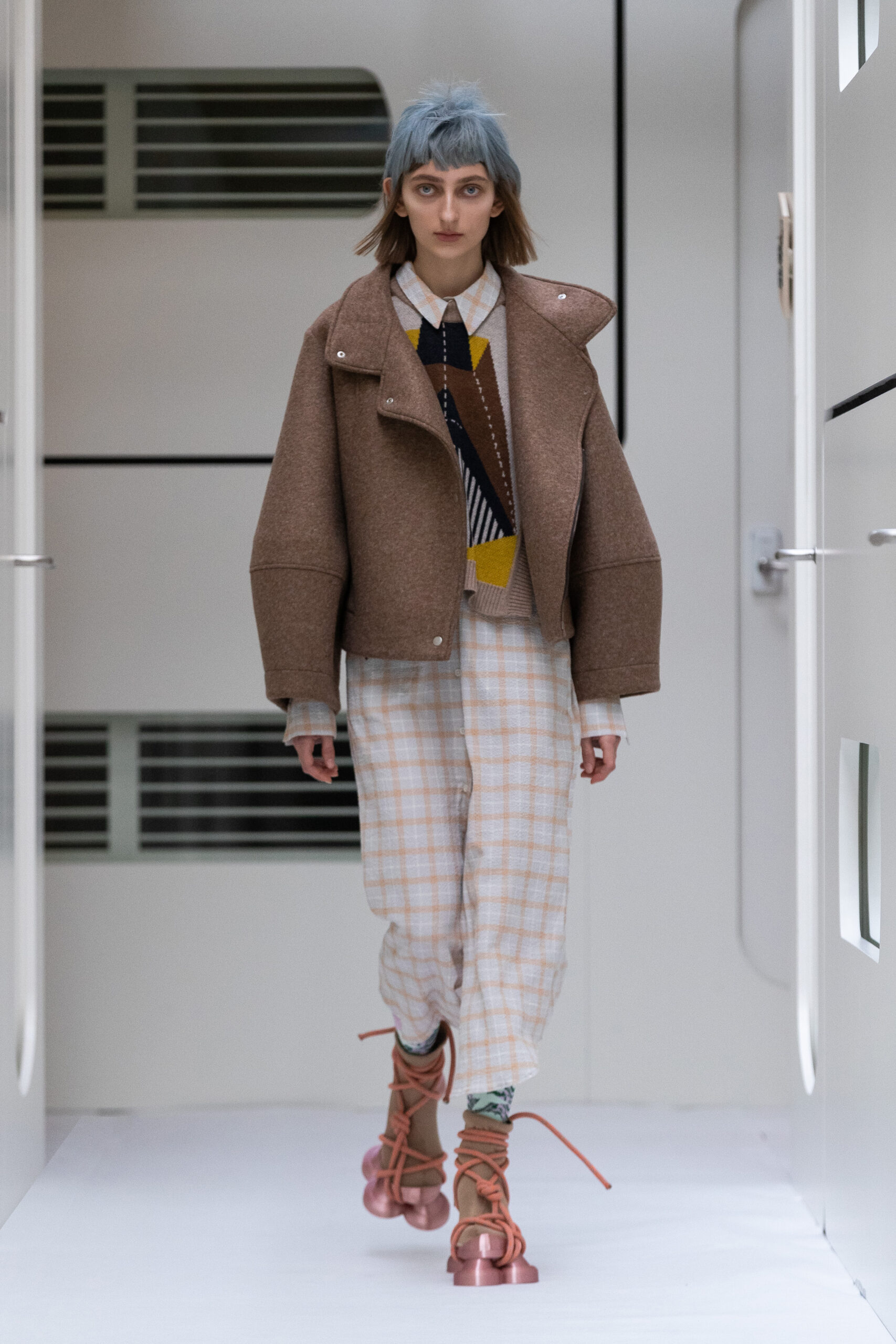 The silhouettes are bulky and voluminous, with details inspired by protection gear like hoodies, special buckles, belts, vests and placement pockets. Padded dresses mixing the old-school woman silhouette with protection wear in off-white, pale lilac and with a print of spinning distant planets. Craft jumpsuit in greywashed navy denim, Apollo vest with special binding, Orbit dress with placement pockets and Helium denim dungarees. An eccentric sculptural plissé group in a florescent print of flashing lights and planets. The paper plane knit is an assembly instruction and the jacquard knit reveals floating moon landscapes and spaceships.