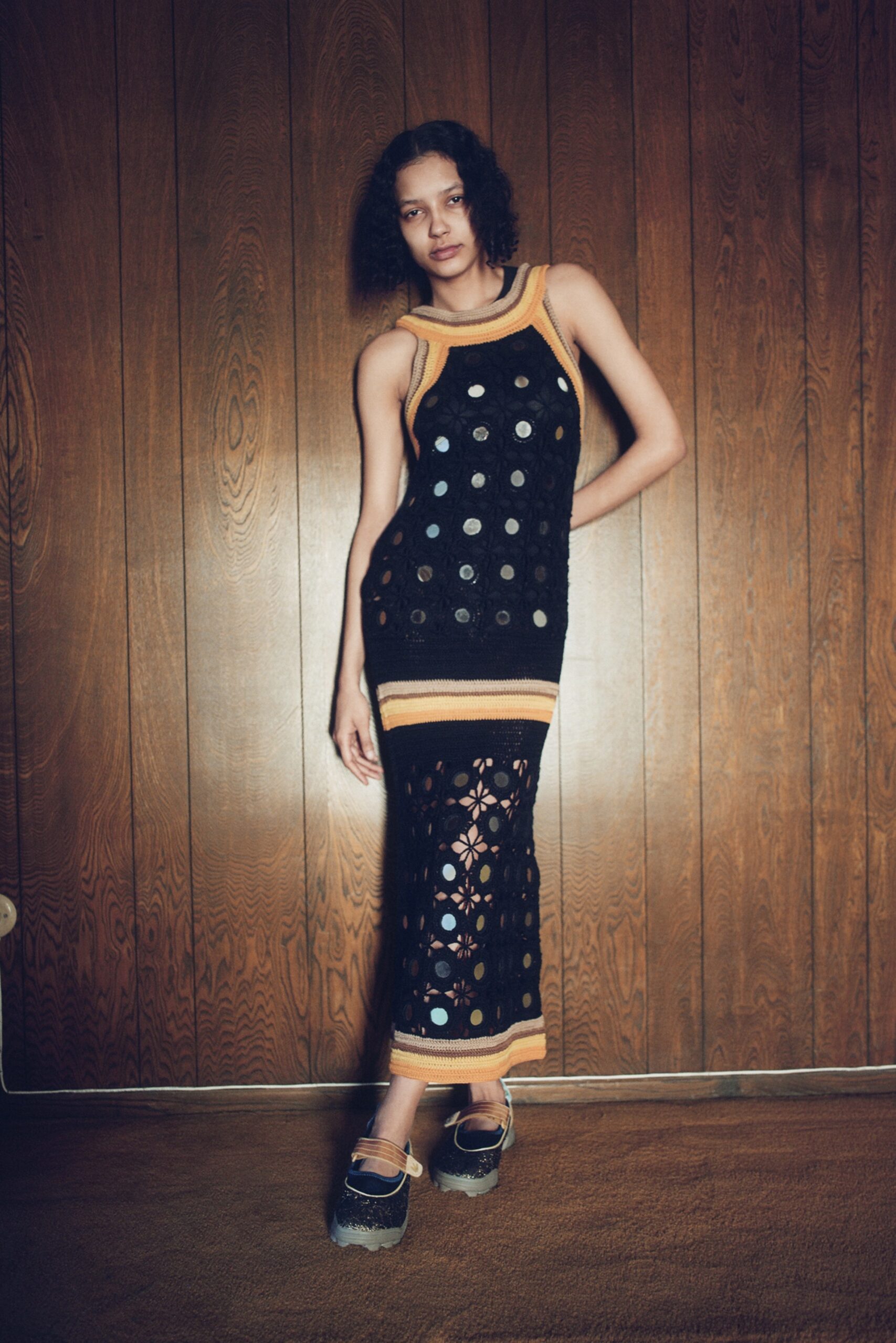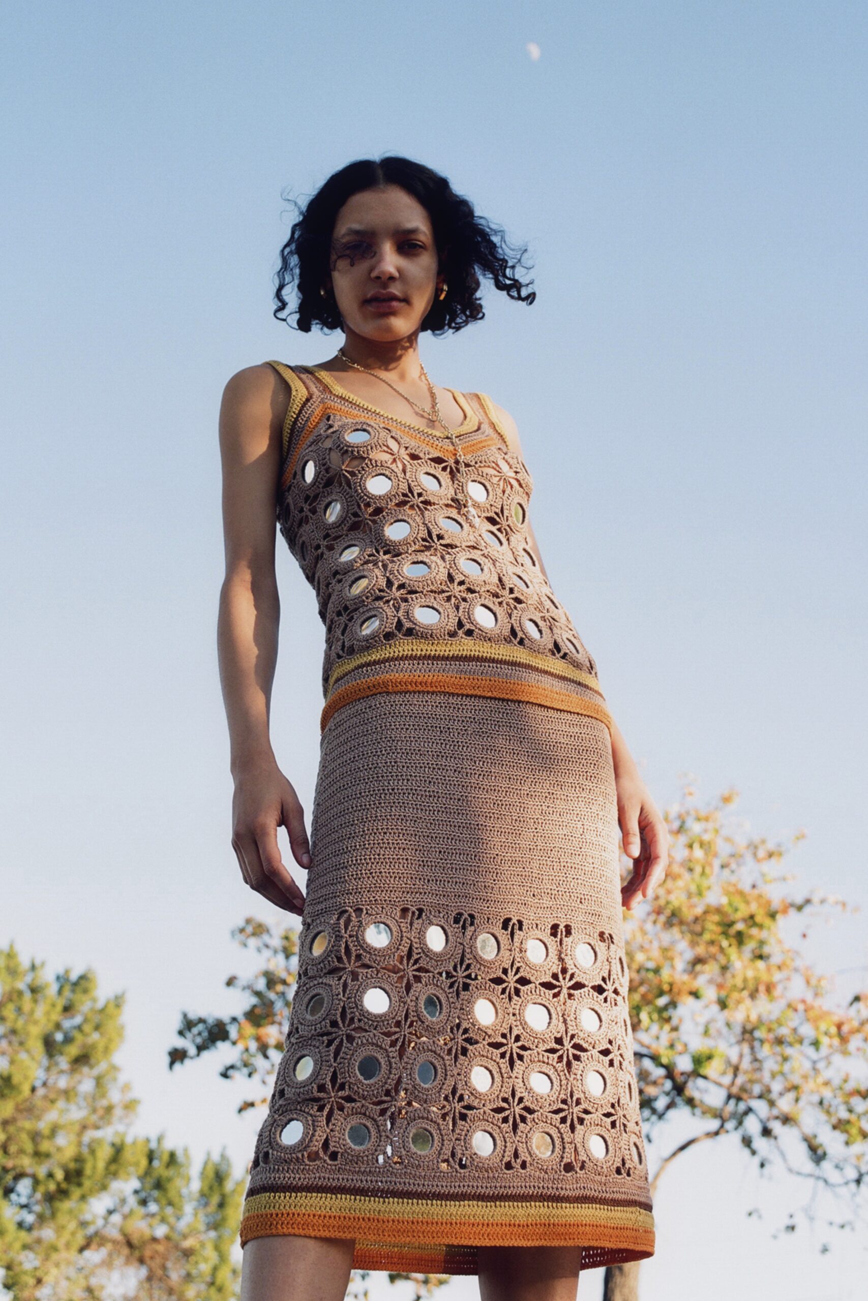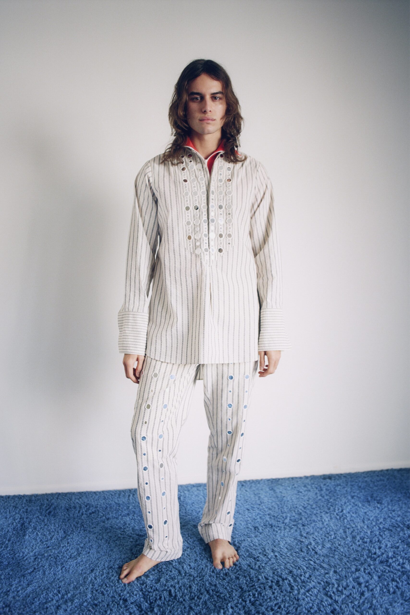 The collection embraces a joyful eclecticism, evoking a holistic way of life that flows from indoors to outdoors, from domestic rhythms to creative exuberance. Celebrating world craft and hand-making, seasonal tailoring and denim are constructed with handwoven cottons made in Burkina Faso. Spiritual loungewear is expressed in recycled cashmere track suiting, and embroidered pyjamas radiating silver light. Experiential outerwear is rendered in Turquoise nappa, and the wonderment of evening is reflected in mirrored hand crochet dresses and peacock inspired mens tailoring.