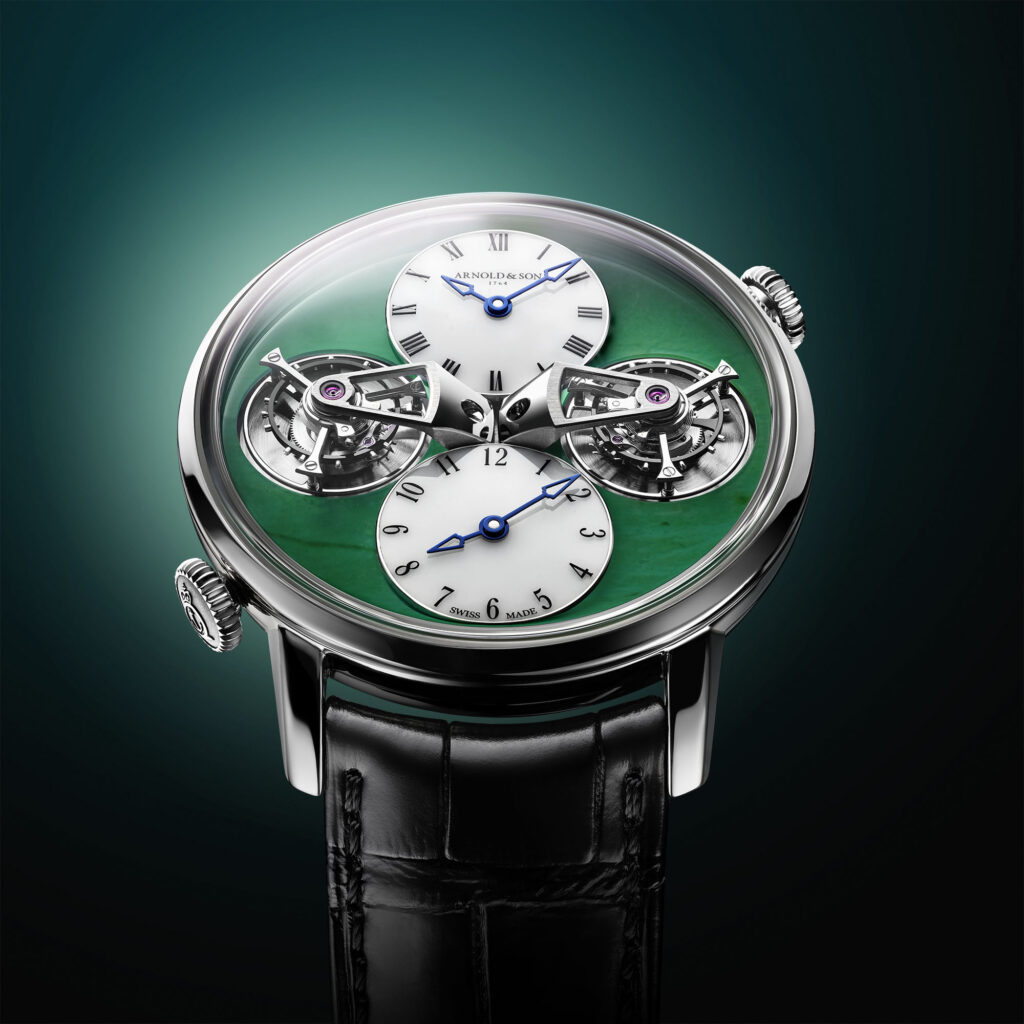 Arnold & Son célèbre sa collection Double Tourbillon avec la présentation de deux pièces uniques habillées d’un éclatant jade vert et d’une délicate opale blanche. Les deux tourbillons indépendants et les deux fuseaux horaires de ce modèle rare prennent un nouveau visage. Une exécution de haute volée en or rouge ou en or gris.
