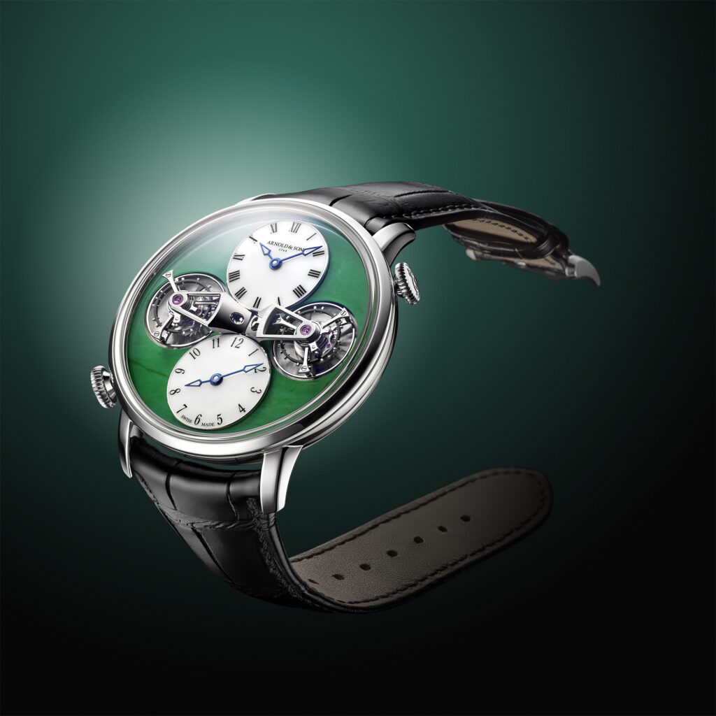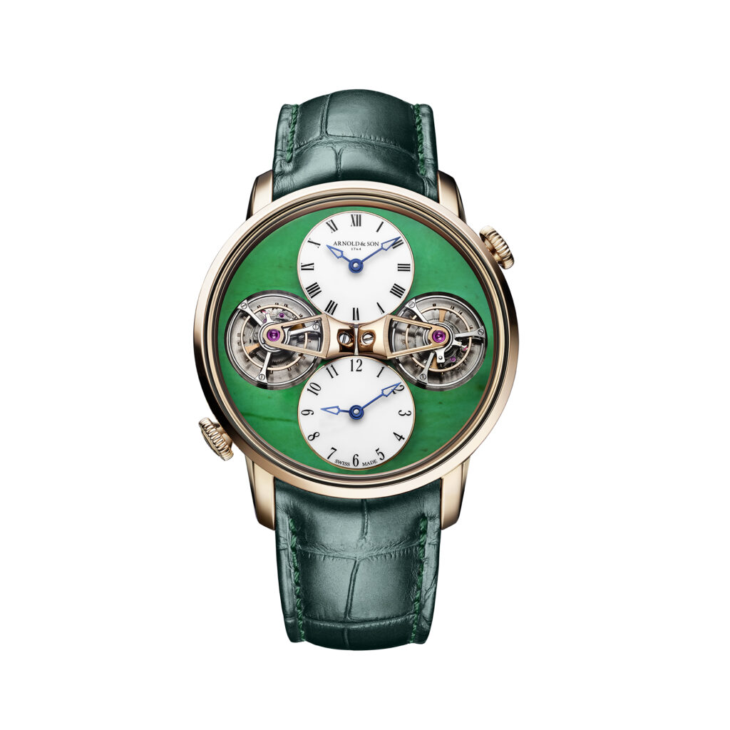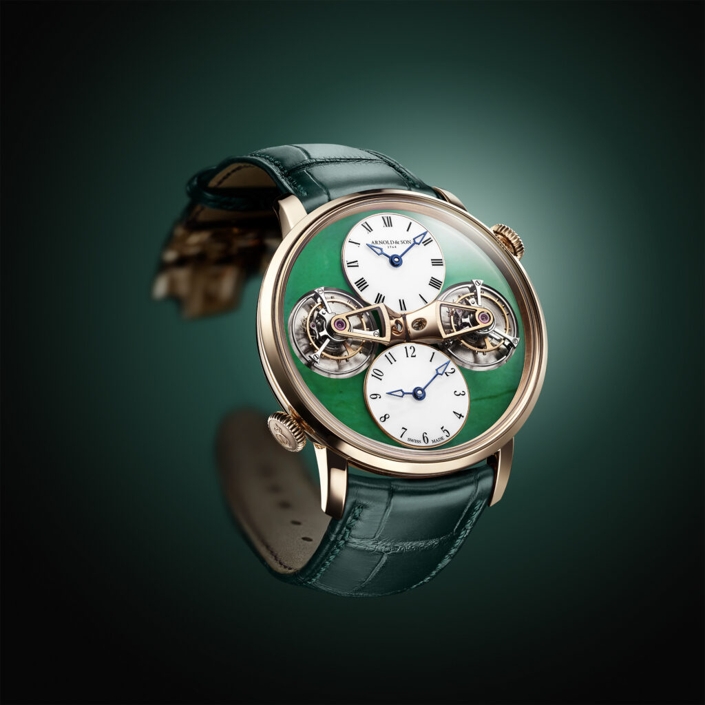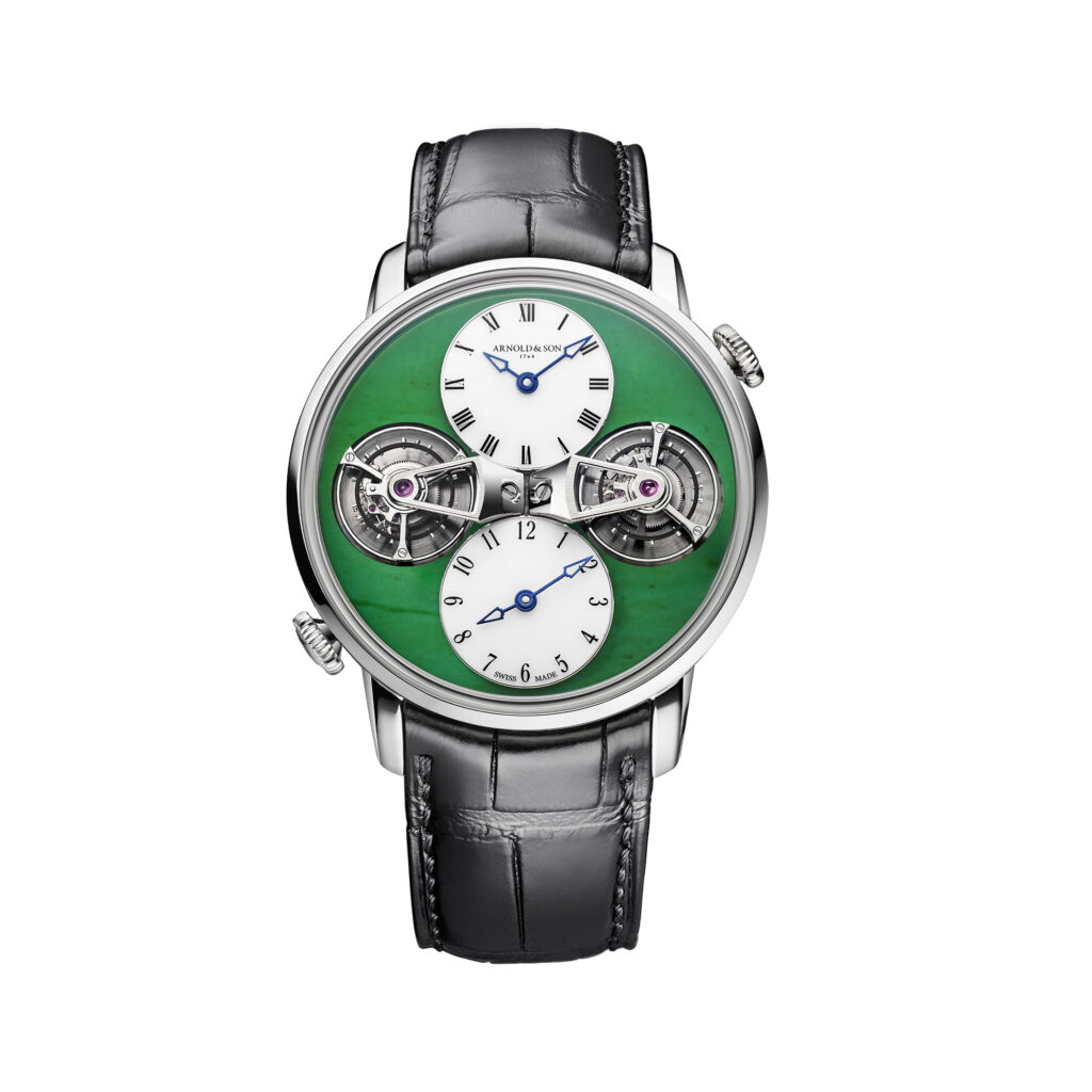 Arnold & Son célèbre sa collection Double Tourbillon avec la présentation de deux pièces uniques habillées d’un éclatant jade vert et d’une délicate opale blanche. Les deux tourbillons indépendants et les deux fuseaux horaires de ce modèle rare prennent un nouveau visage. Une exécution de haute volée en or rouge ou en or gris.