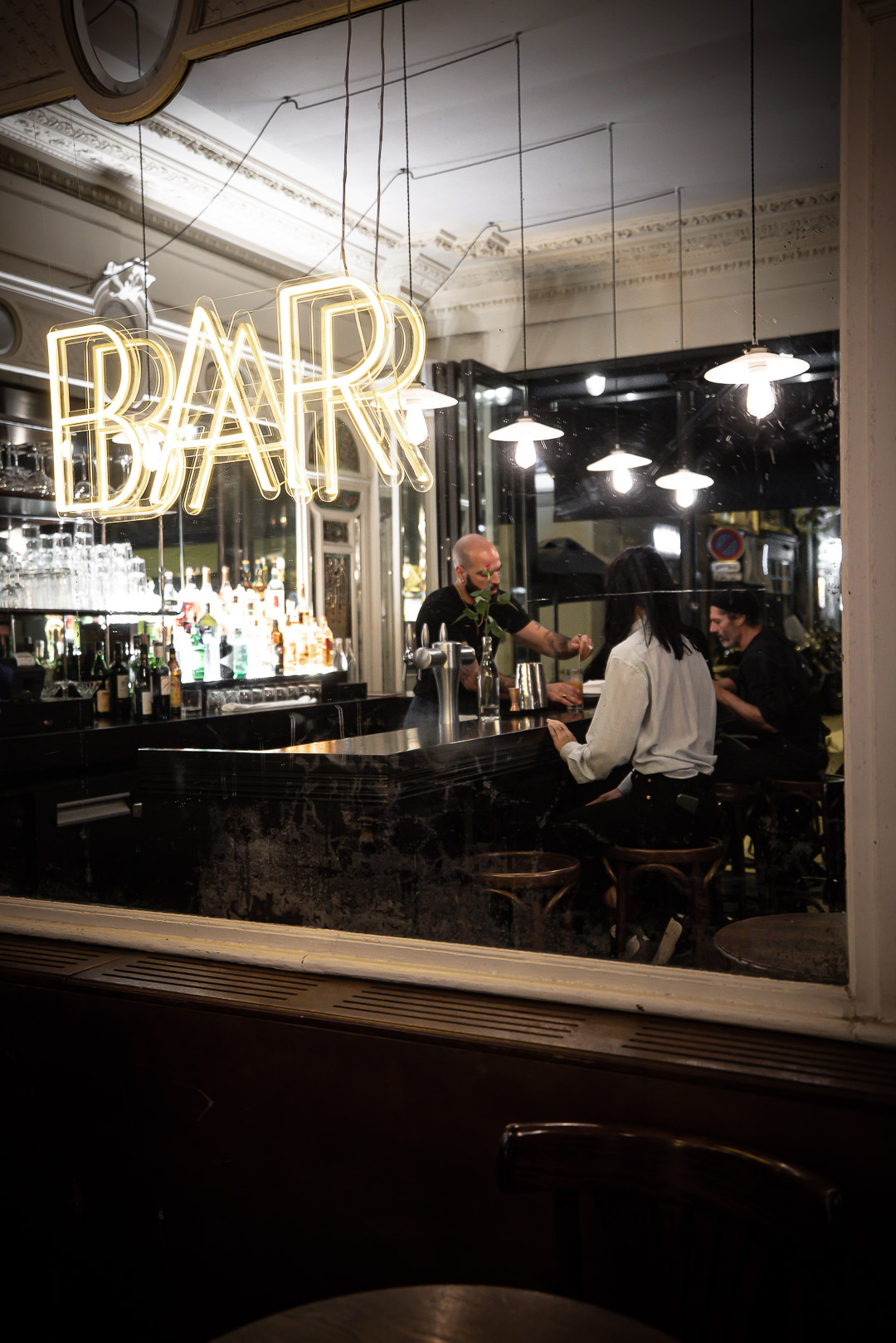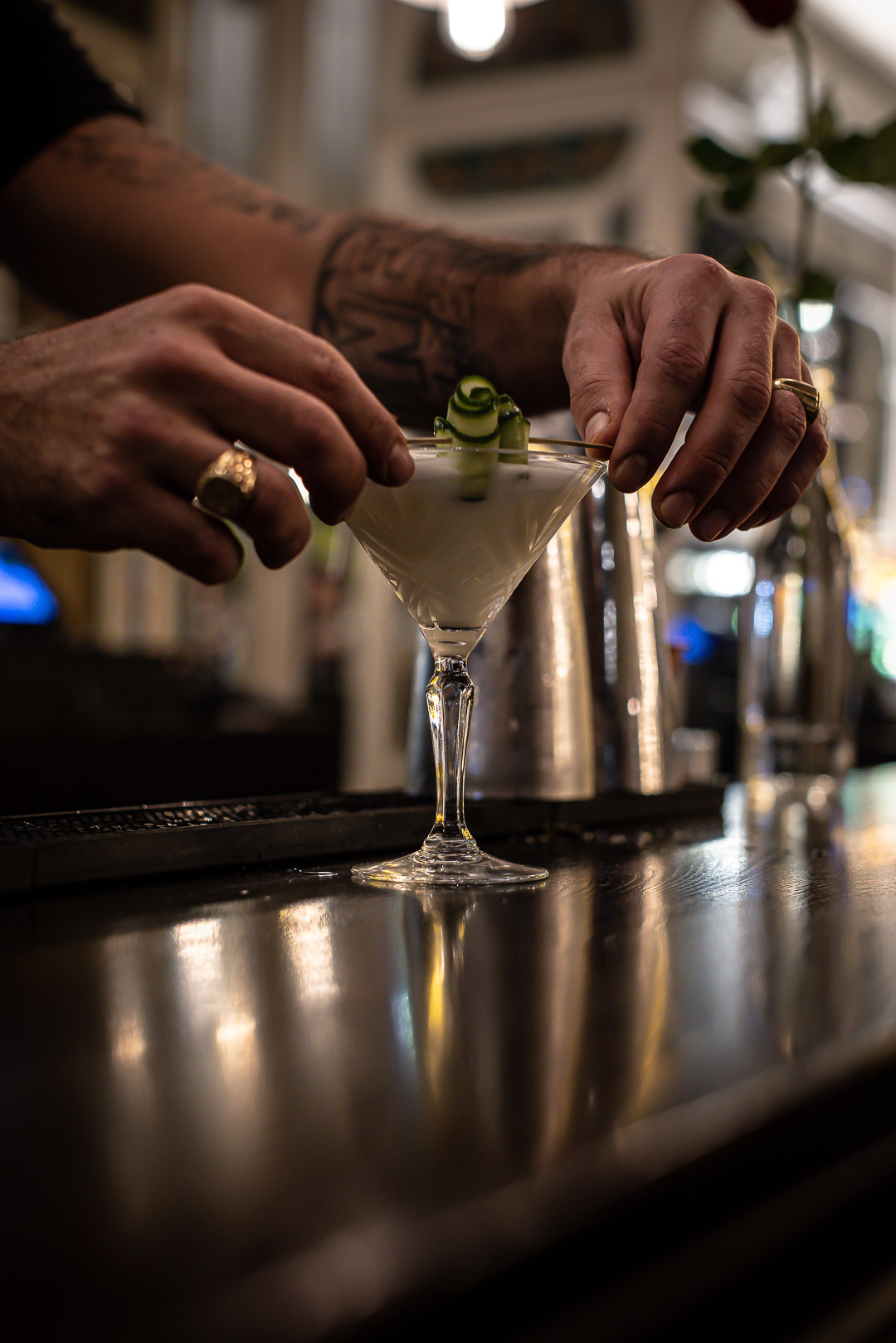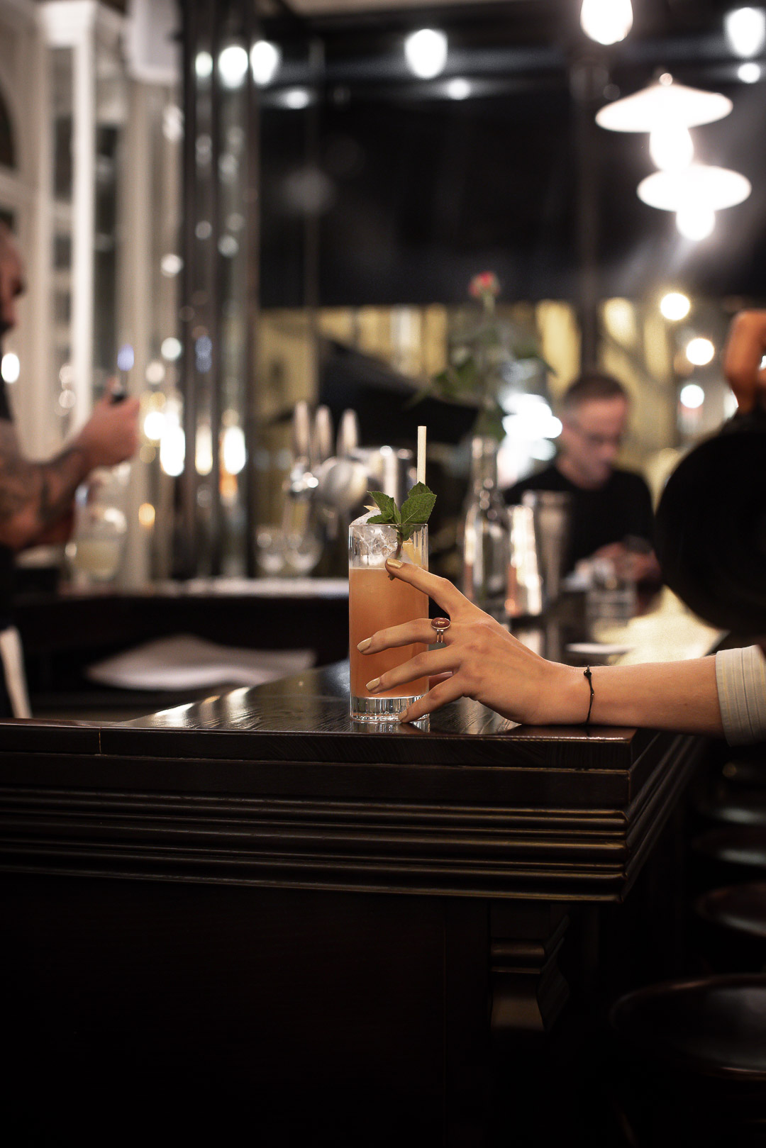 En capitaine, le barman Miguel Romo Largo propose des cocktails festifs à siroter entre amis ou une coupe de champagne en tête-à-tête. Shaker en main, t-shirt noir et bras tatoués, le barman distille une carte d’une vingtaine de recettes.