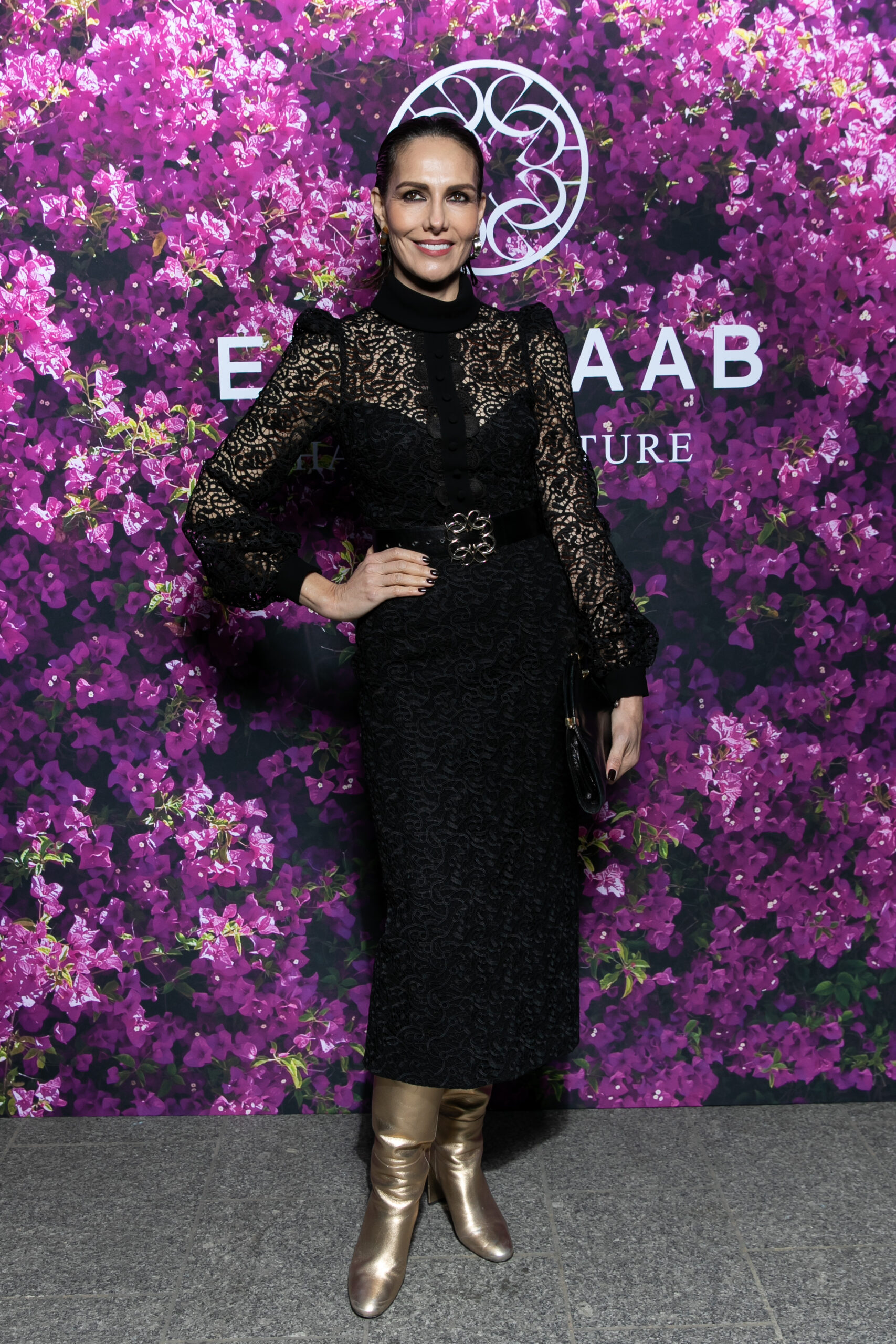 Adriana Abascal portait une robe noire en macramé assortie d’une large ceinture en cuir noir de la collection ELIE SAAB Prêt-A-Porter Automne/Hiver 2021-2022.