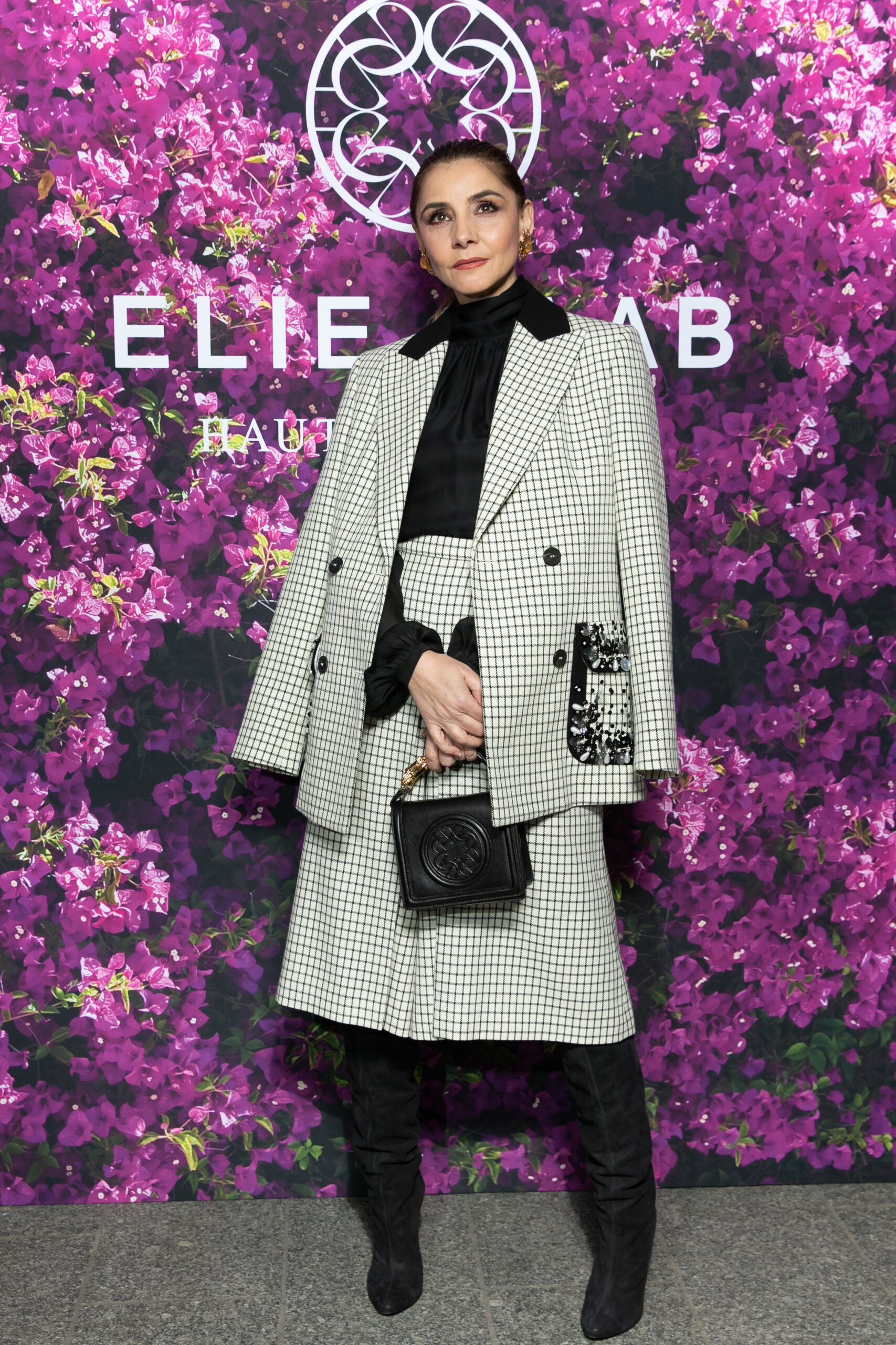 Clotilde Courau portait un tailleur imprimé assorti d’un sac en cuir noir de la collection ELIE SAAB Prêt-A-Porter Automne/Hiver 2021-2022.