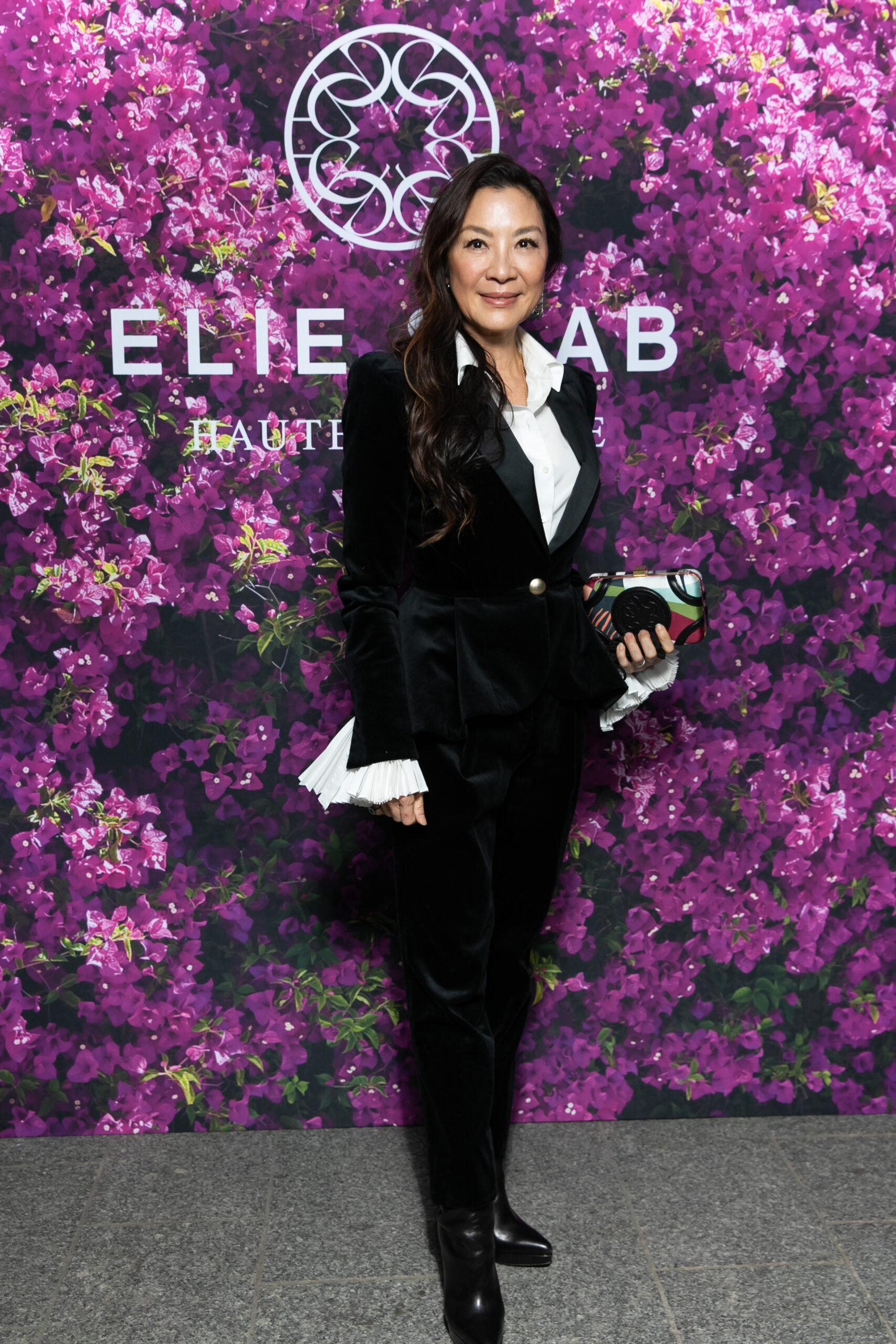 Michelle Yeoh portait un tailleur en velours noir avec une chemise blanche et une pochette multicolore, des collections ELIE SAAB Prêt-A-Porter.
