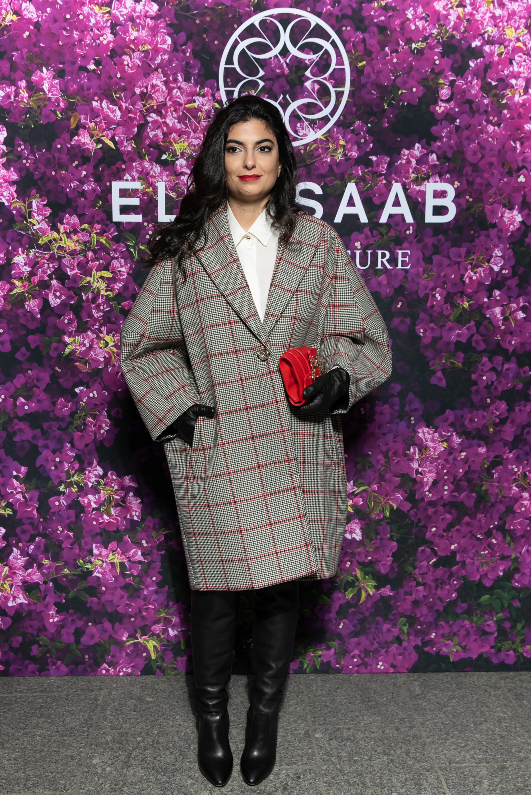Mounia Akl portait une manteau imprimé assorti d’un petit sac en cuir rouge de la collection ELIE SAAB Prêt-A-Porter Pre-Fall 2021.