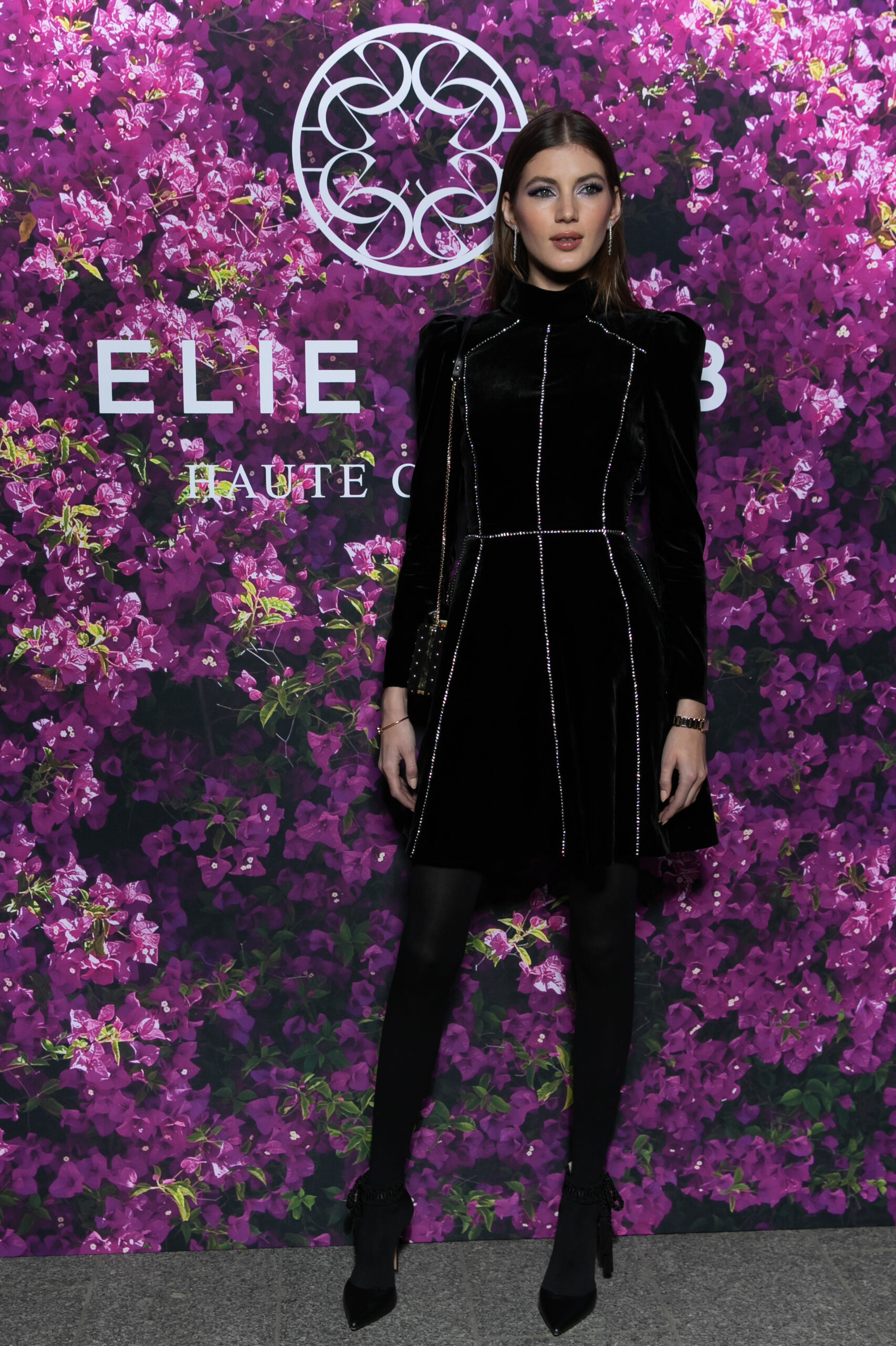 Valery Kaufman portait une robe en velours noir avec des strass de la collection ELIE SAAB Prêt-A-Porter Automne/Hiver 2021-2022.
