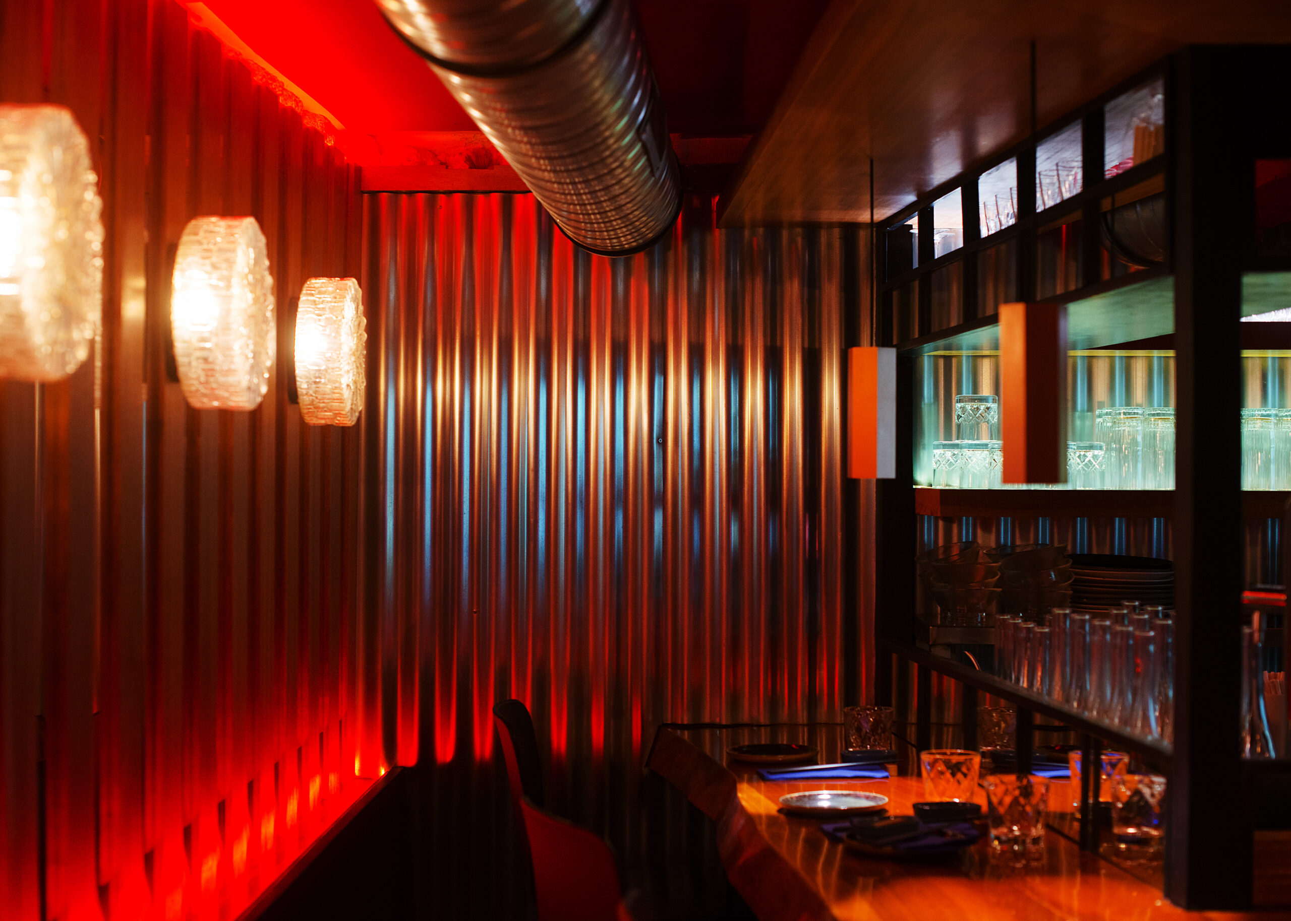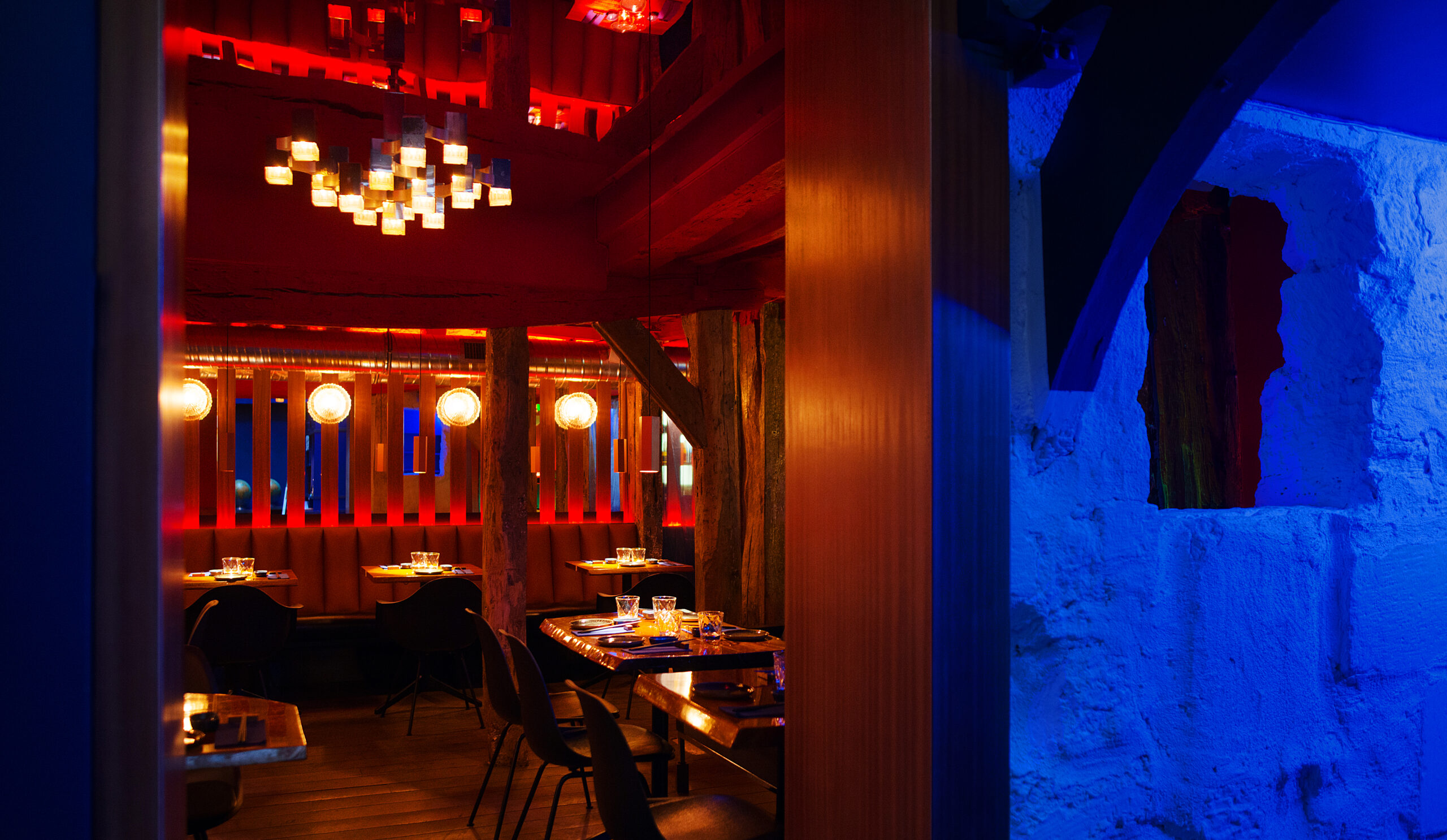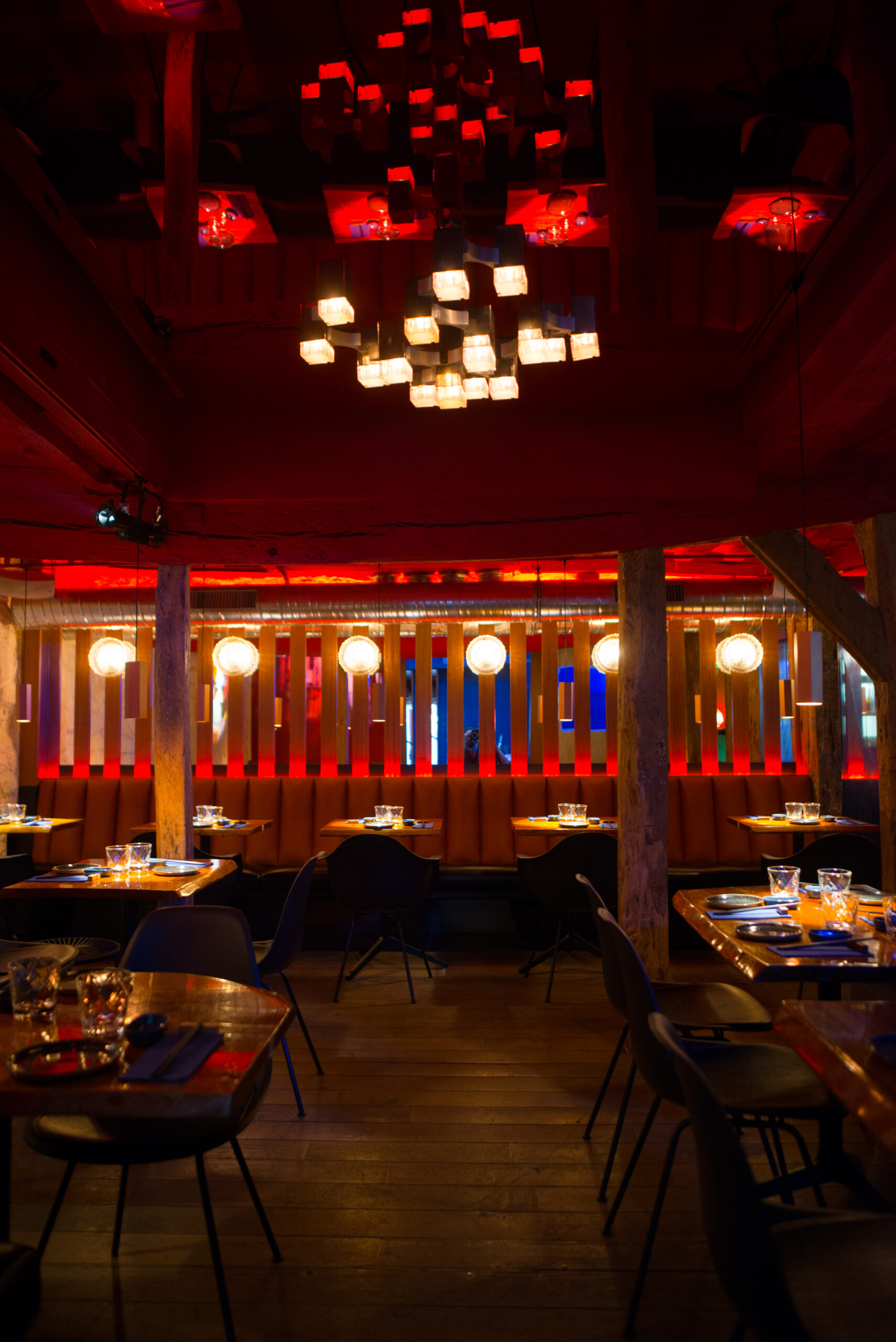 Les habitués noteront ainsi de nouvelles tonalités rouges qui tranchent avec le bleu électrique originel du restaurant, les halos de lumière disséminés sur les murs, les jeux de bois et de miroirs, ou encore le confort des nouvelles assises de cuir.