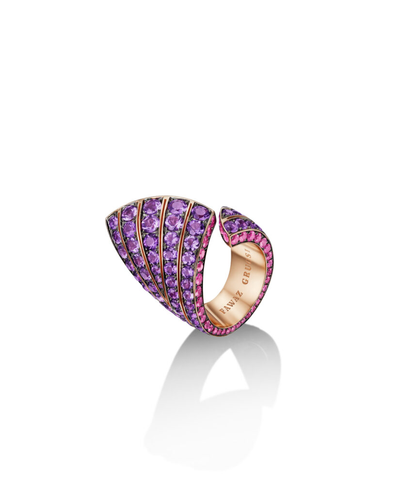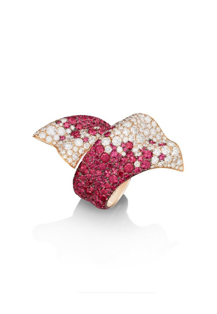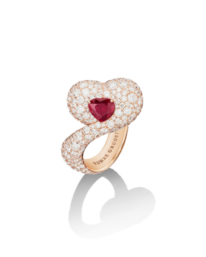 Dans cette bague, le bijou devient une poésie capable d’exprimer des sentiments profonds sans mots. L’imagination débridée rencontre l’expertise artisanale. Des volumes voluptueux prennent vie à travers les lignes précises d’un design élégant. Un poème d’amour est né, pur comme l’or, éblouissant comme un diamant et passionné comme un rubis. FAWAZ GRUOSI a combiné la forme archétypale de l’amour avec le sentiment passionné qui émane d’un exceptionnel rubis non chauffé dans une bague sculpturale. Un bandeau d’or rose serti d’or rose sertie de diamants épouse le doigt et s’élève pour dessiner une forme de cœur généreuse sertie d’un rubis rouge flamboyant taillé en cœur. La bague est une véritable sculpture entièrement réalisée dans l’atelier de FAWAZ GRUOSI à Genève.Le séduisant dessin à deux dimensions réalisées à la gouache a été traduit en un modèle de cire tridimensionnel afin de résoudre tous les défis techniques avant d’être confié aux mains expertes d’un maître joaillier qui a réalisé une sculpture miniature et un chef-d’œuvre de joaillerie. Existe-t-il un symbole d’amour plus universel qu’un cœur ? Existe-t-il une pierre qui déclare la passion plus ouvertement qu’un rubis ? Cette bague de haute joaillerie de FAWAZ GRUOSI en rubis en forme de cœur est la déclaration d’amour ultime.