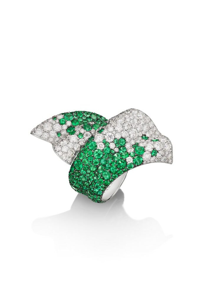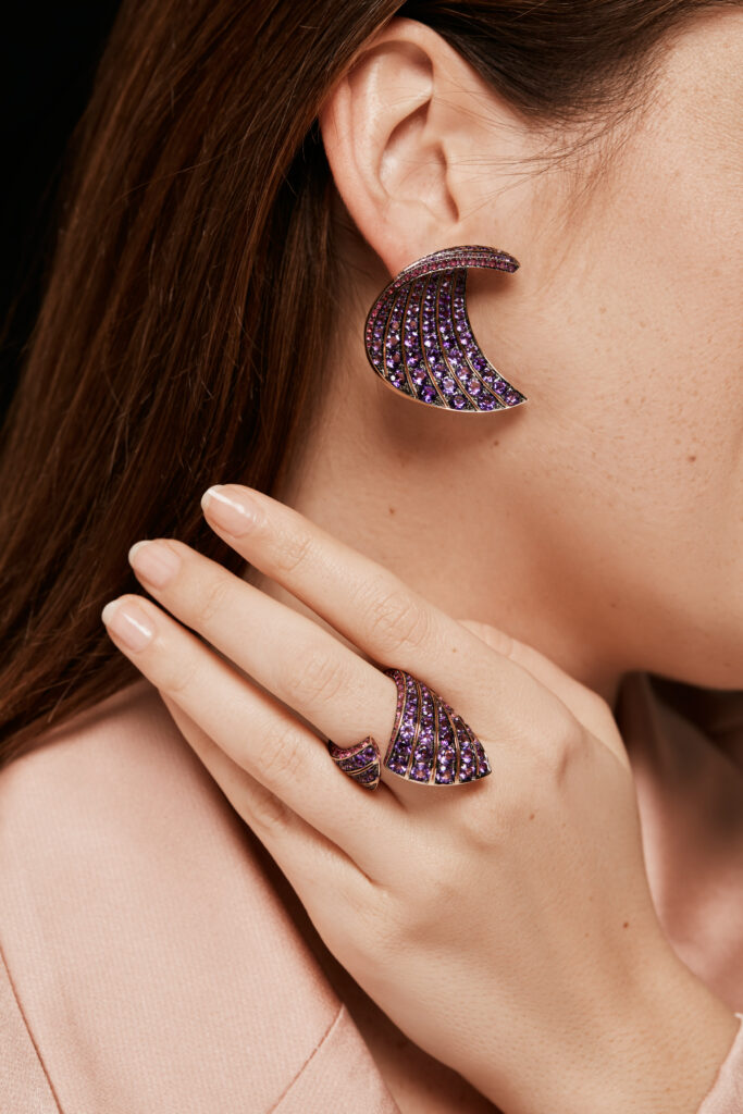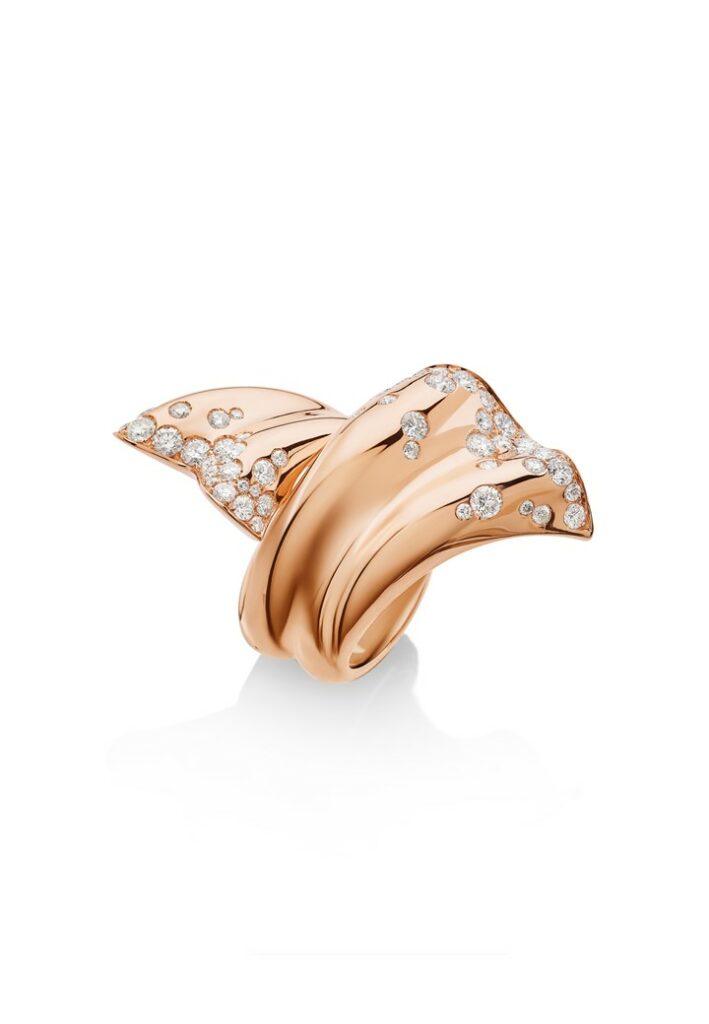 Les rubans aux couleurs vives hypnotisent lorsqu’ils ondulent et tourbillonnent à l’ouverture des cadeaux. Ils peuvent également évoquer une tendre étreinte, un rappel du geste le plus simple, qui nous remplit du sentiment chaleureux d’être aimé. Ribbon comprend des boucles d’oreilles et des bagues qui jouent toutes sur le motif du ruban. Un mélange de pierres précieuses insuffle de nouvelles saveurs dans les contours de la forme originale et réalise des textures inattendues…
