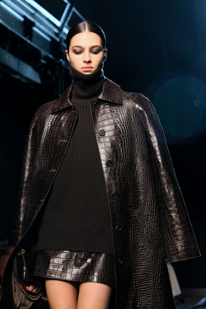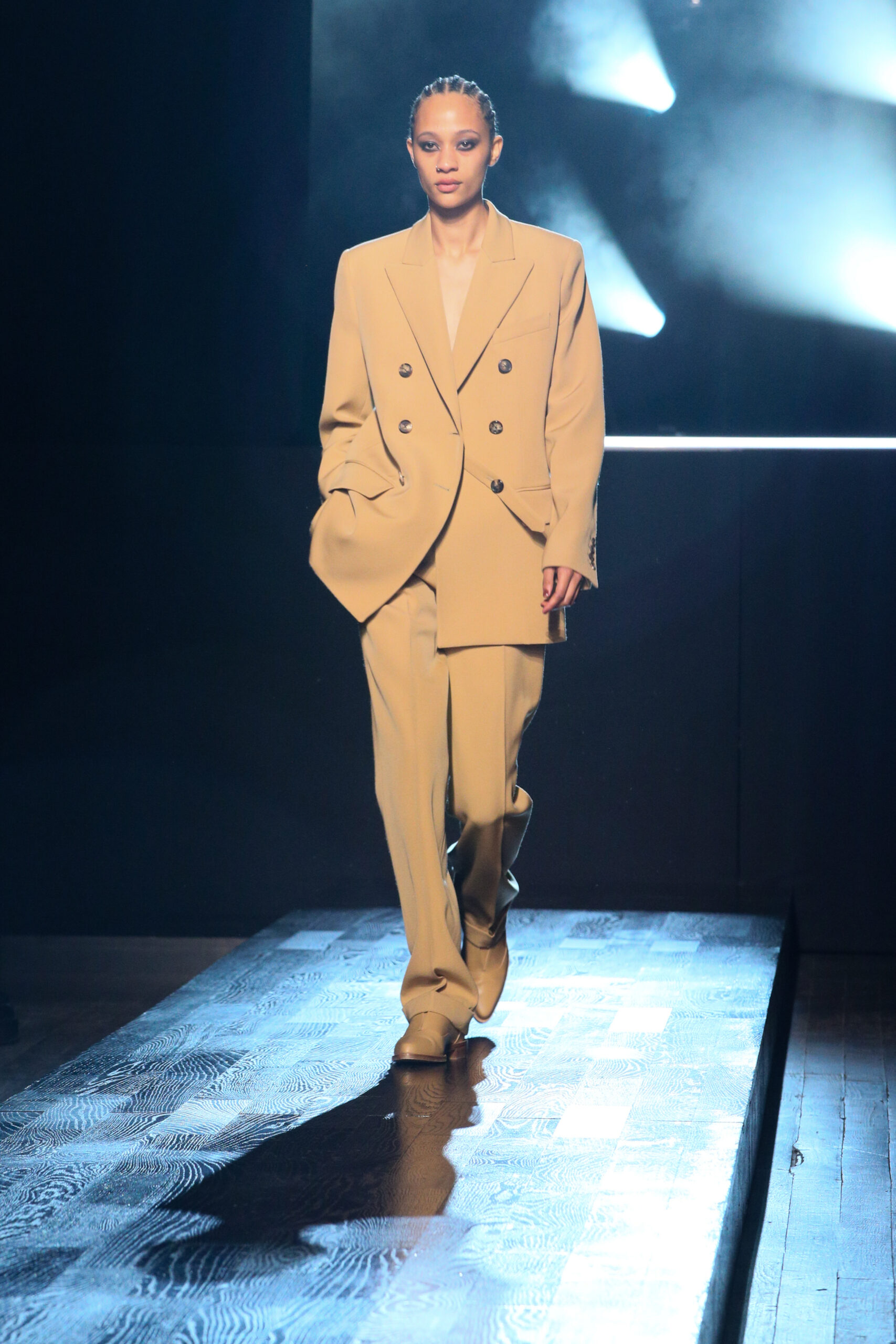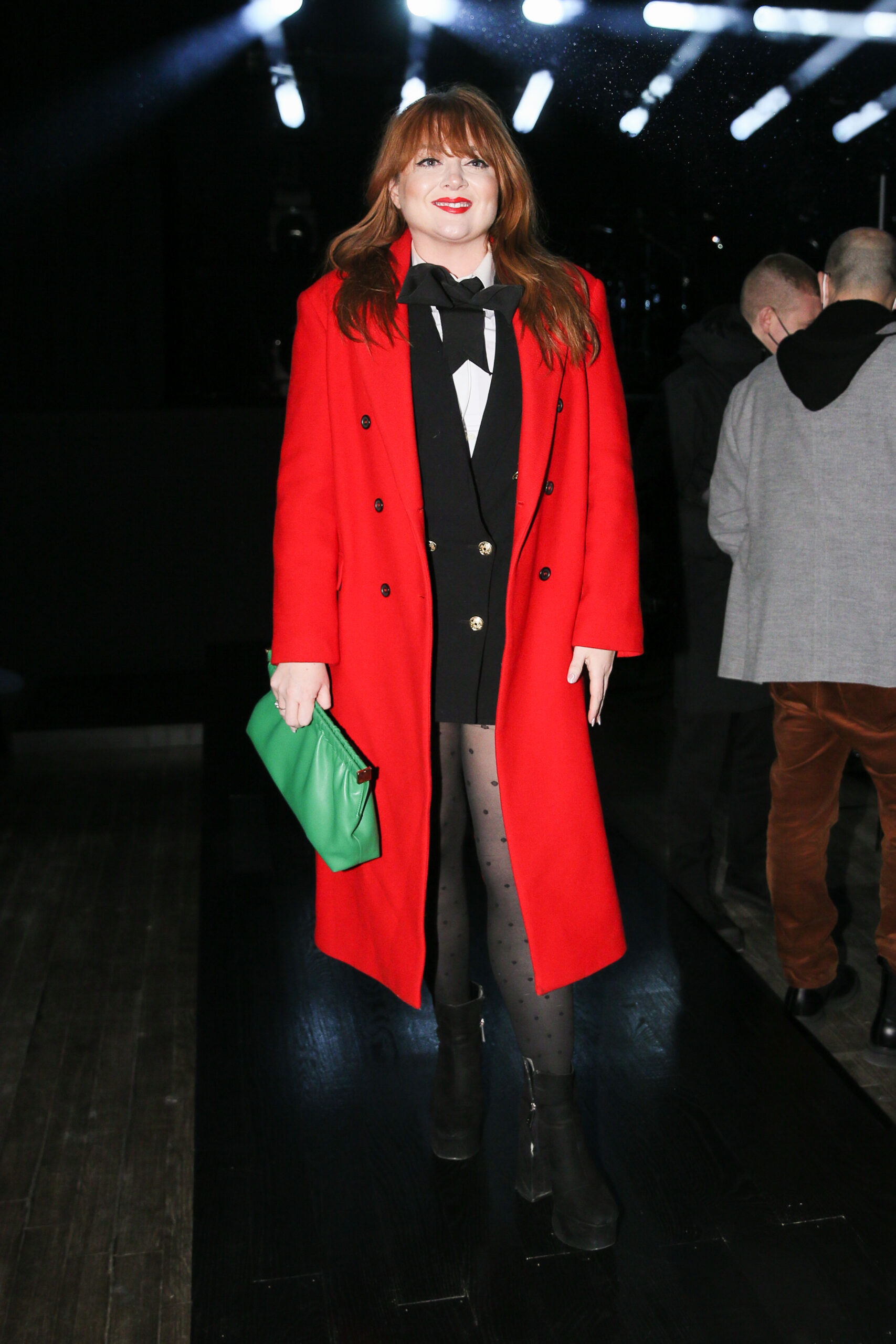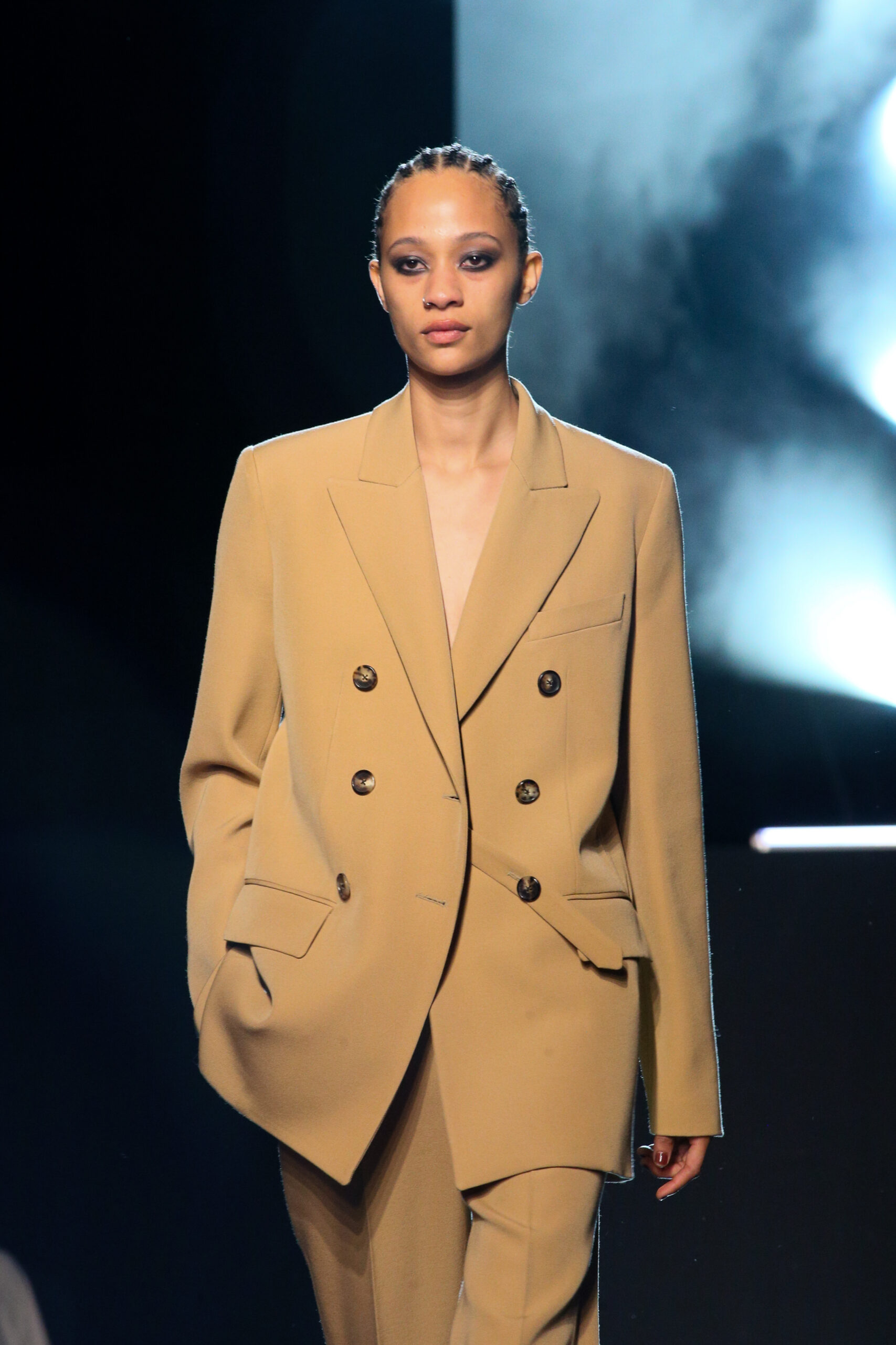 Luisa Ranieri wore a black double crepe sablé jacket and matching trousers, both from the Spring/Summer 2022 Michael Kors Collection, with a Beekman leather clutch from Michael Kors Collection.