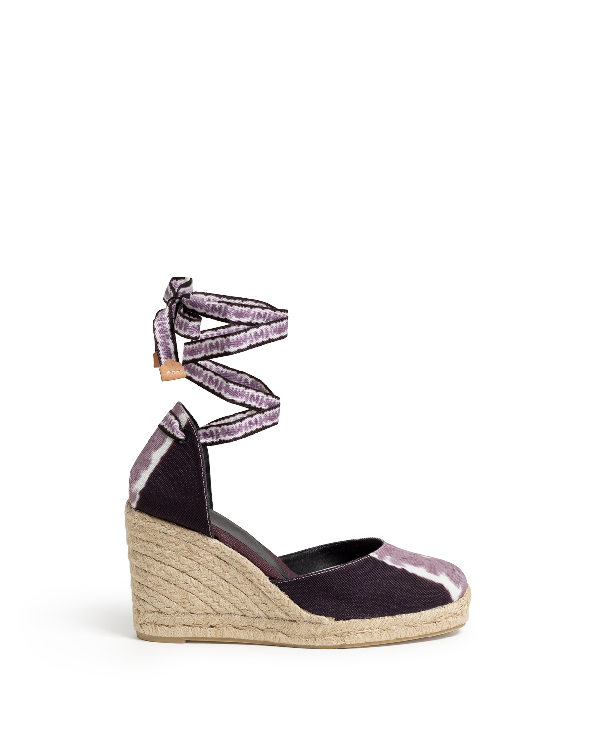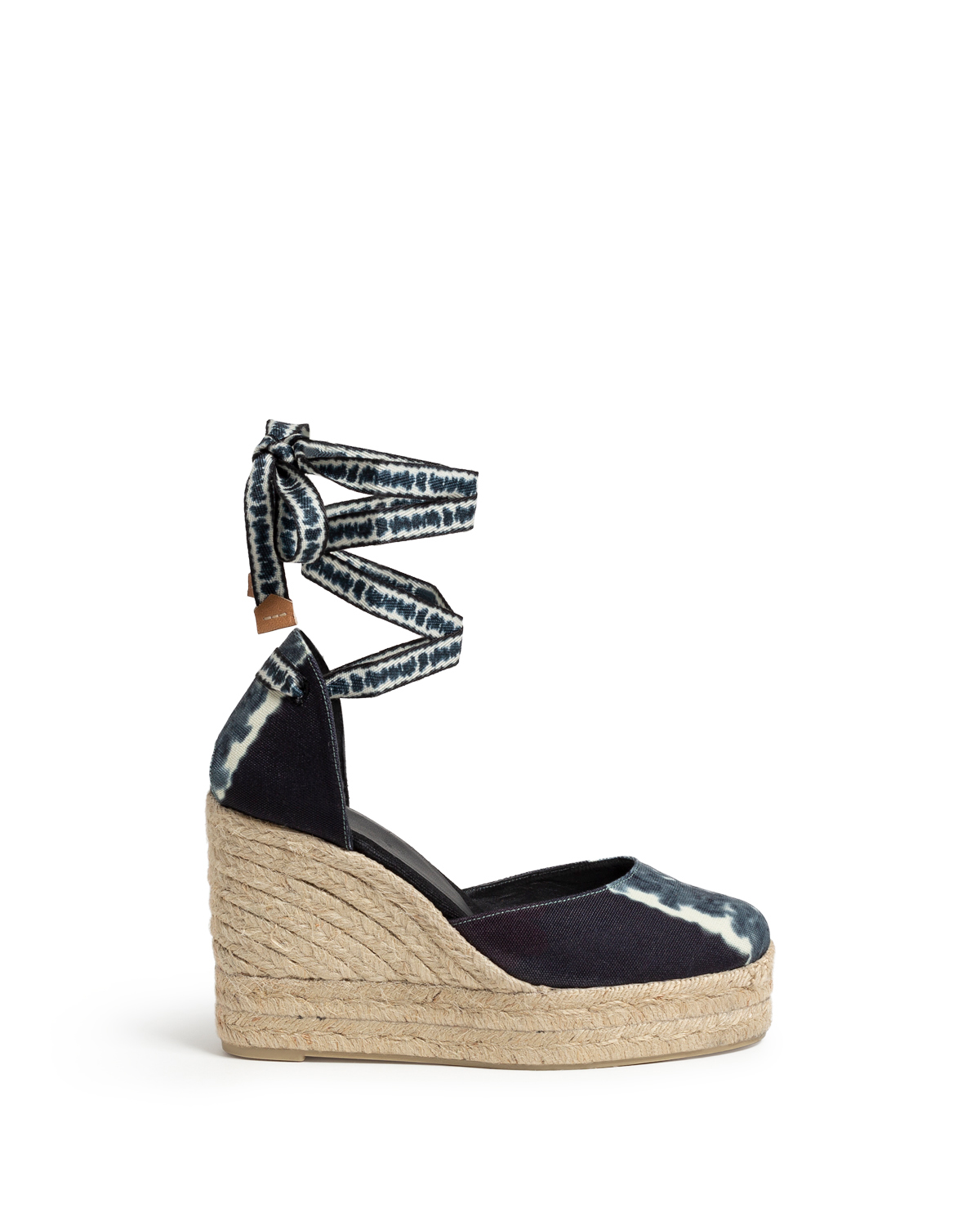 Le modèle iconique Carina se pare d’un imprimé Tie and Dye en toile. Des formes irrégulières de bleus et de mauves imprimées sur la toile, présentant de belles imperfections du motif délavé sur le noir et blanc et sur le ton naturel du jute