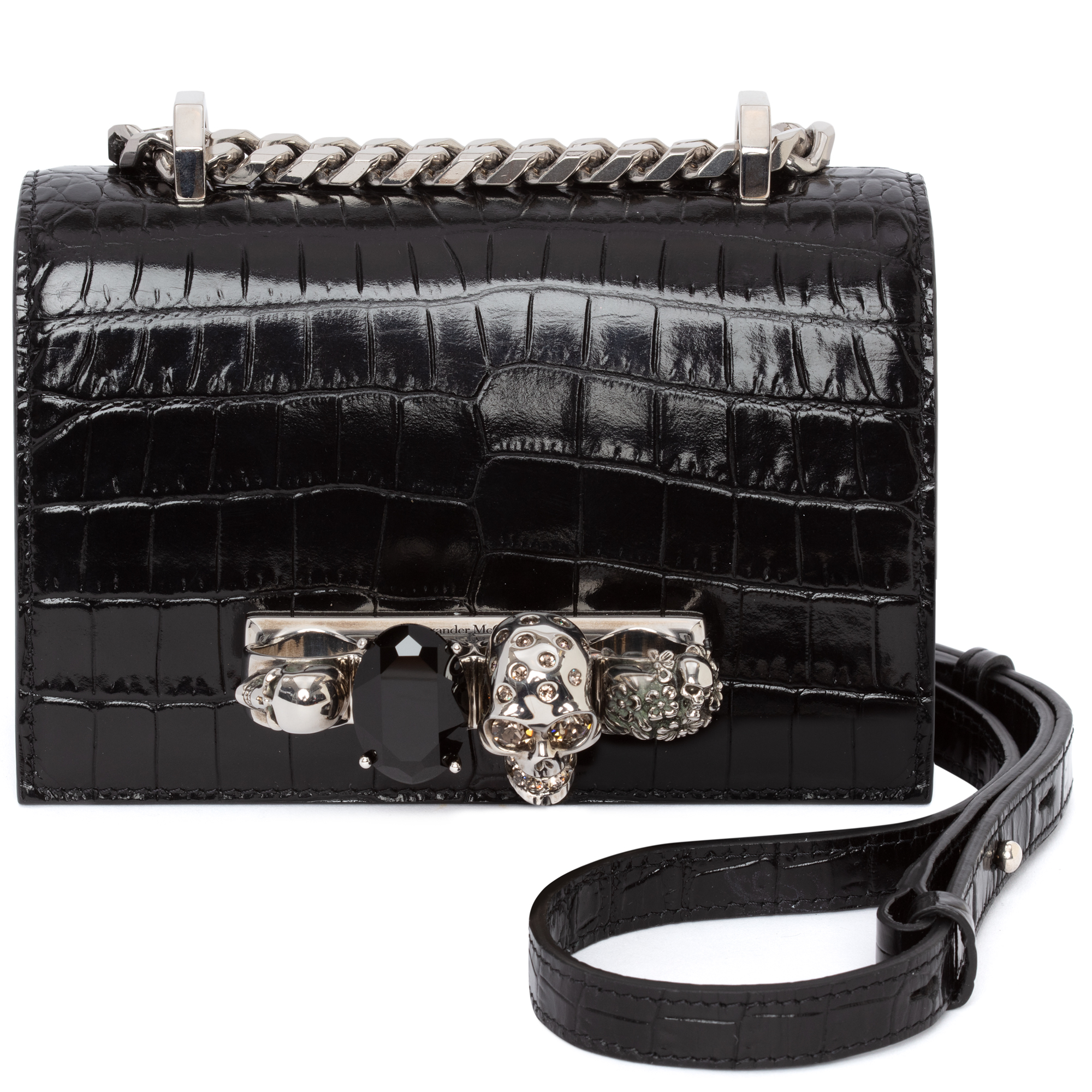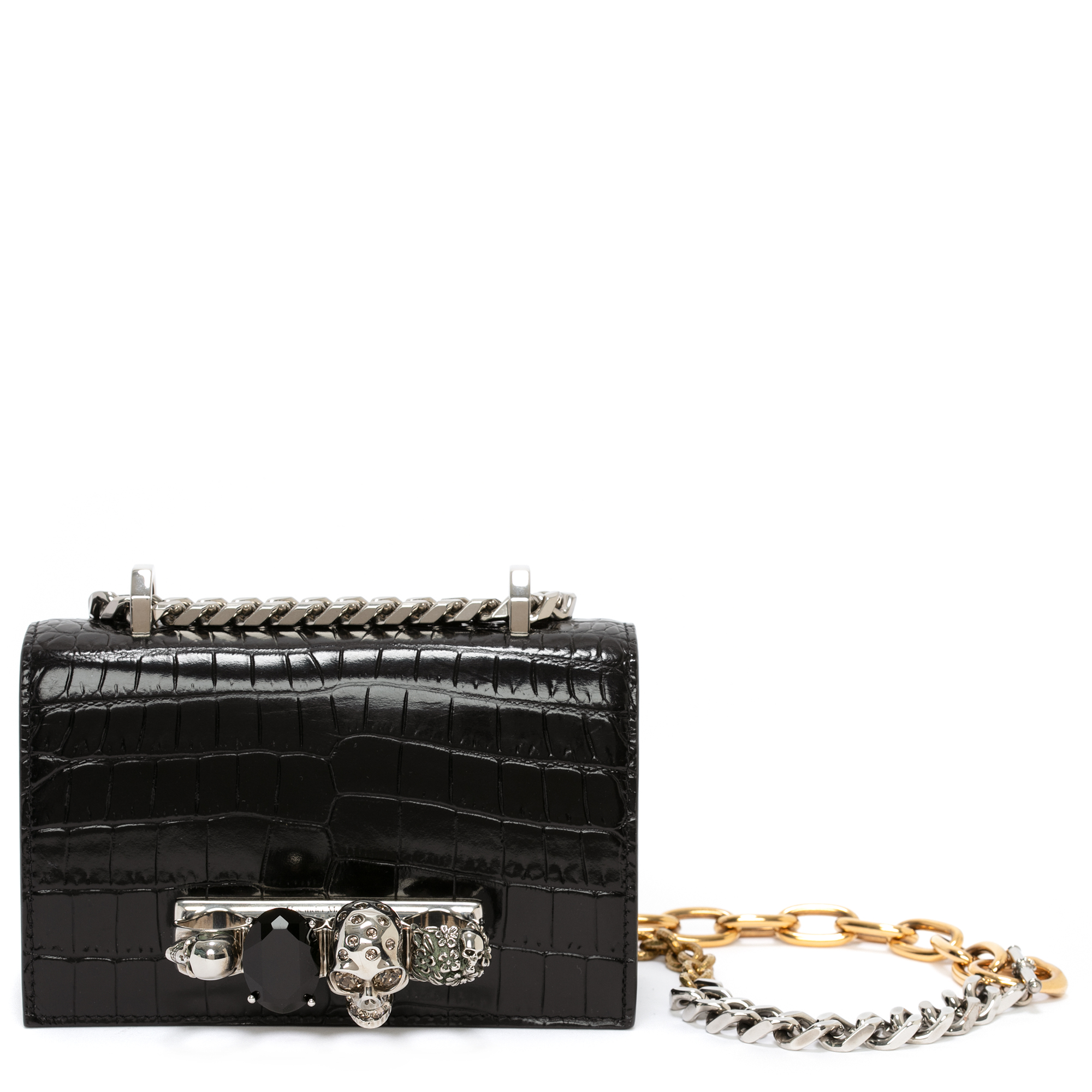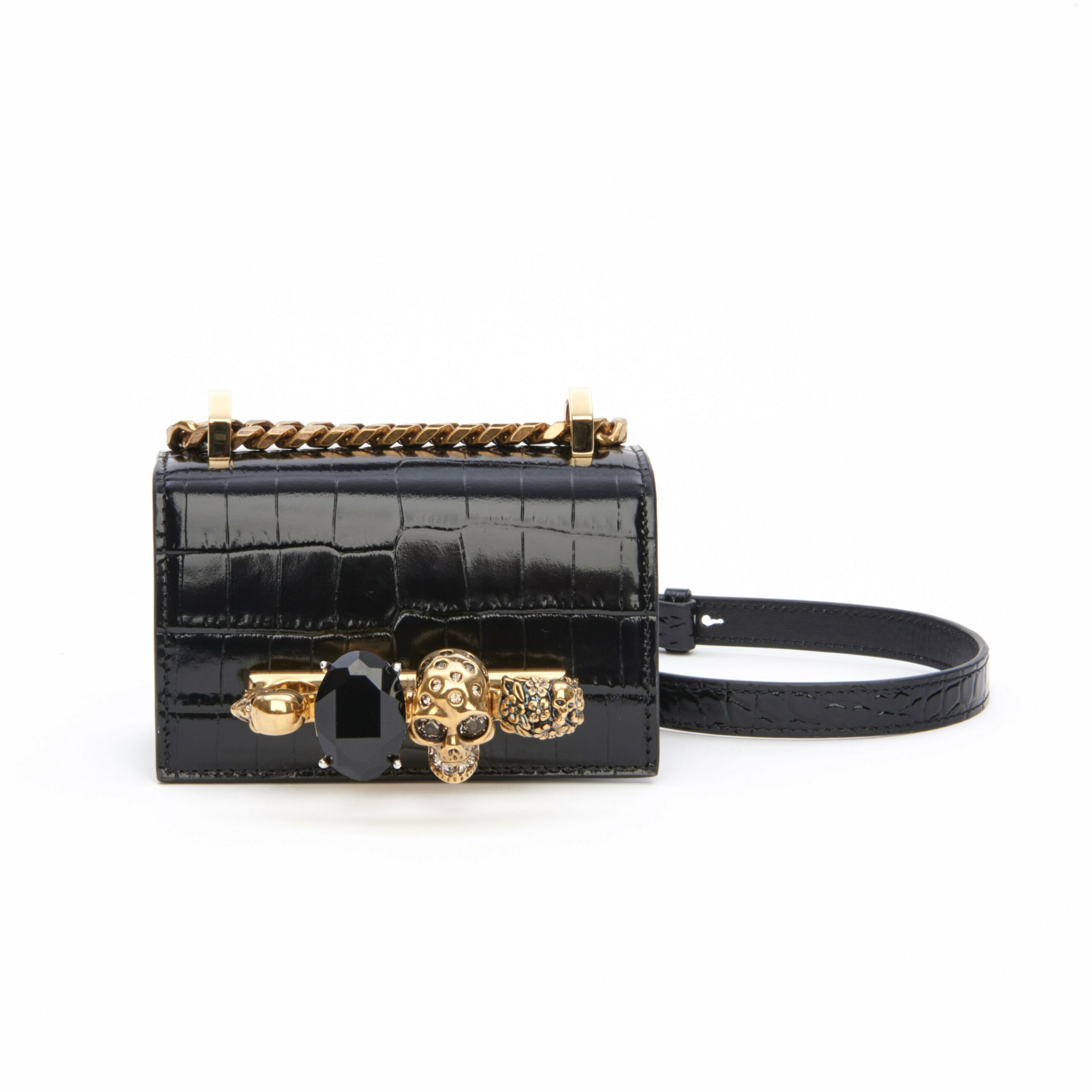 Tout au long, elle porte l’itération croco en relief noir brillant de le Jeweled Satchel qui arbore sa fermeture à quatre anneaux en métal argenté et un crâne emblématique incrusté de cristaux.
