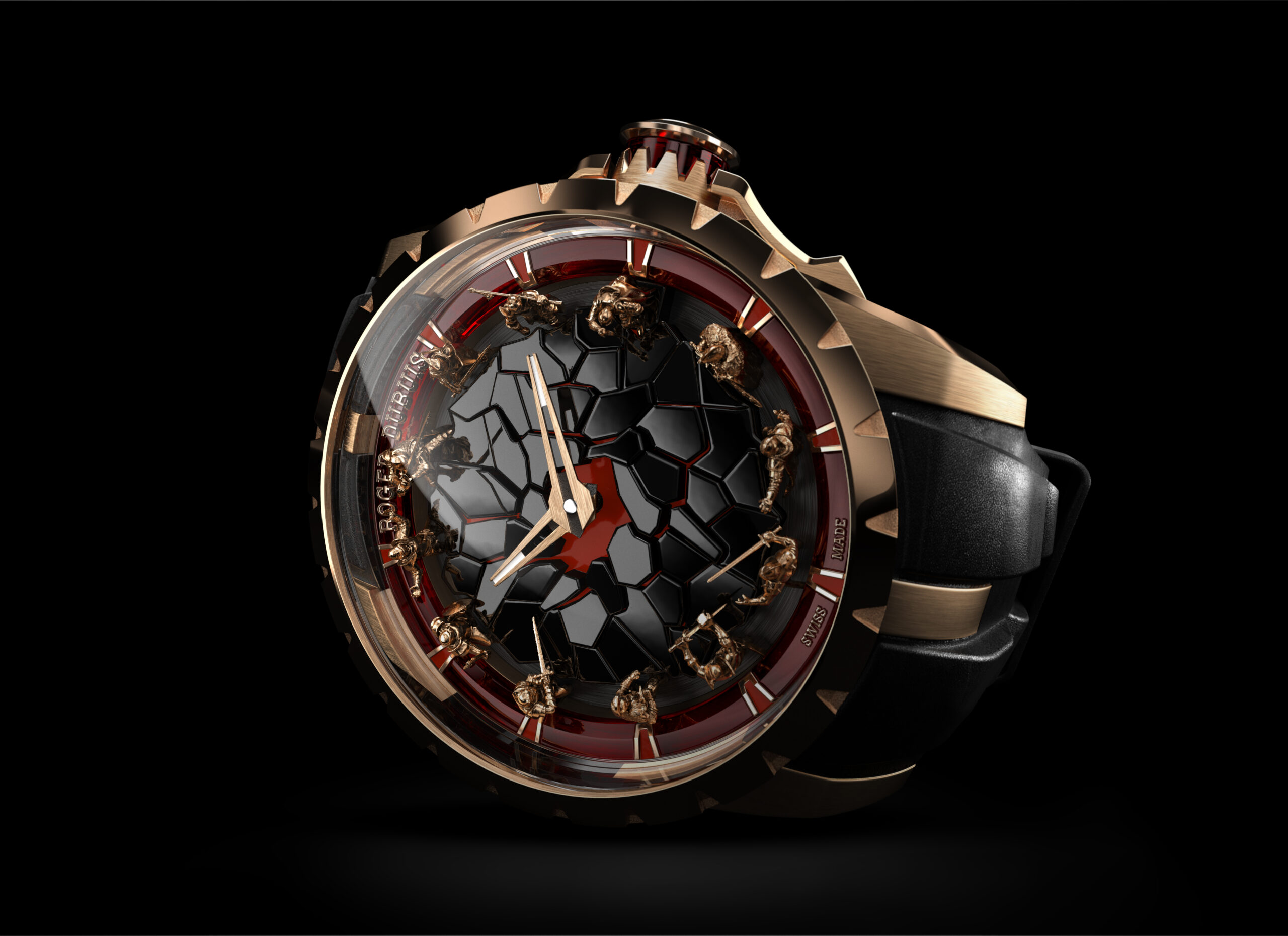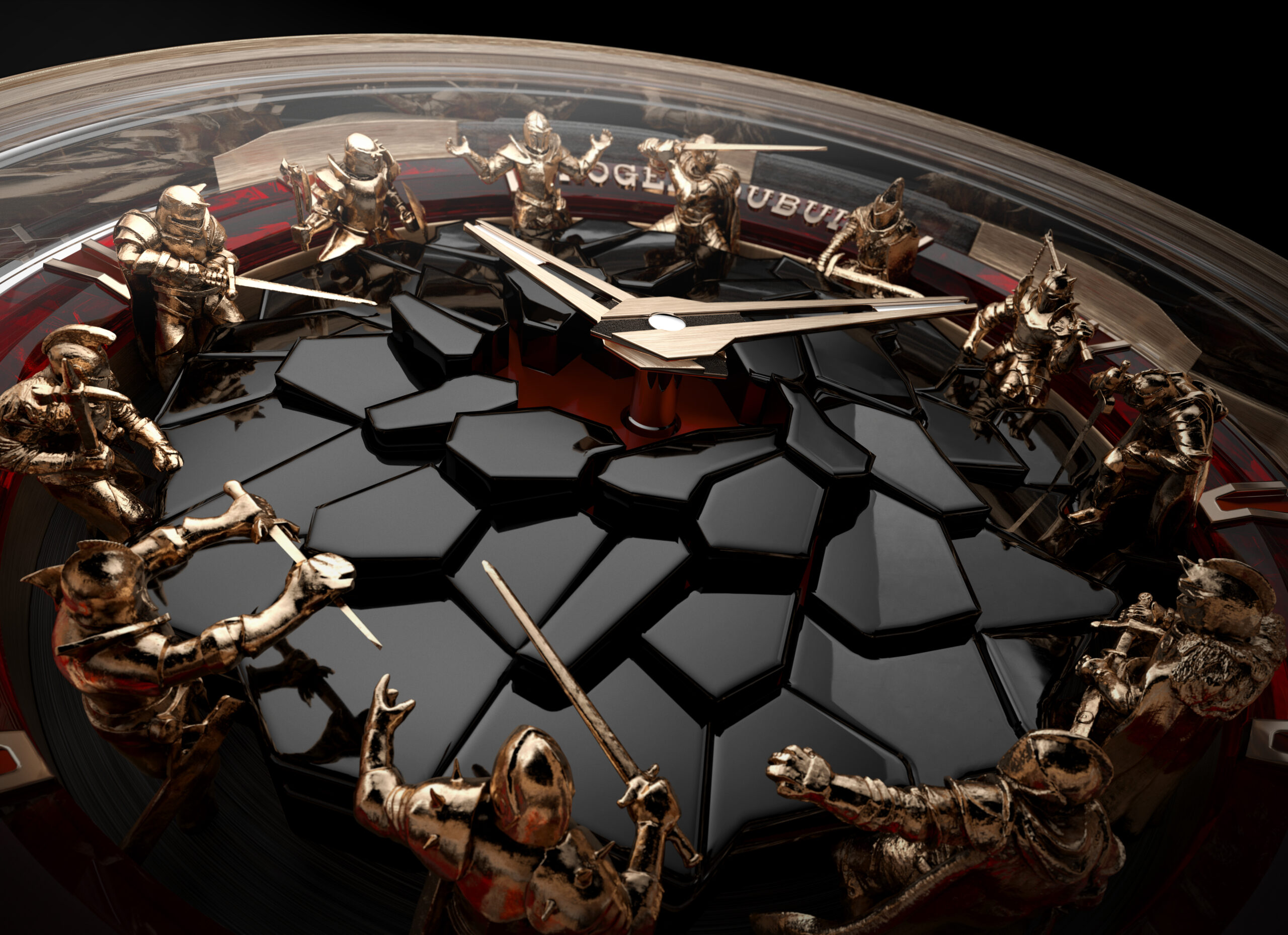 Donnant vie à une légende de la manière la plus exaltante qui soit, douze chevaliers-index horaires moulés dans l’or rose 18 carats 750/1 000 ont été façonnés pour sembler en mouvement tout en conservant leur pose unique. Il s’agit là d’une véritable prouesse d’artisanat hyperexpressif qui a demandé un an et demi de réalisation. Par l’art complexe de la micro-sculpture, les maitres horlogers ont doté chaque personnage d’une armure médiévale, d’un plastron, d’un bouclier et d’un casque, ainsi que d’armes sur mesure prêtes à vaincre tout ce qui peut jaillir de dessous ses pieds. Ce champ de bataille fracturé a nécessité l’assemblage manuel de chaque pièce d’un véritable puzzle de verre. En réalisant des détails d’une telle complexité, Roger Dubuis prouve une fois de plus son excellence dans les métiers d’art. Un honneur – comme celui des chevaliers – réservé à une poignée de privilégiés, toutes ères confondues.