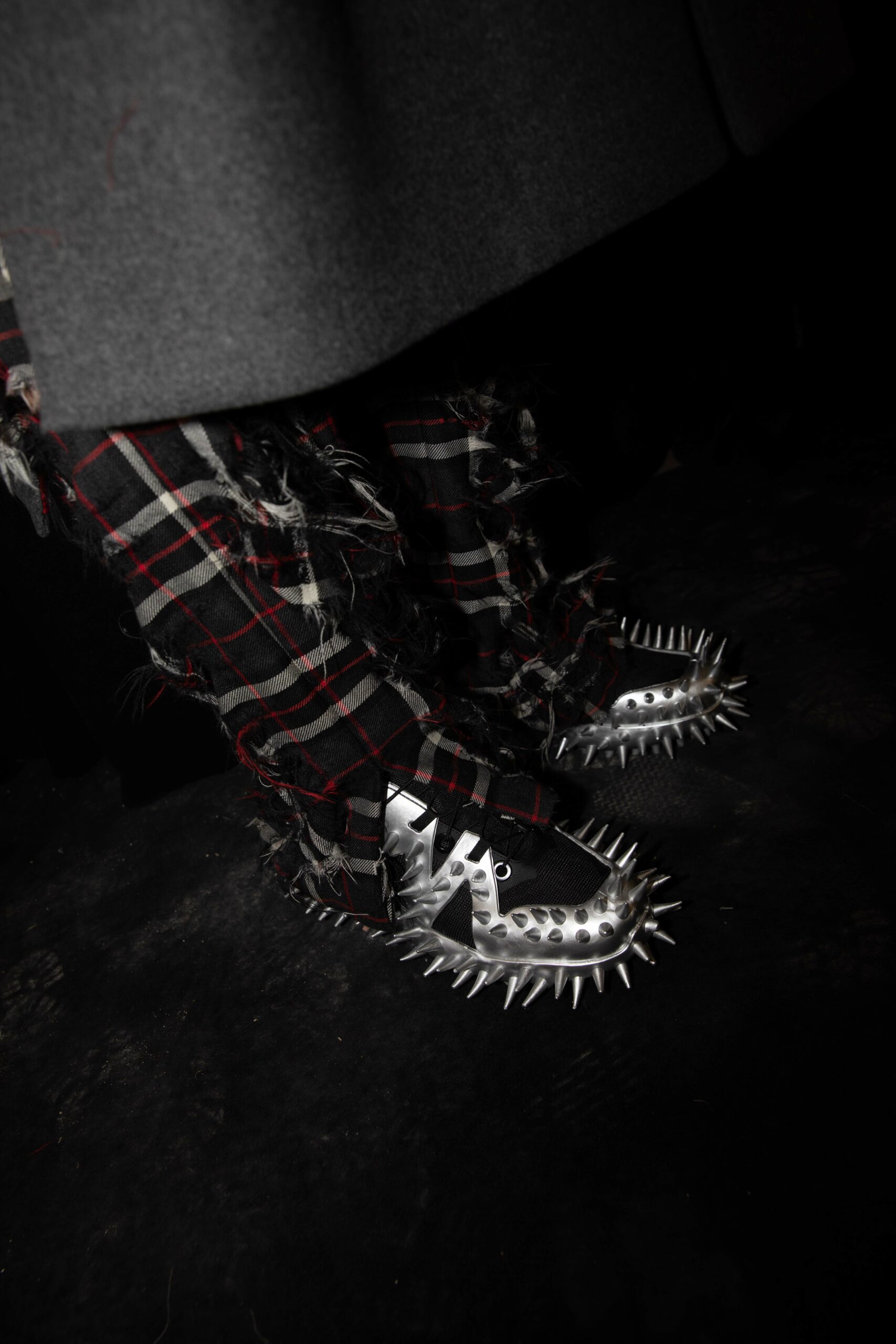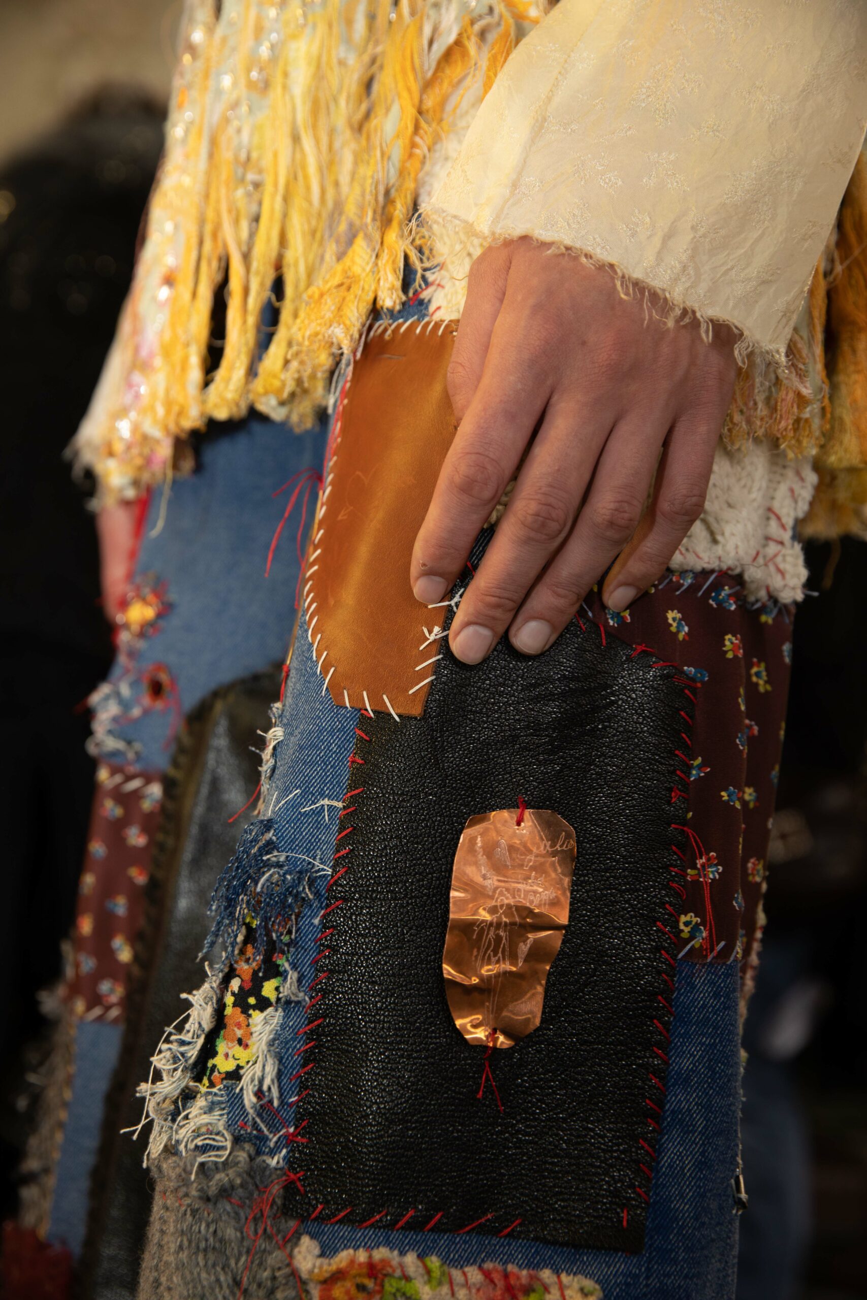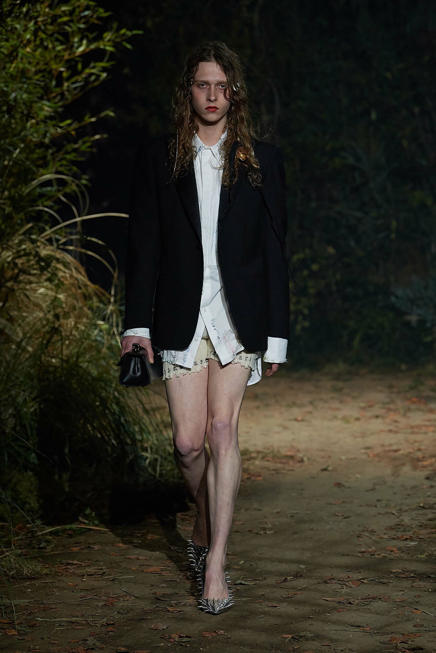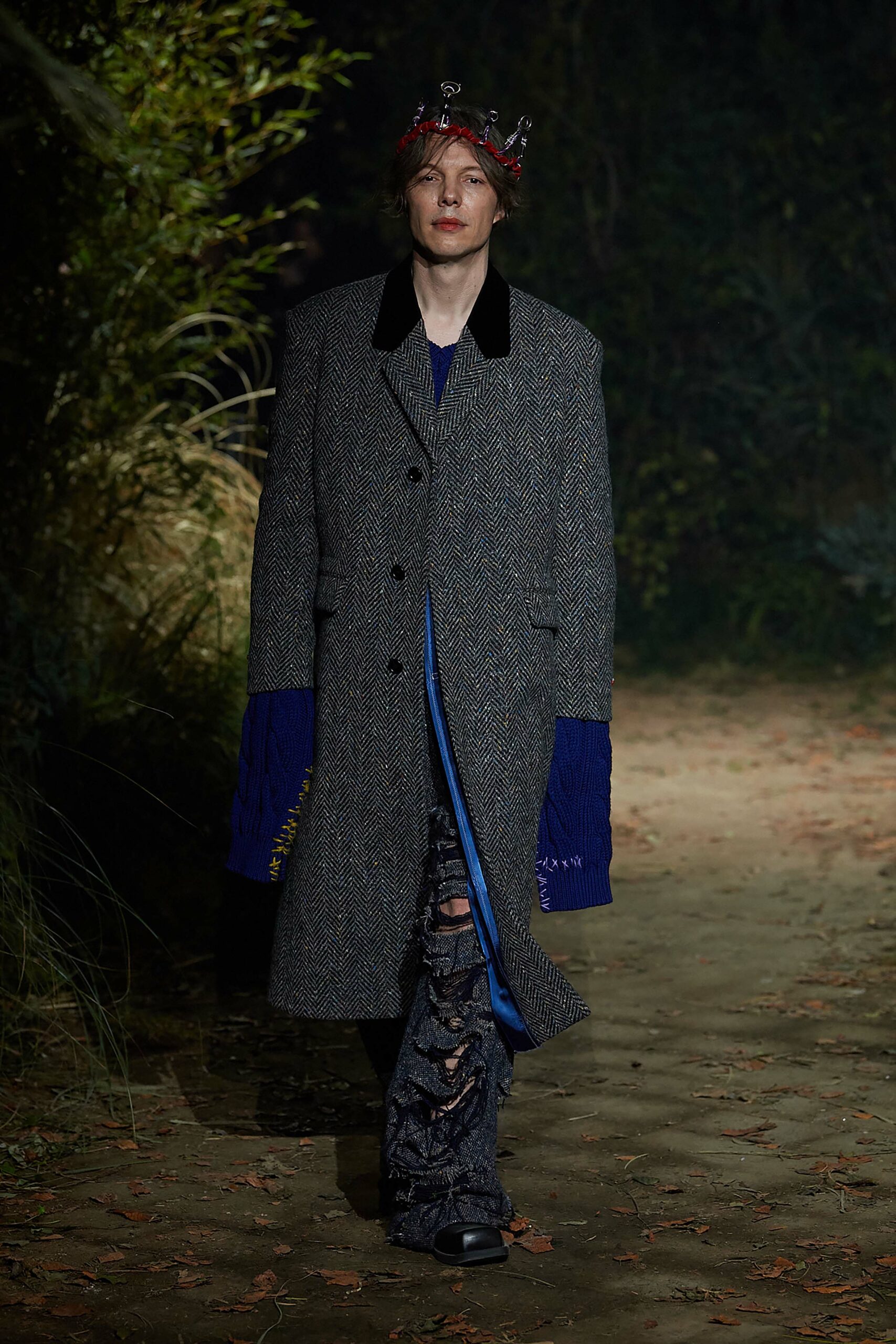 Big coats, big crombies, big jackets. Shrunken jackets. Shredded dresses, shredded shirts, shredded trousers. Mended jumpers, outsized jumpers, jumpers with sleeves dangling to the floor. Trousers falling off. Sartorial suits are completely handmade by Attolini, capturing the emotion of tradition in the touch of the hand, defying mechanical reproduction. Like spectrograms, the words of Dan Colen and Lexie Smith bring a secret code within mending. Mending and stitching everywhere, making old things new, keeping them together with a gesture of affection. Spiky pumps, spiky boots, spiky bags.